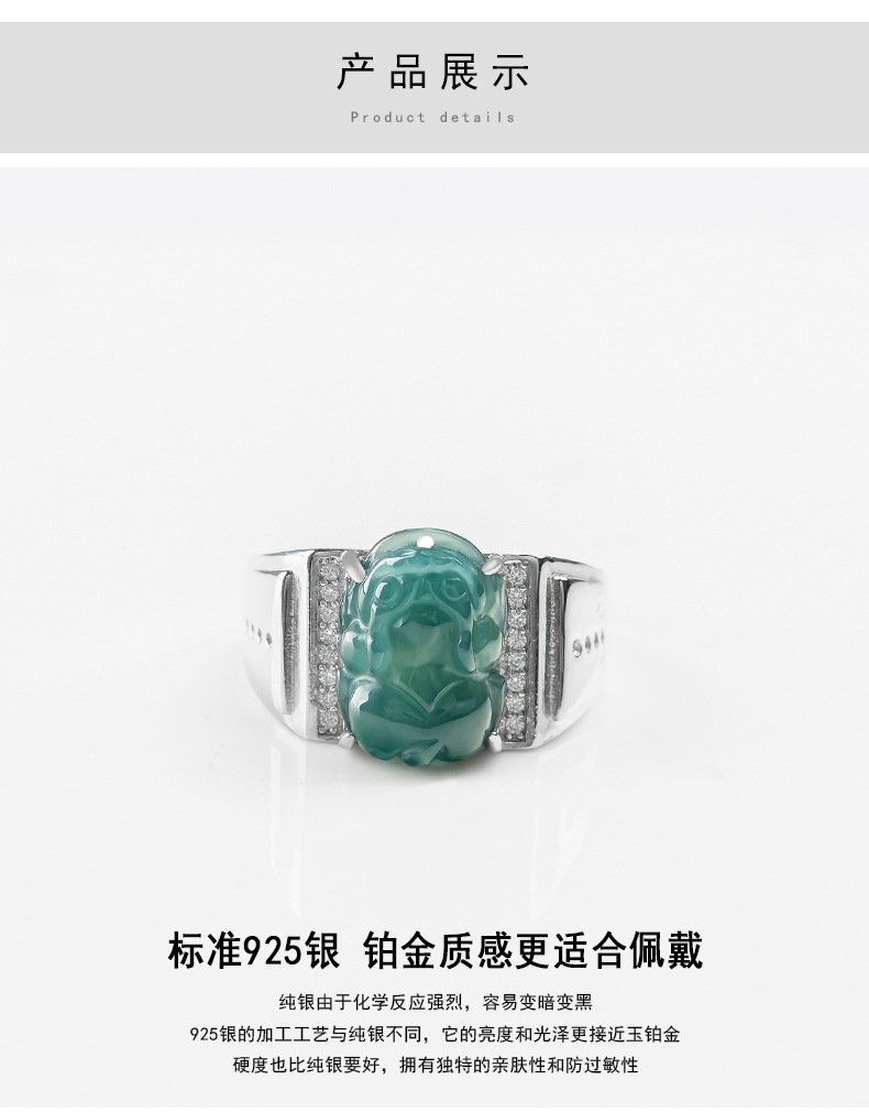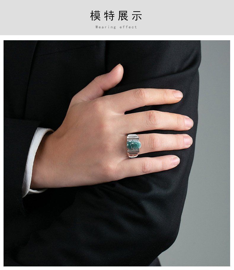 Pixiu 반지 실버 상감 에메랄드 반지 행운의 안장 반지 옥 패션 중형 검지 손가락 남성 반지 조정 가능