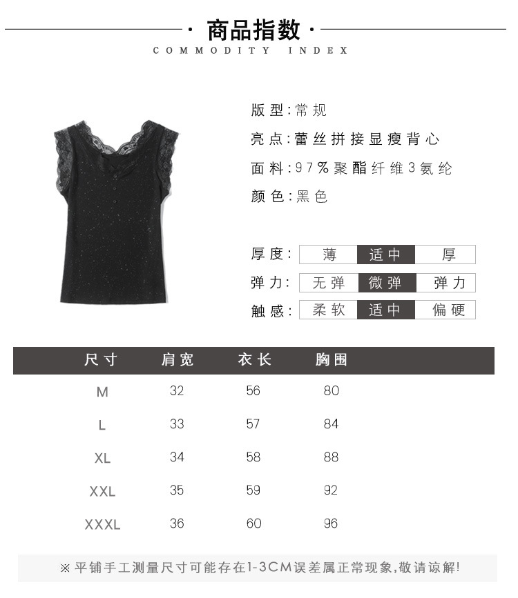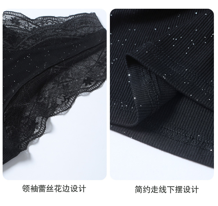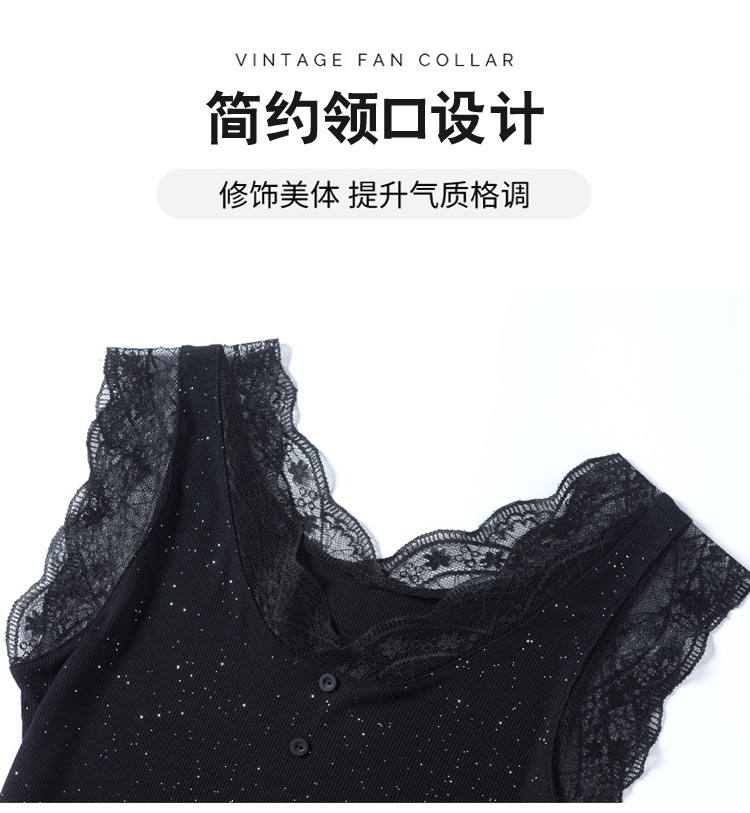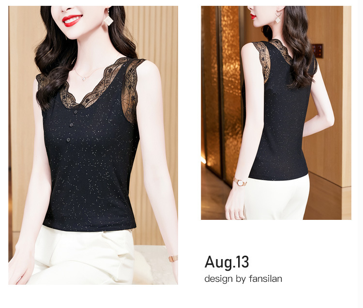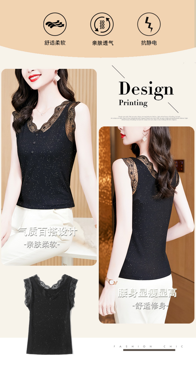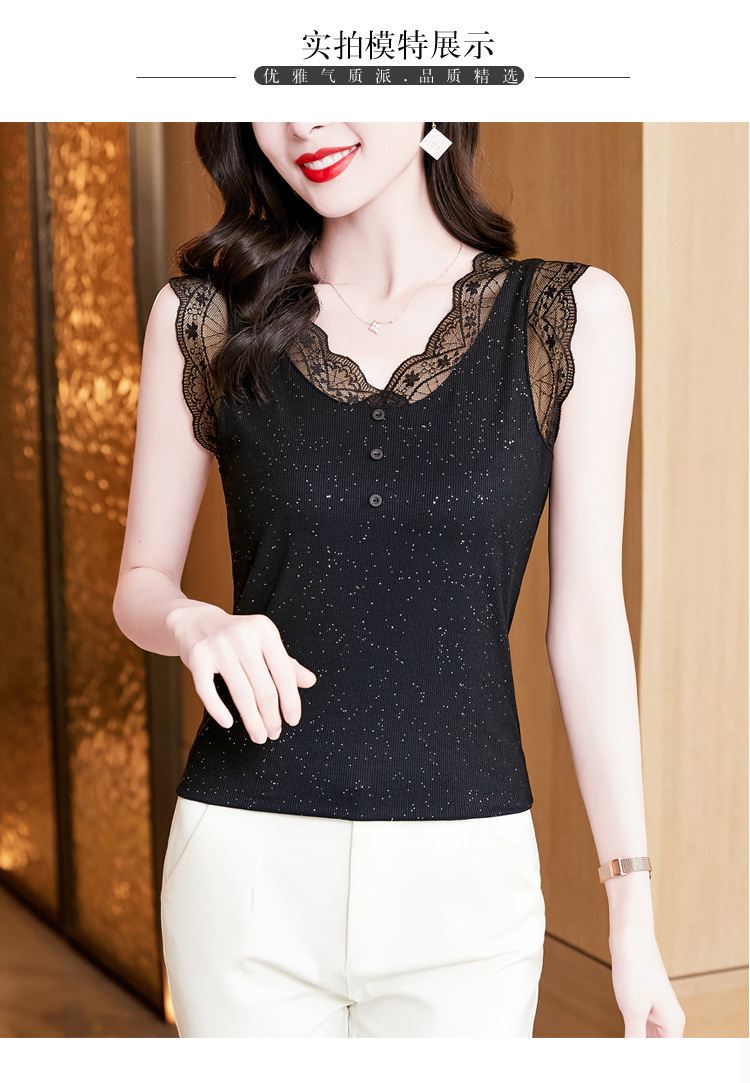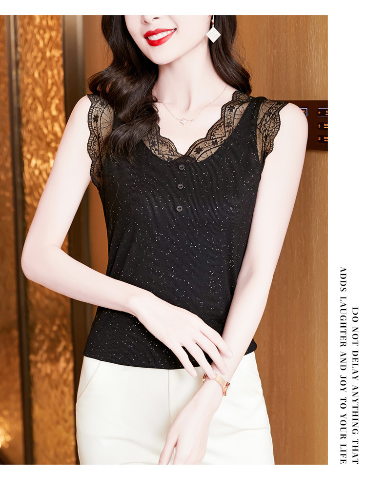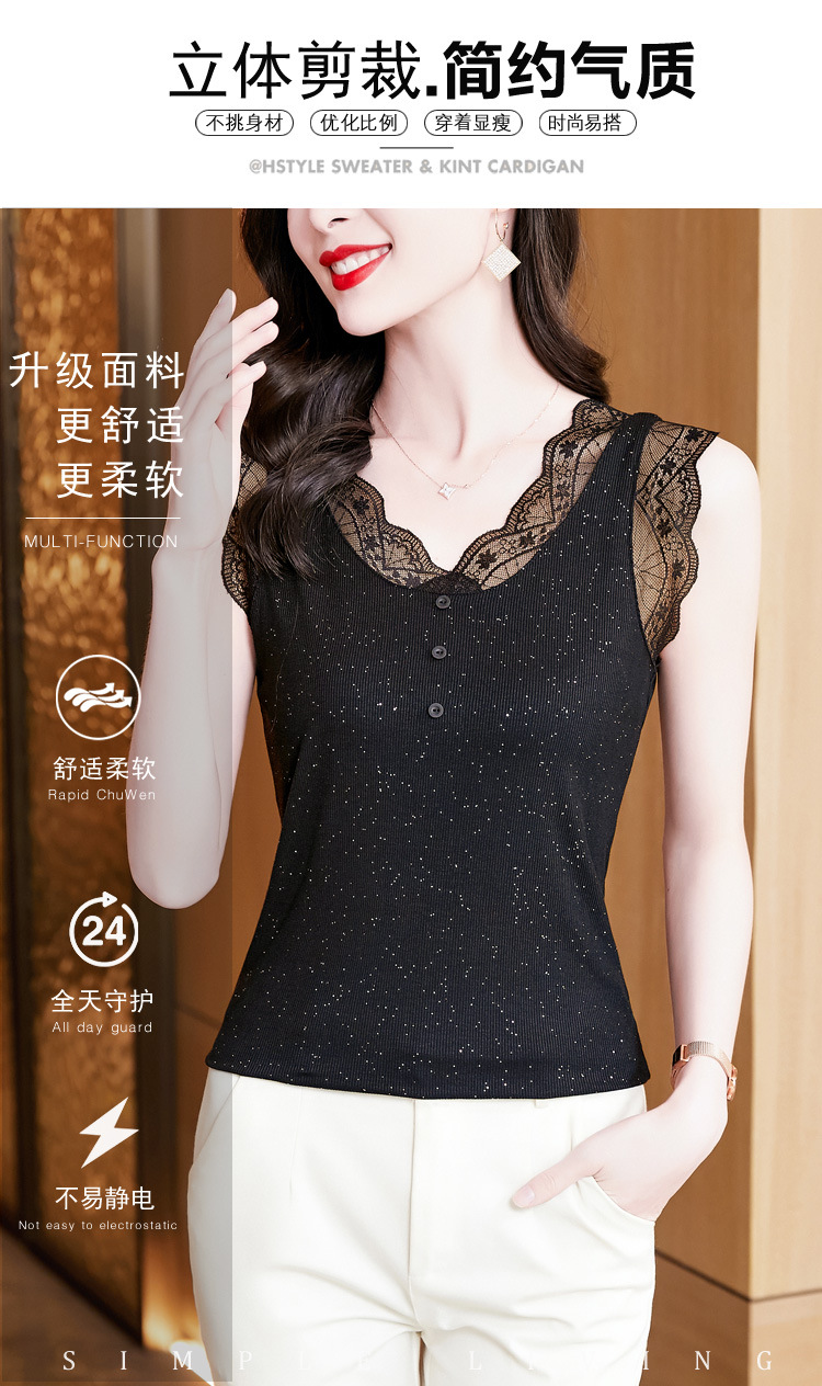 2023 여름 새로운 패션 조커 슬림 블랙 밝은 실크 V-넥 레이스 스티치 니트 조끼 여성 도매스토어 가기