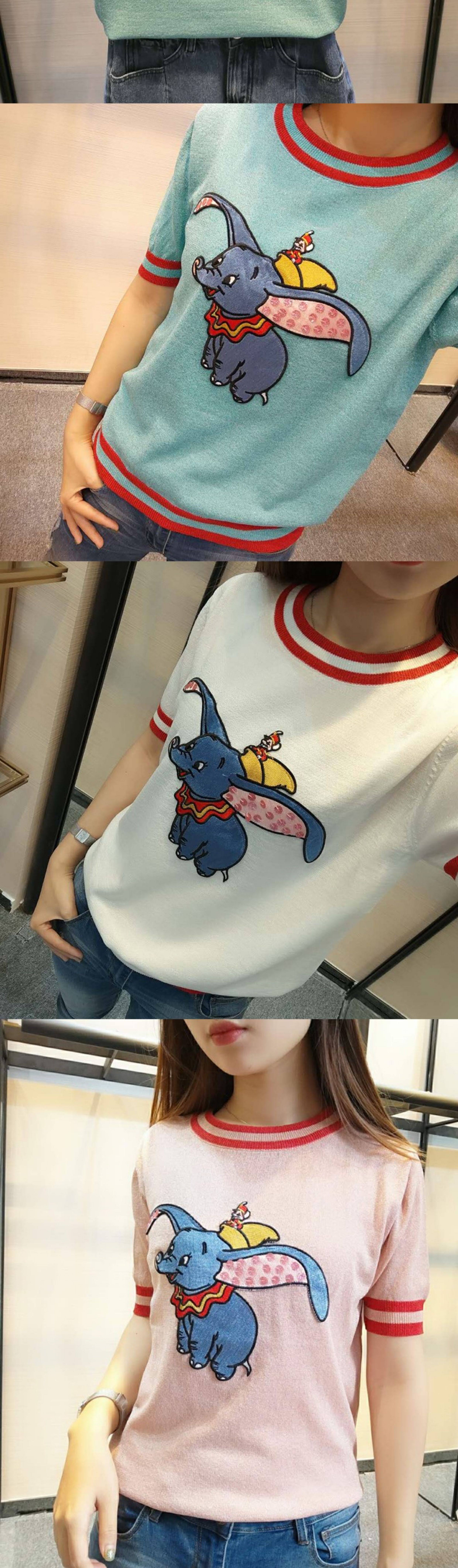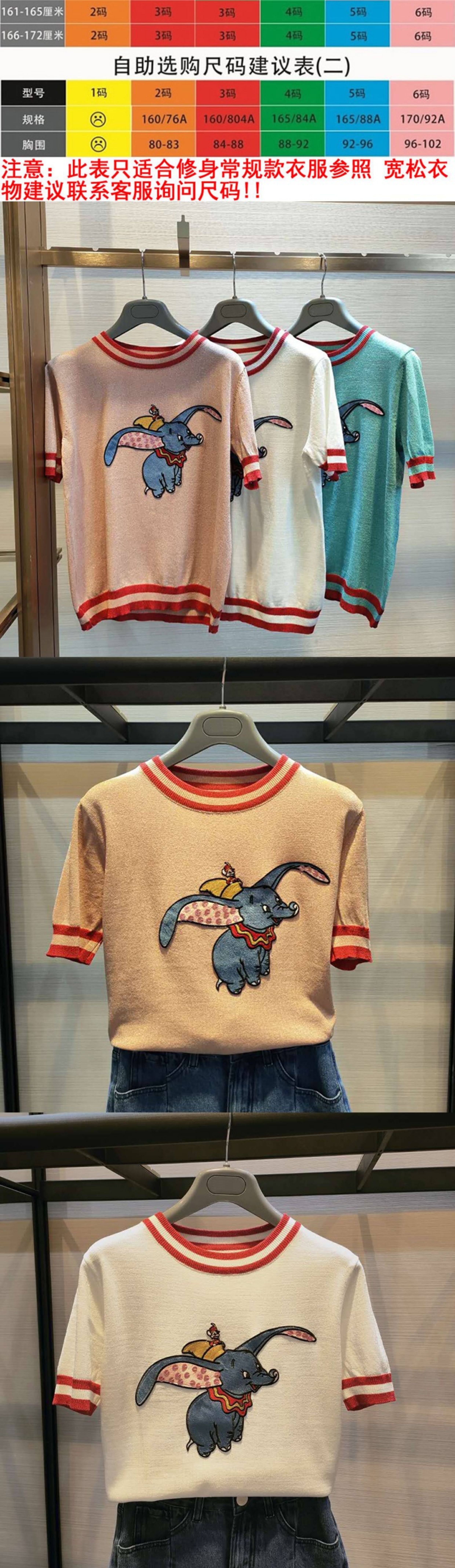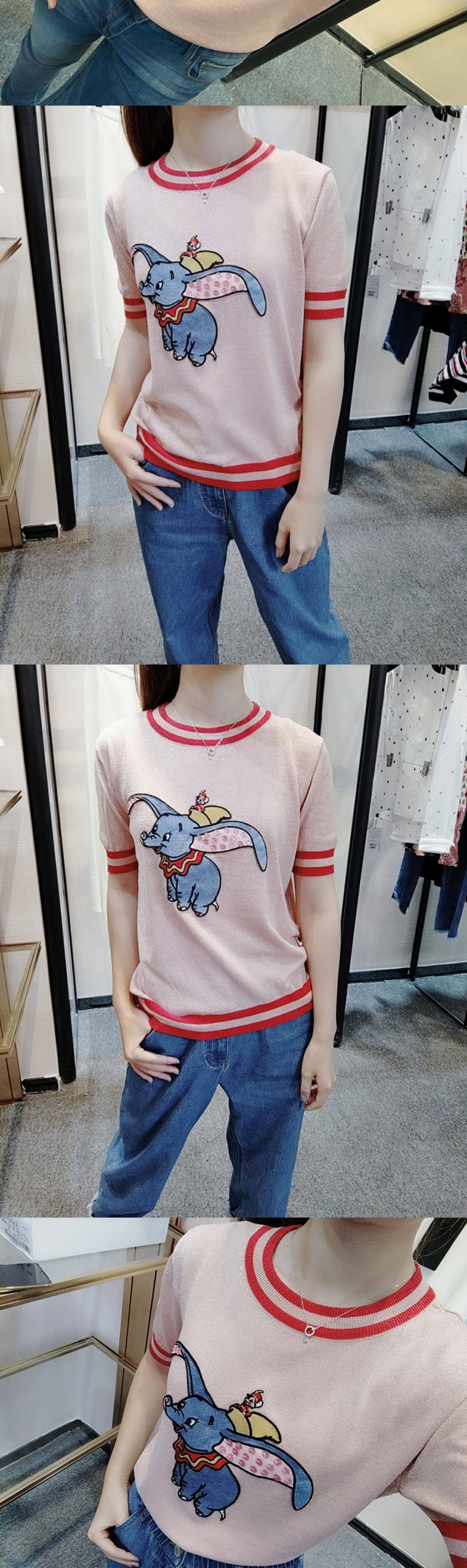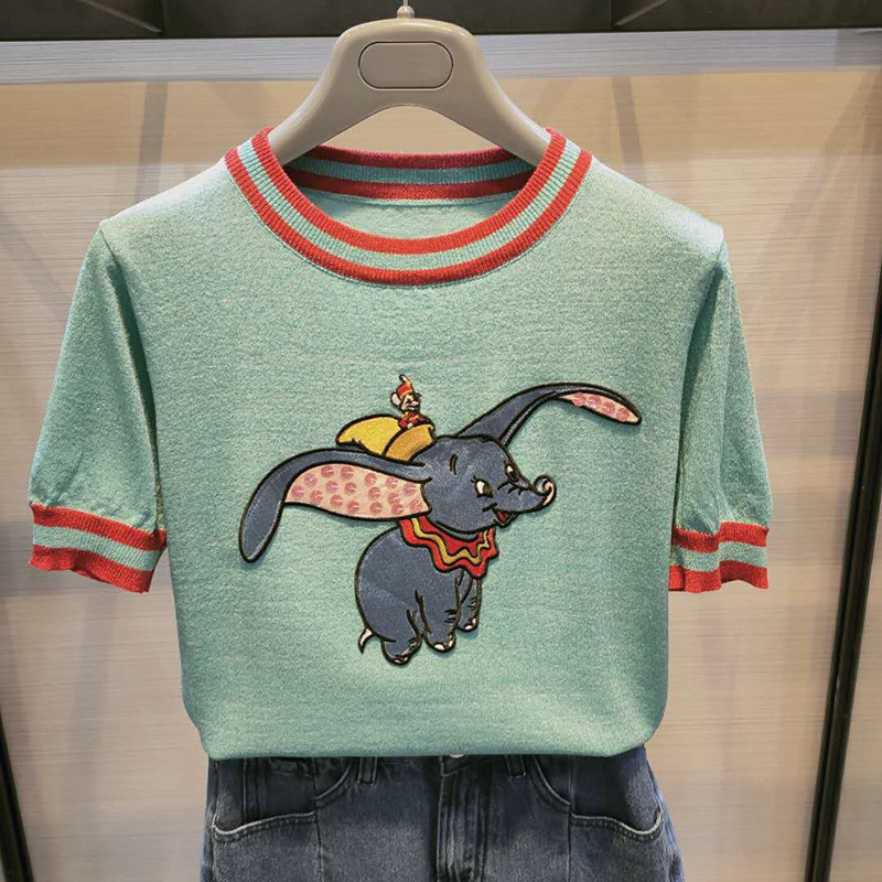 Gejia의 새로운 2024 여름 Dumbo 자수 프린트 대비 색상 얼음 실크 니트 바닥 셔츠 얇은 반팔 티셔츠스토어 가기