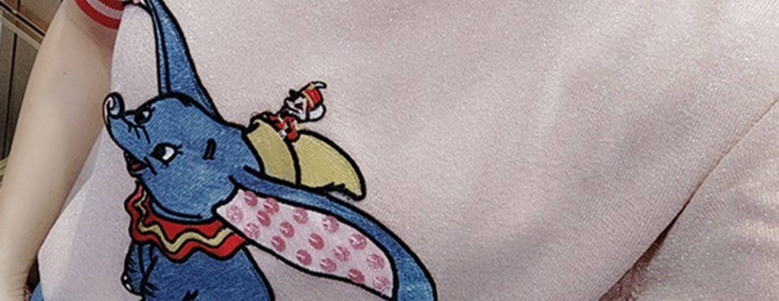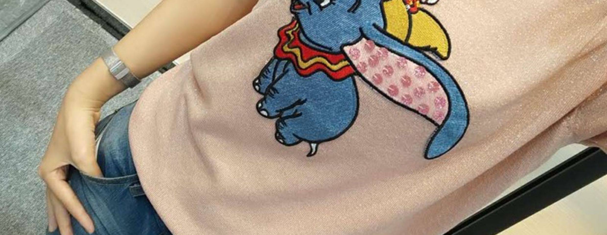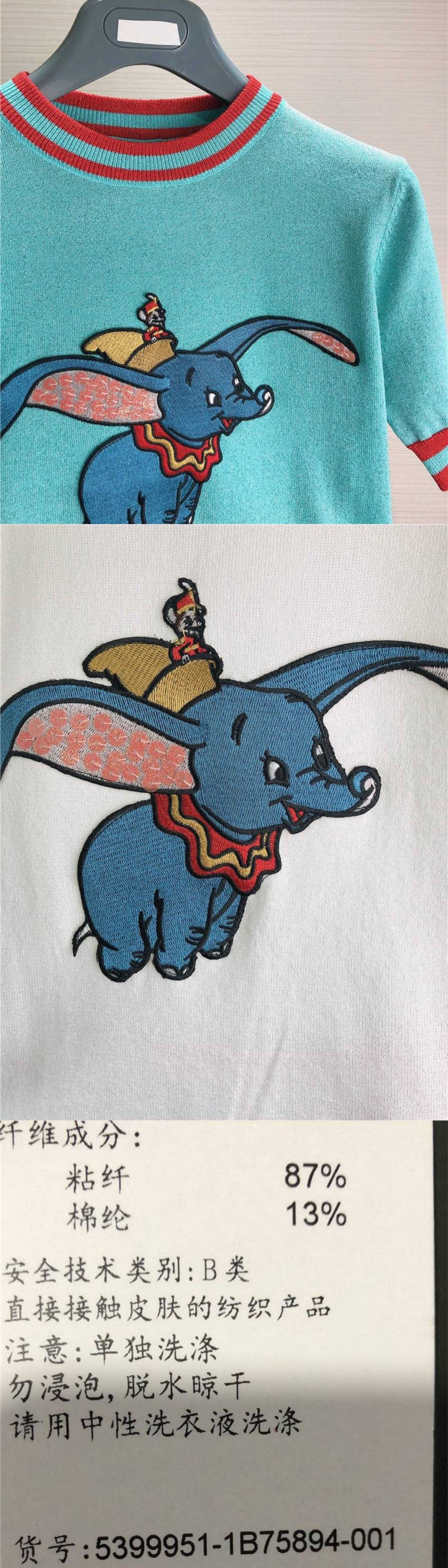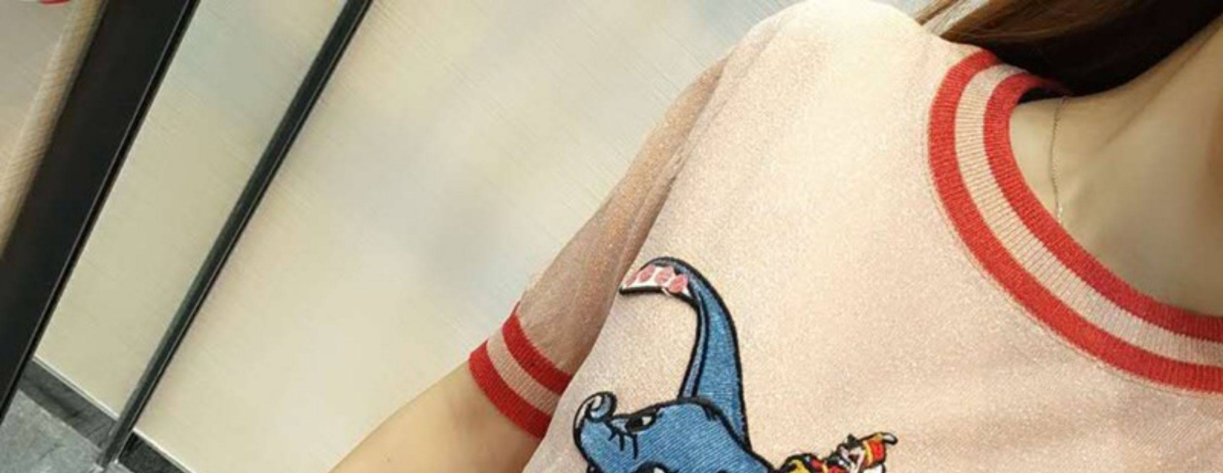 Gejia의 새로운 2024 여름 Dumbo 자수 프린트 대비 색상 얼음 실크 니트 바닥 셔츠 얇은 반팔 티셔츠스토어 가기