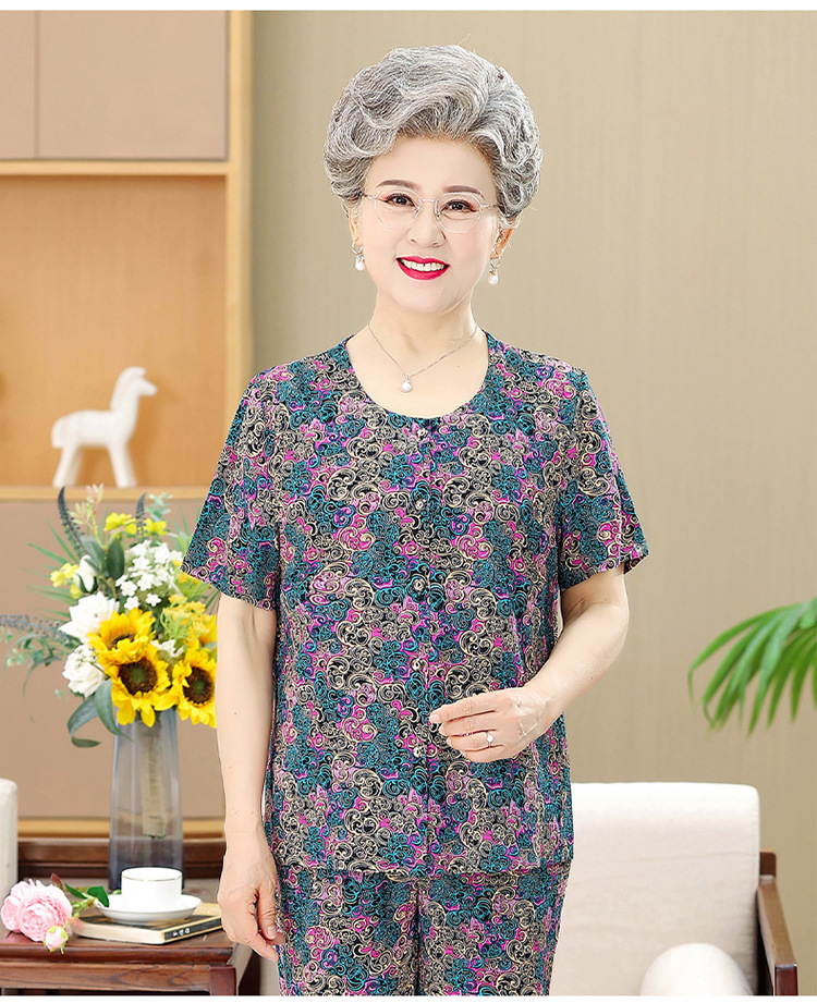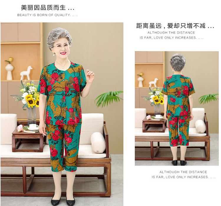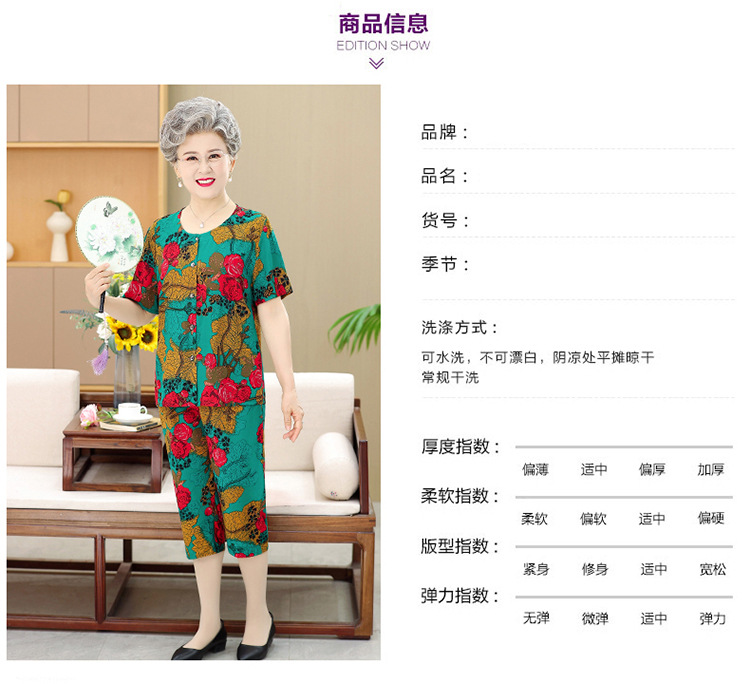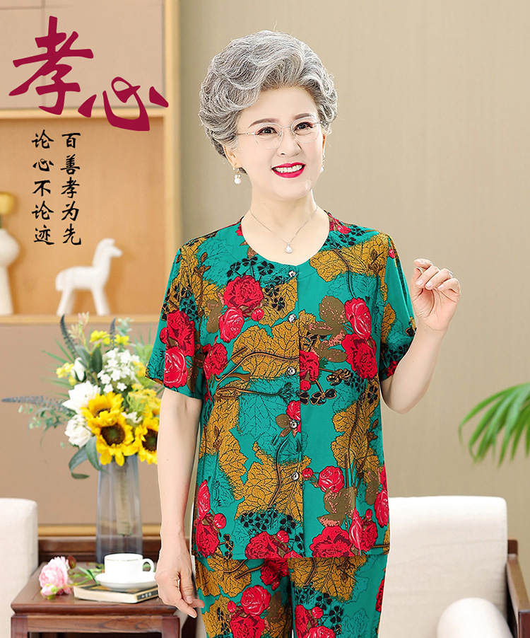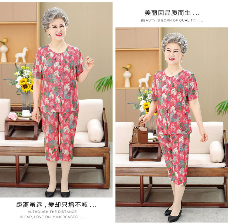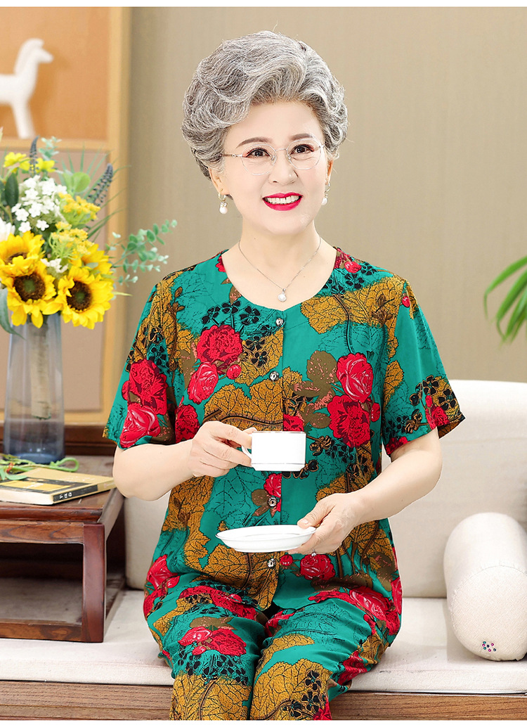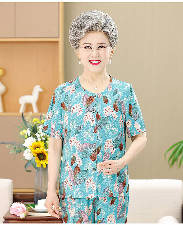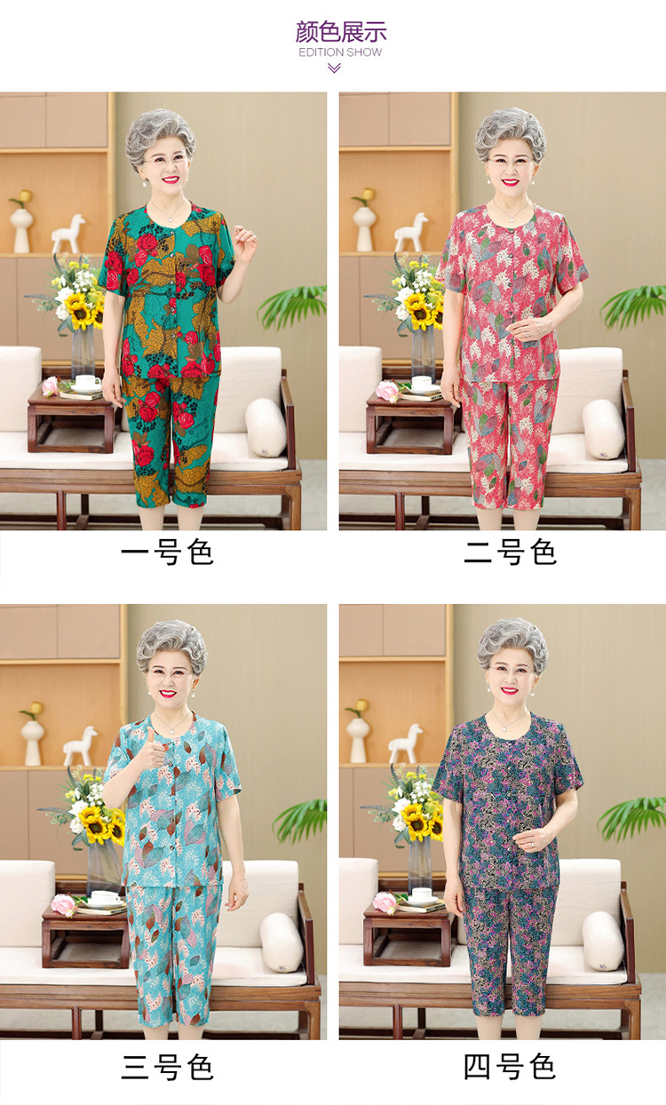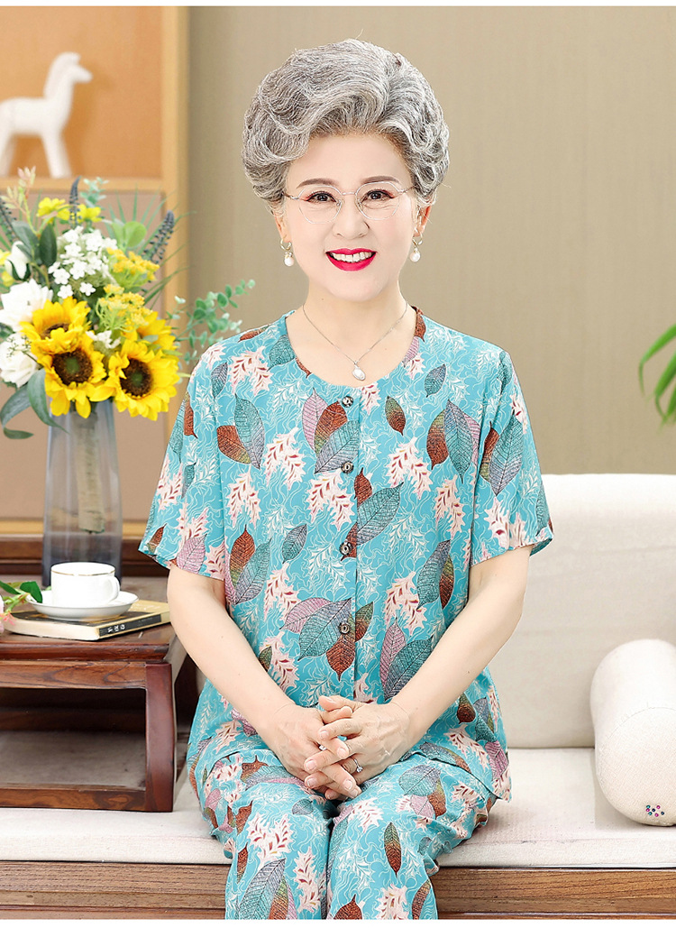 어머니의 면 실크 잠옷 여자의 여름 얇은 중년 및 노인 인공 면 실크 반팔 카디건 에어컨 가정 의류 세트 할머니스토어 가기