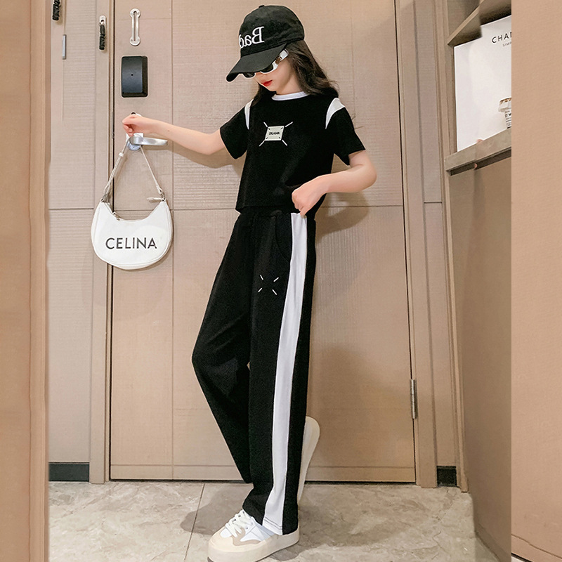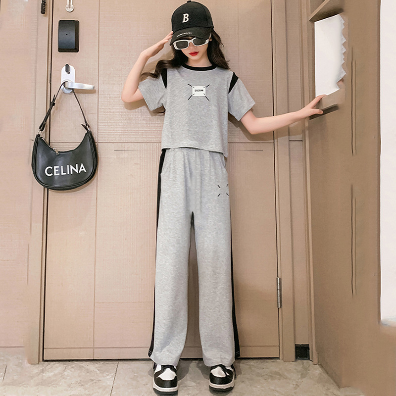 재고 여름 여아 레저 스포츠 세트 중간 및 큰 어린이 반팔 탑 느슨한 스트레이트 와이드 다리 바지 패션 세트