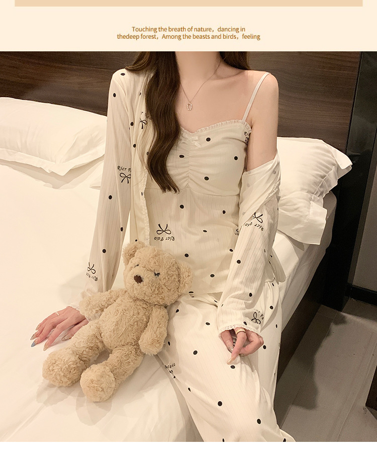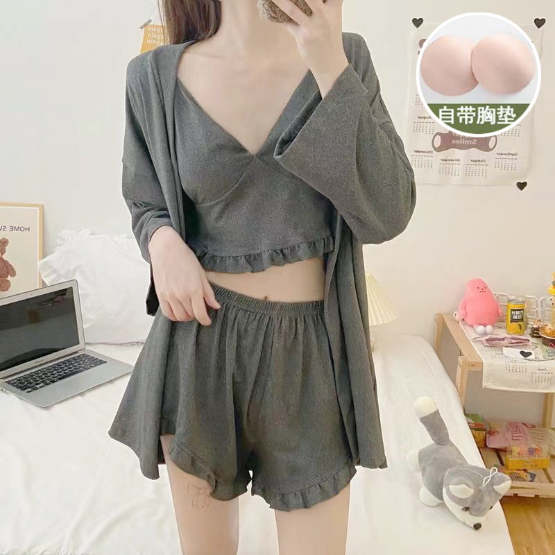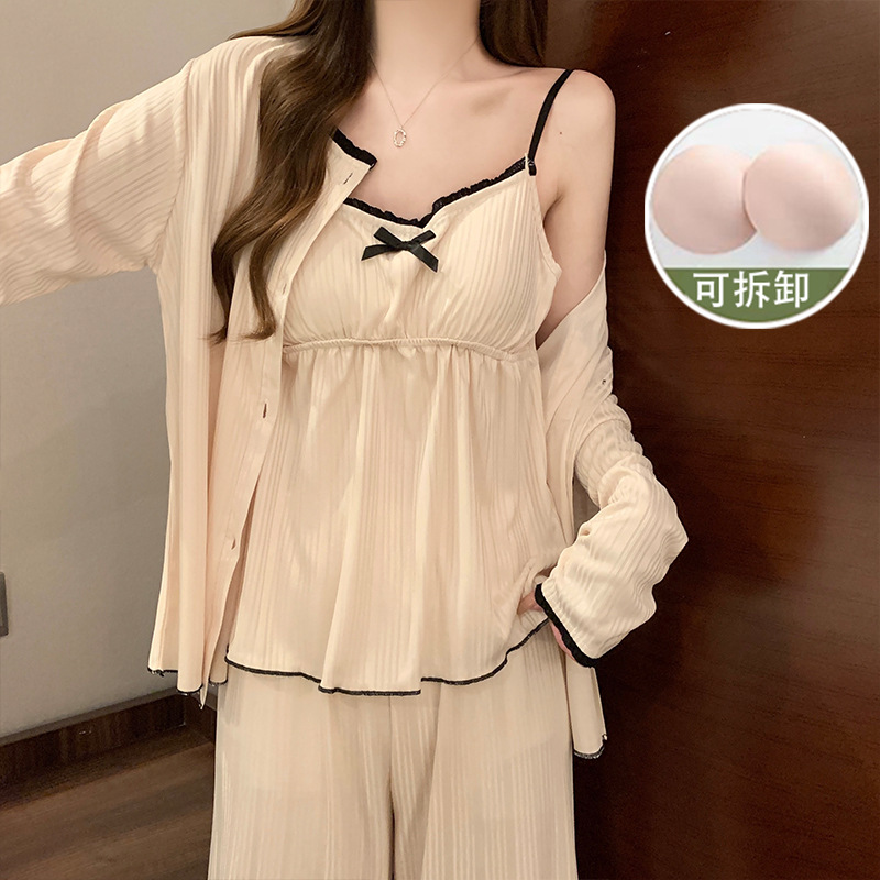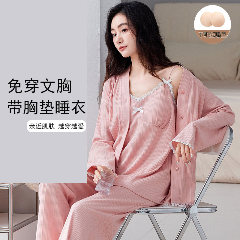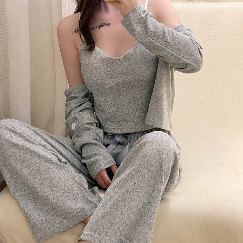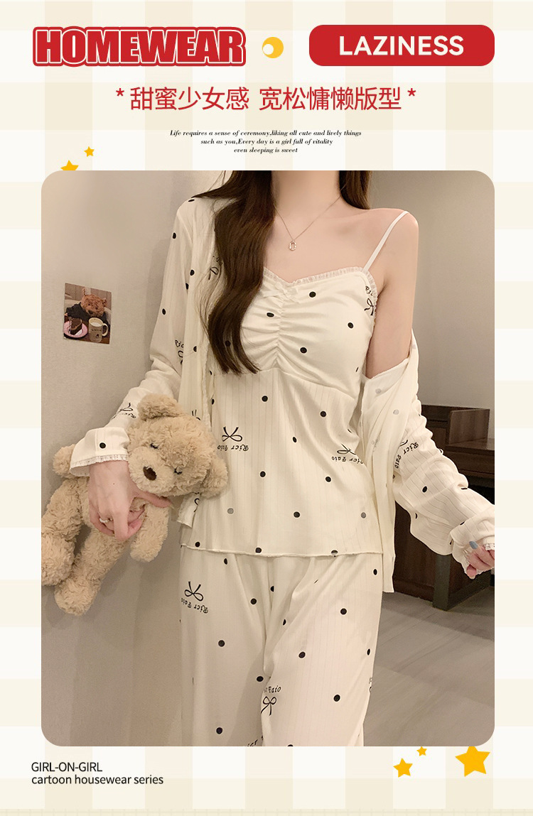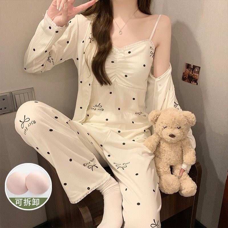 잠옷 여성용 긴팔 멜빵 바지 가슴 패드가있는 쓰리피스 세트 순수한 욕망 한국 스타일 달콤한 꽃 가정복 봄과 가을 스타일