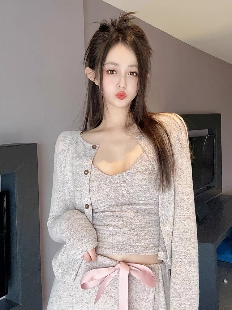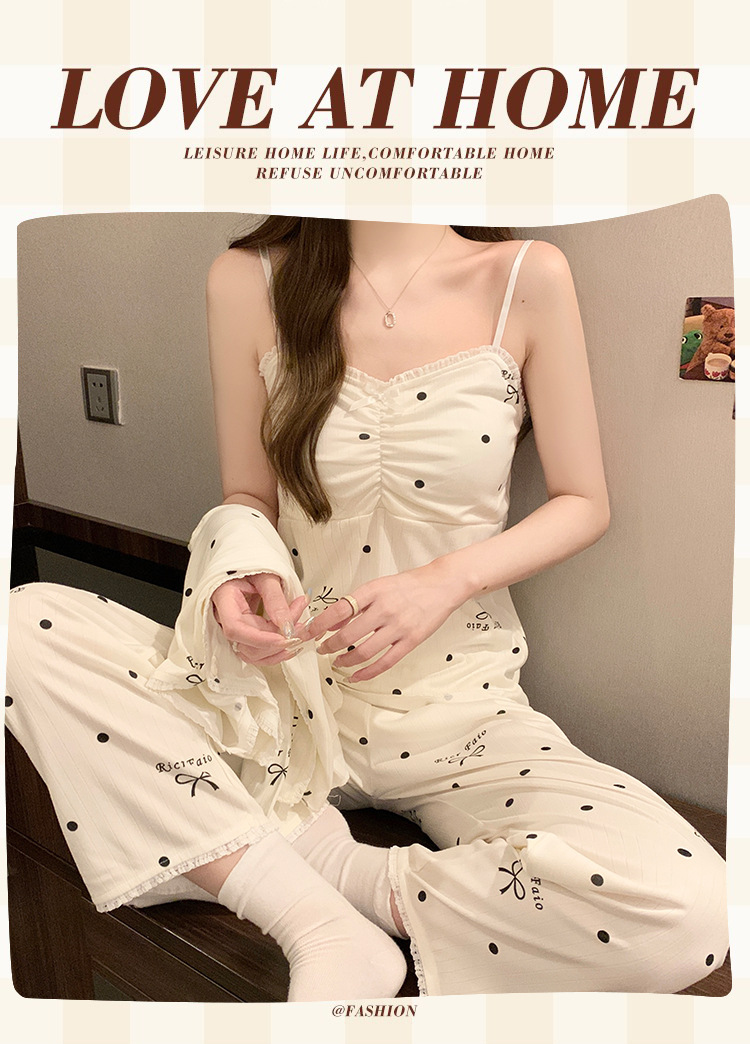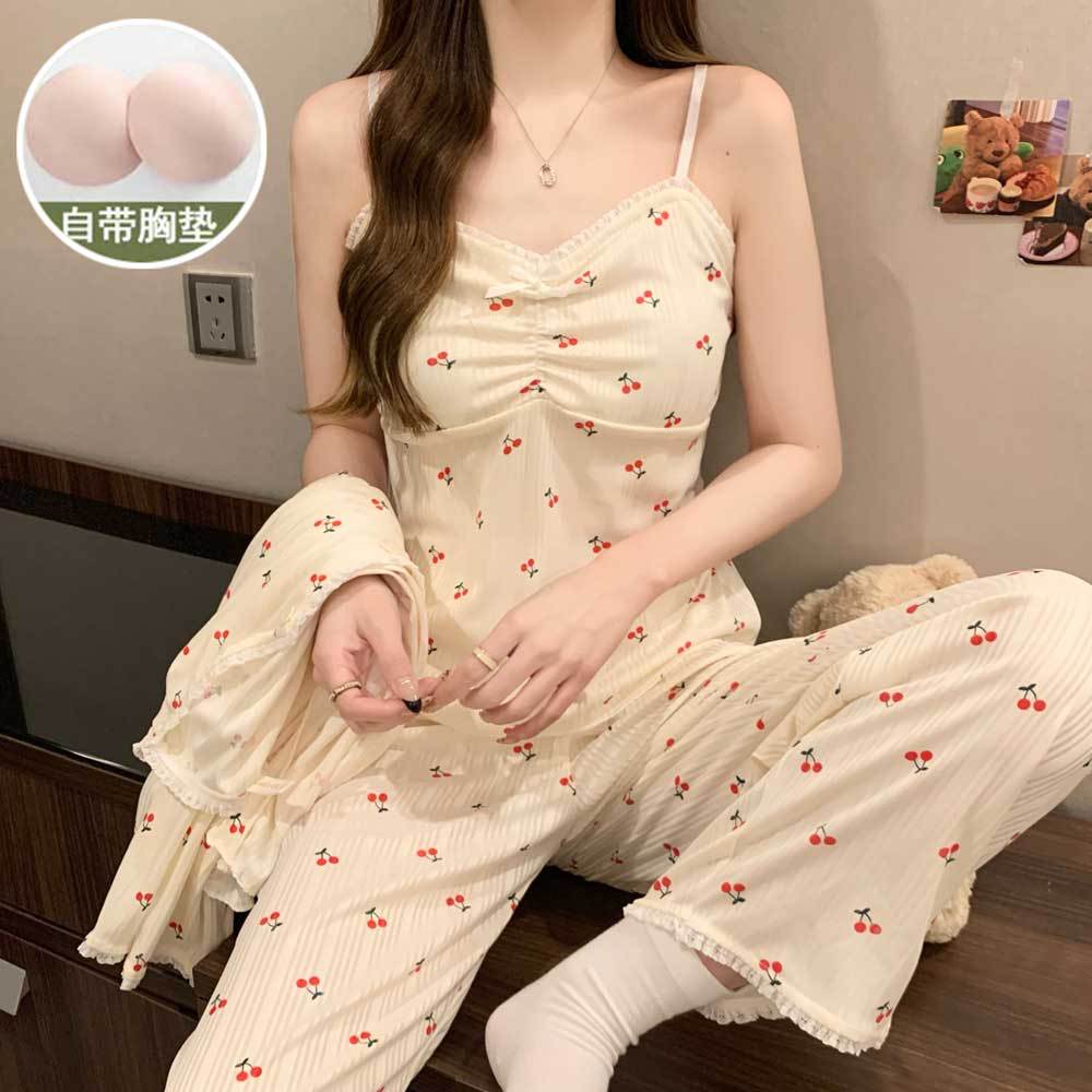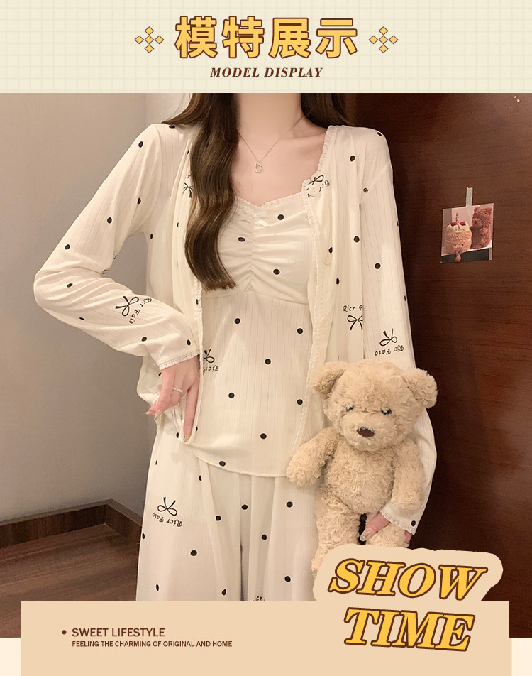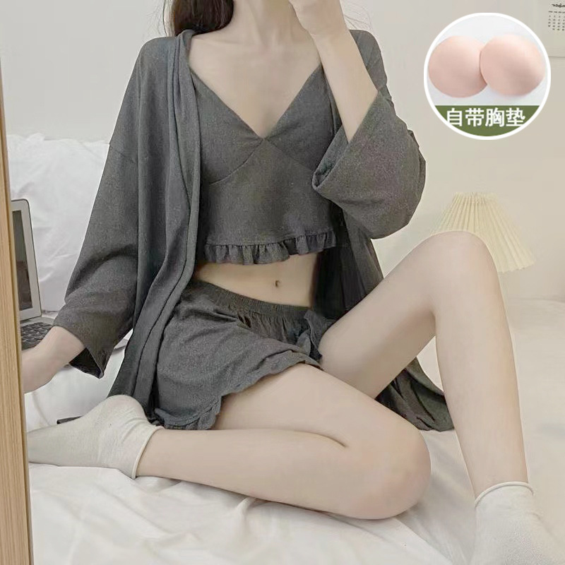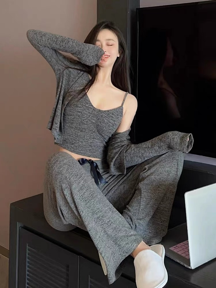 잠옷 여성용 긴팔 멜빵 바지 가슴 패드가있는 쓰리피스 세트 순수한 욕망 한국 스타일 달콤한 꽃 가정복 봄과 가을 스타일
