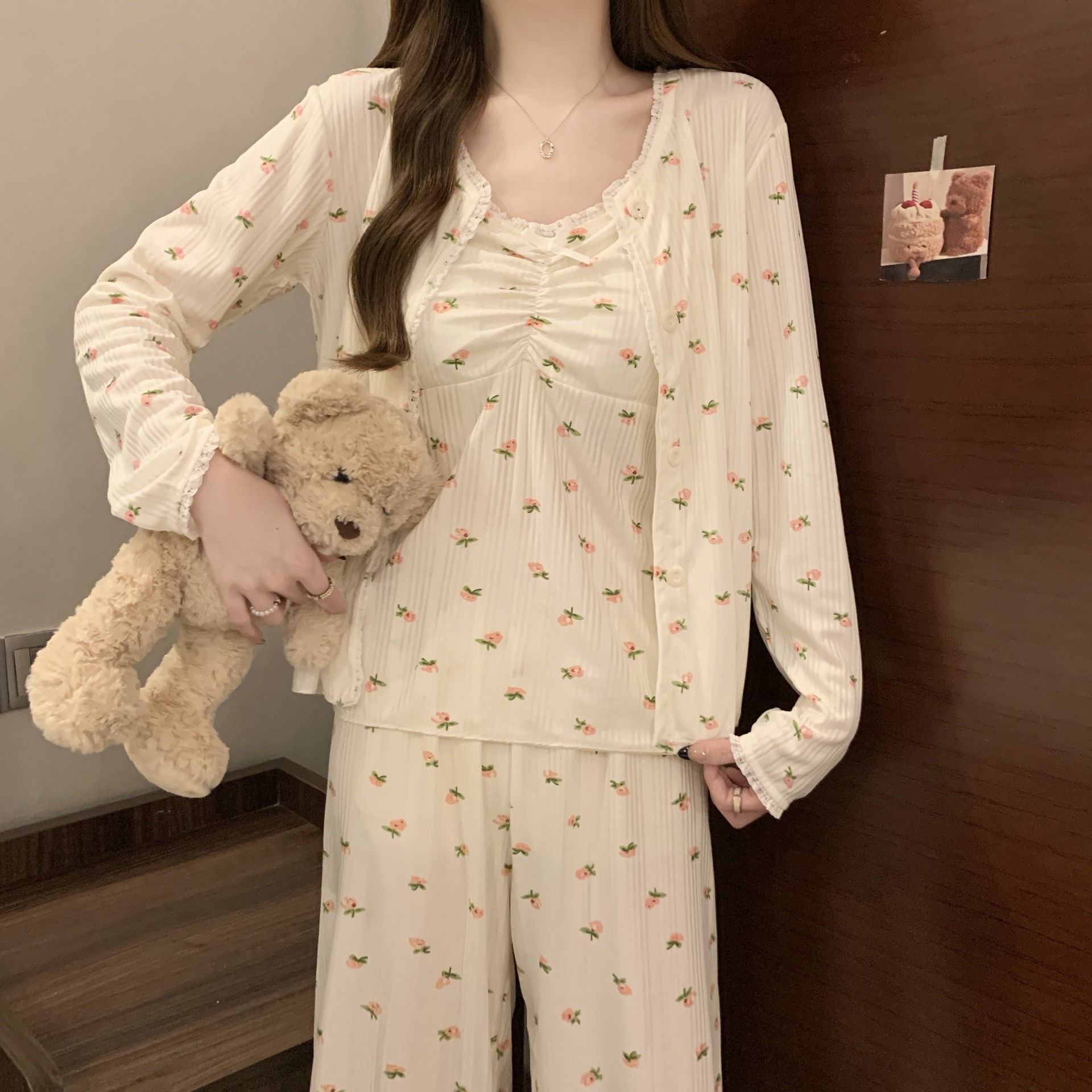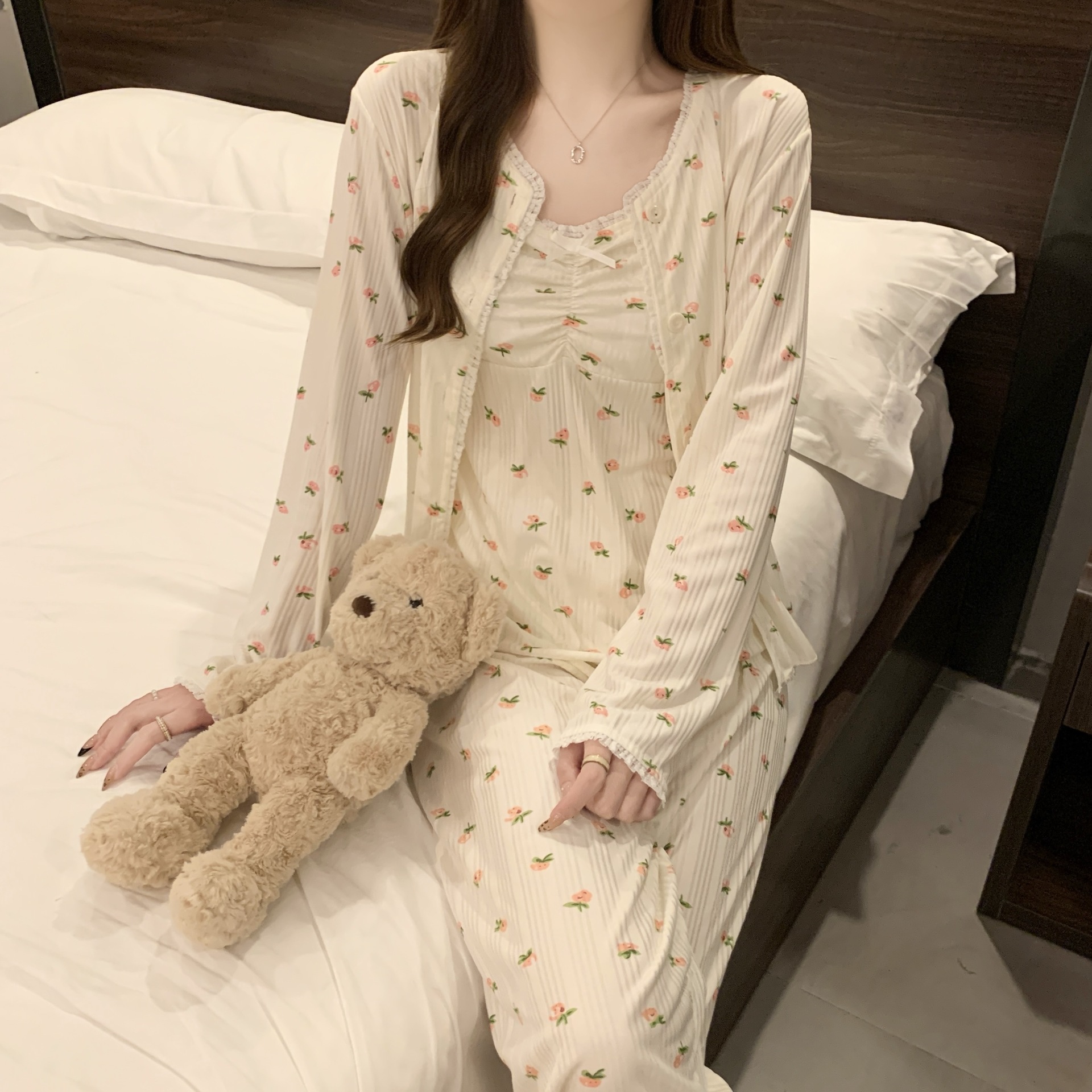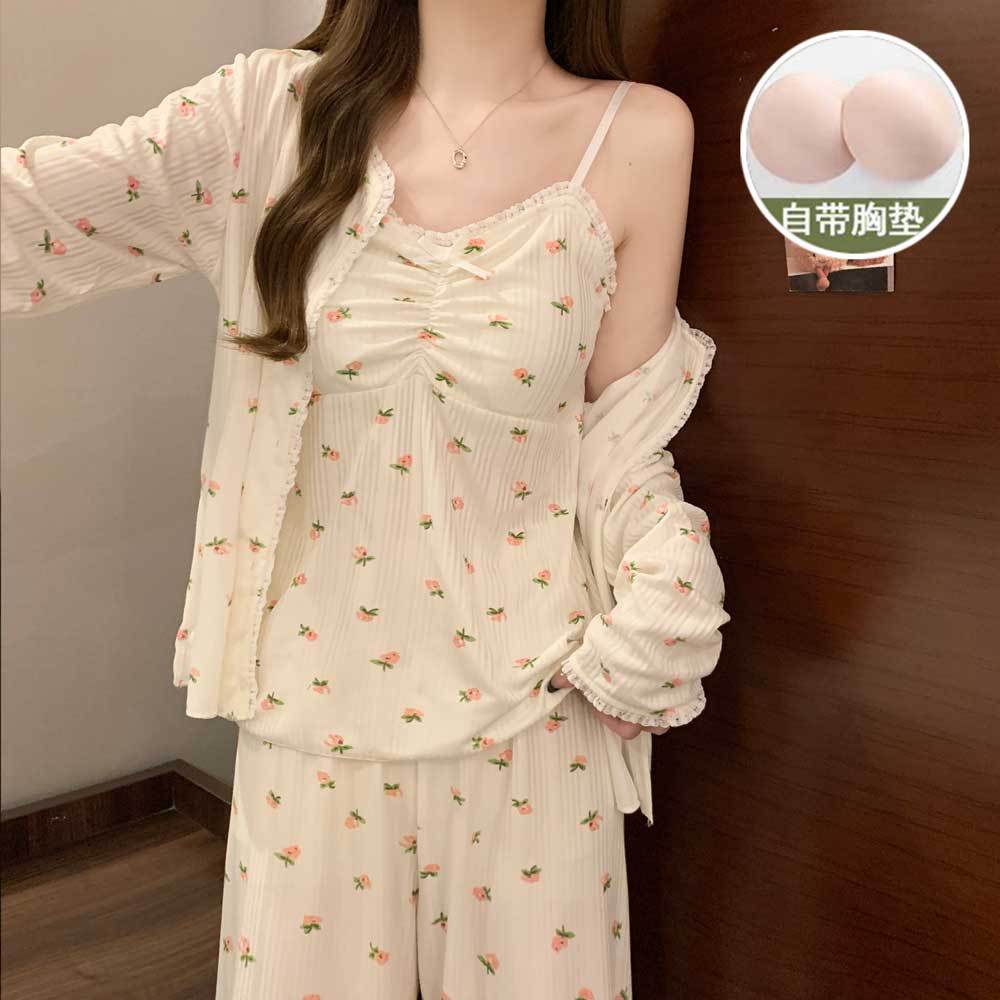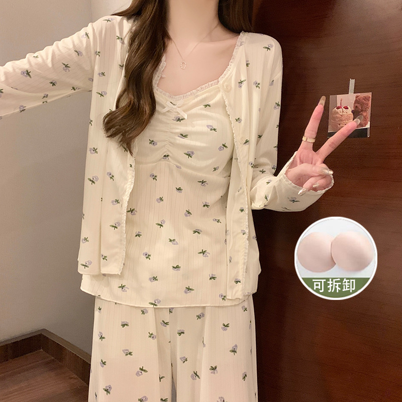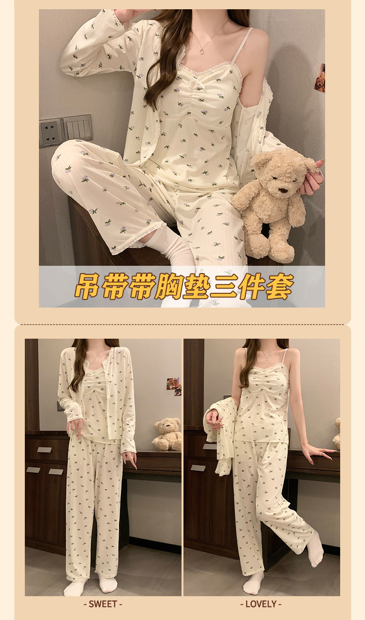 잠옷 여성용 긴팔 멜빵 바지 가슴 패드가있는 쓰리피스 세트 순수한 욕망 한국 스타일 달콤한 꽃 가정복 봄과 가을 스타일스토어 가기