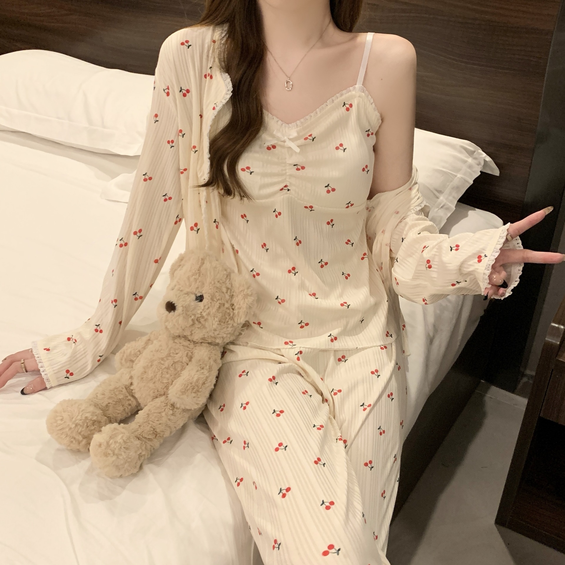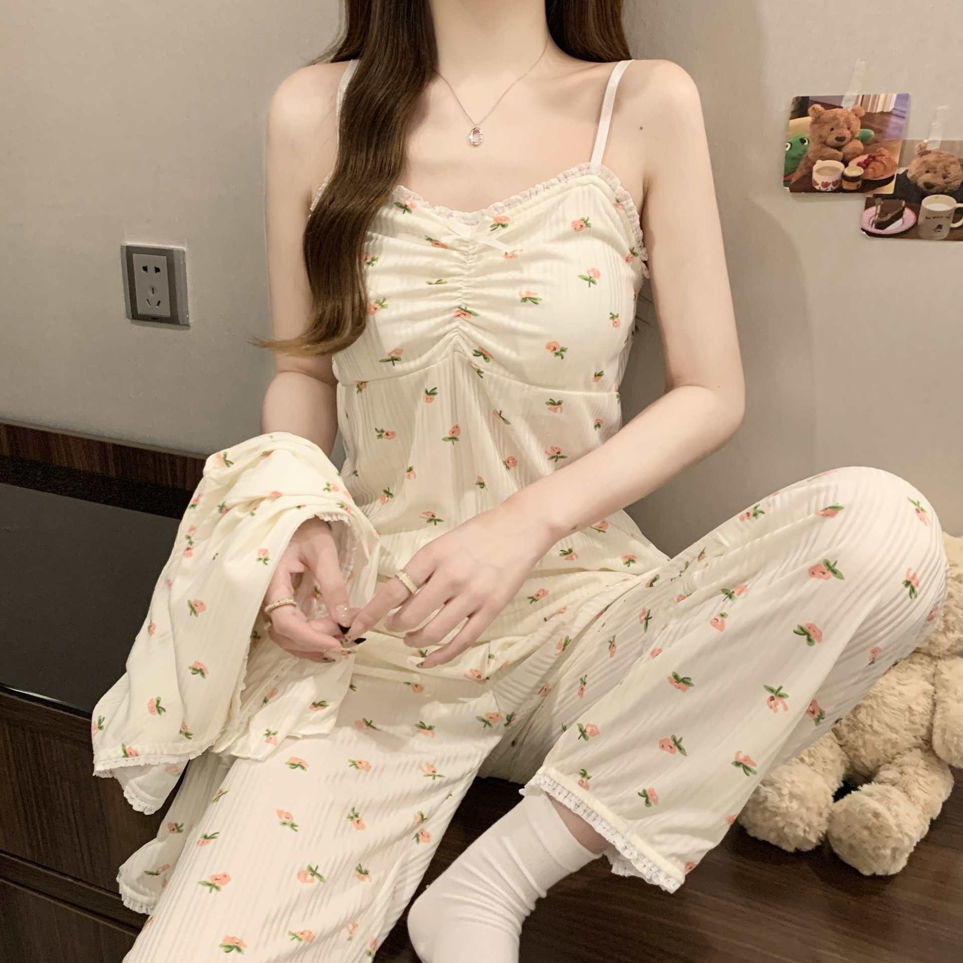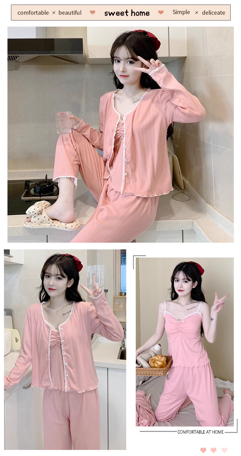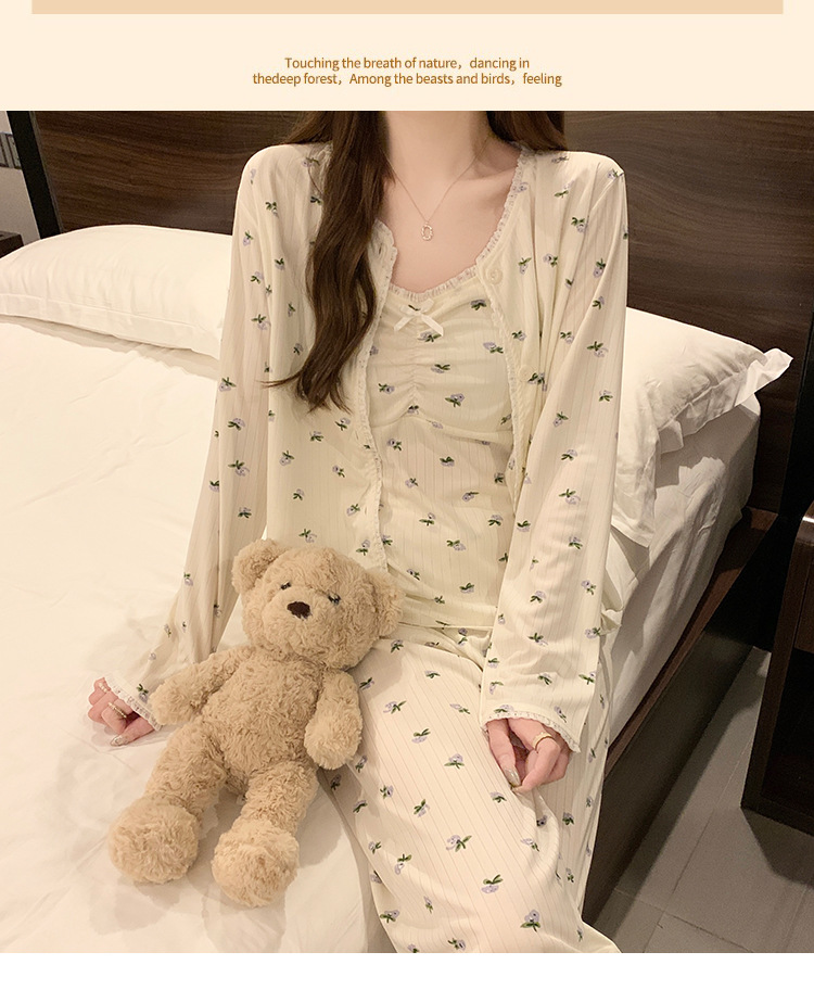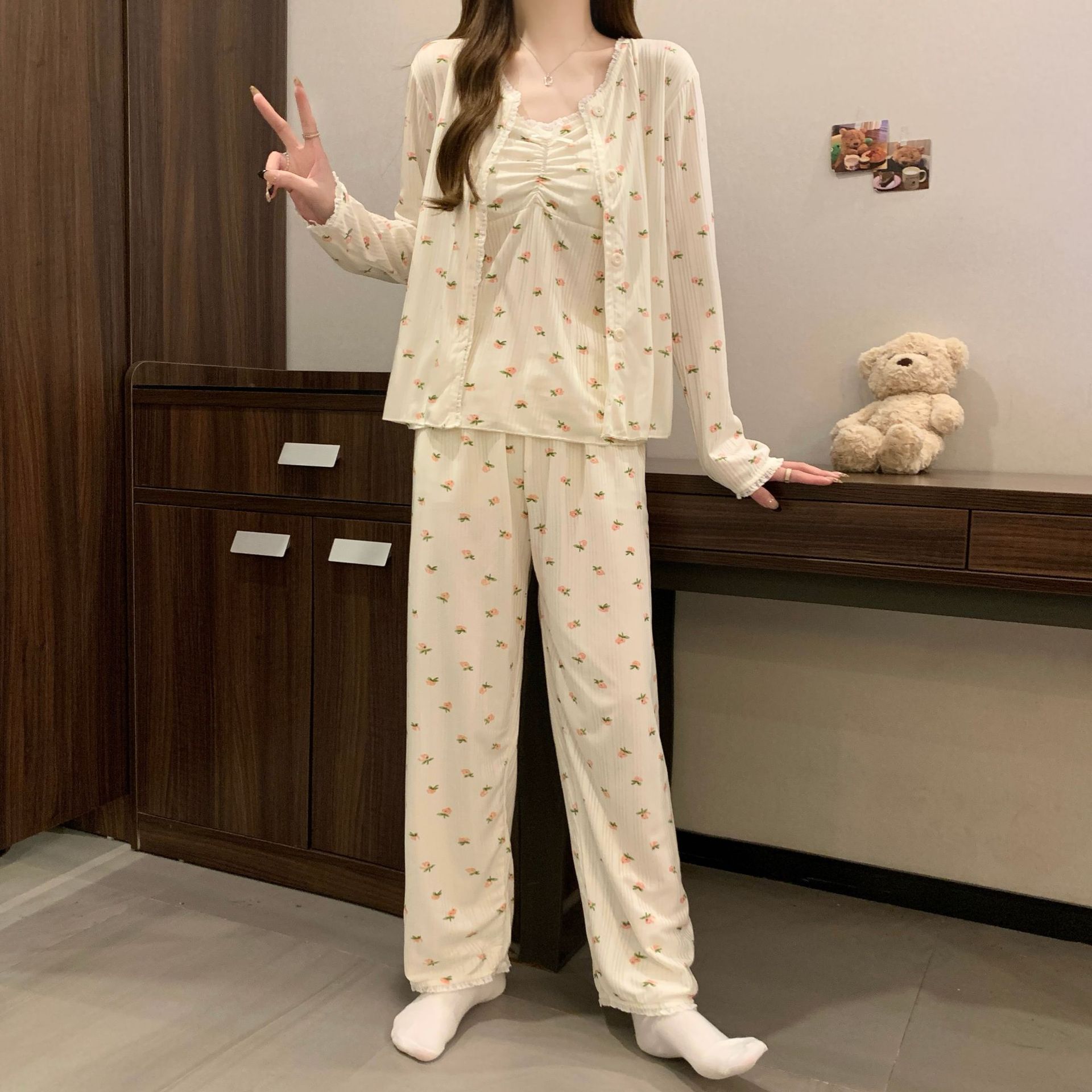 잠옷 여성용 긴팔 멜빵 바지 가슴 패드가있는 쓰리피스 세트 순수한 욕망 한국 스타일 달콤한 꽃 가정복 봄과 가을 스타일스토어 가기
