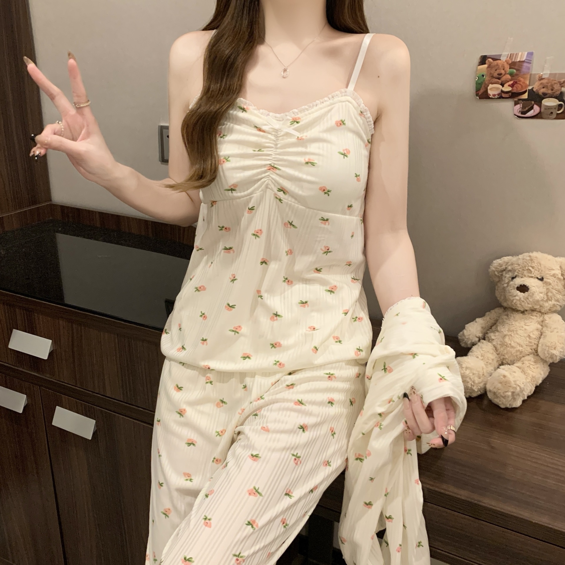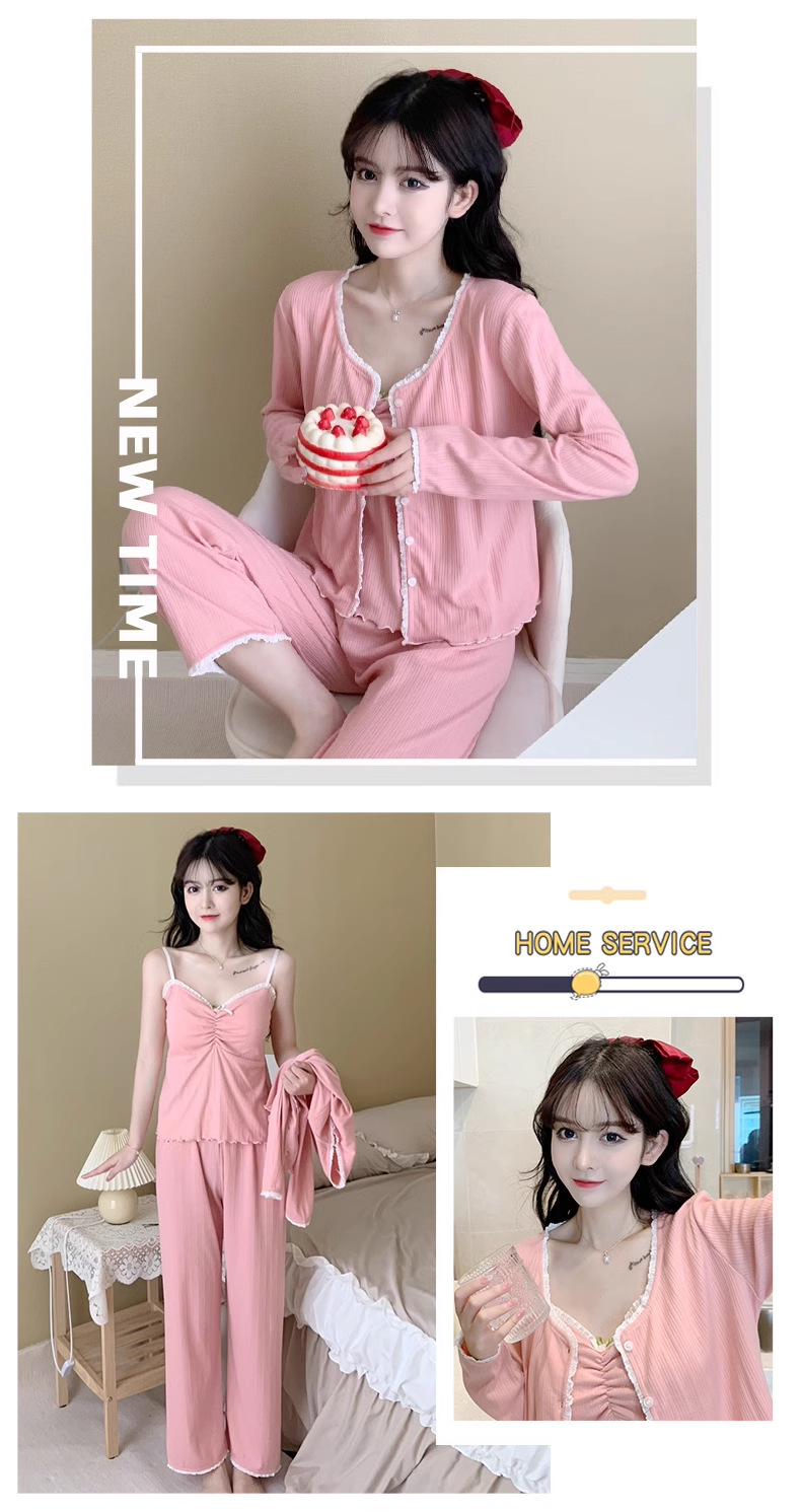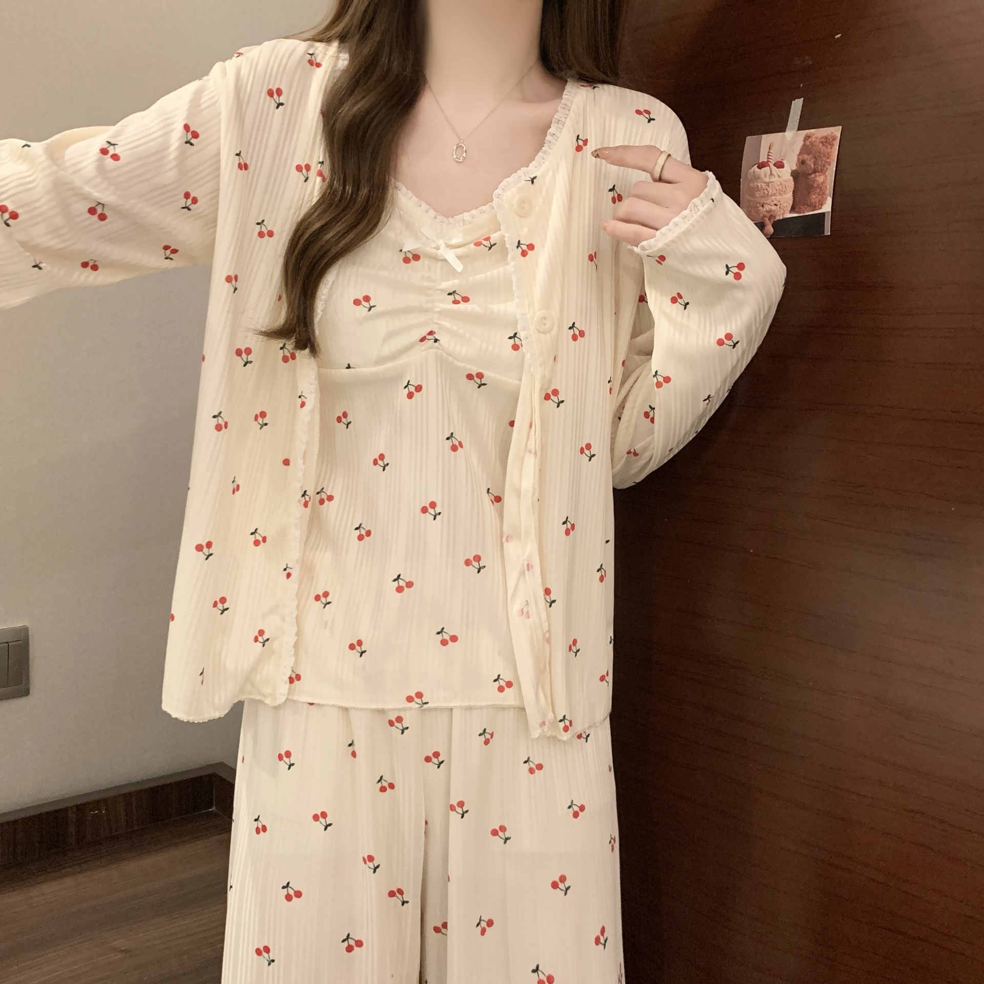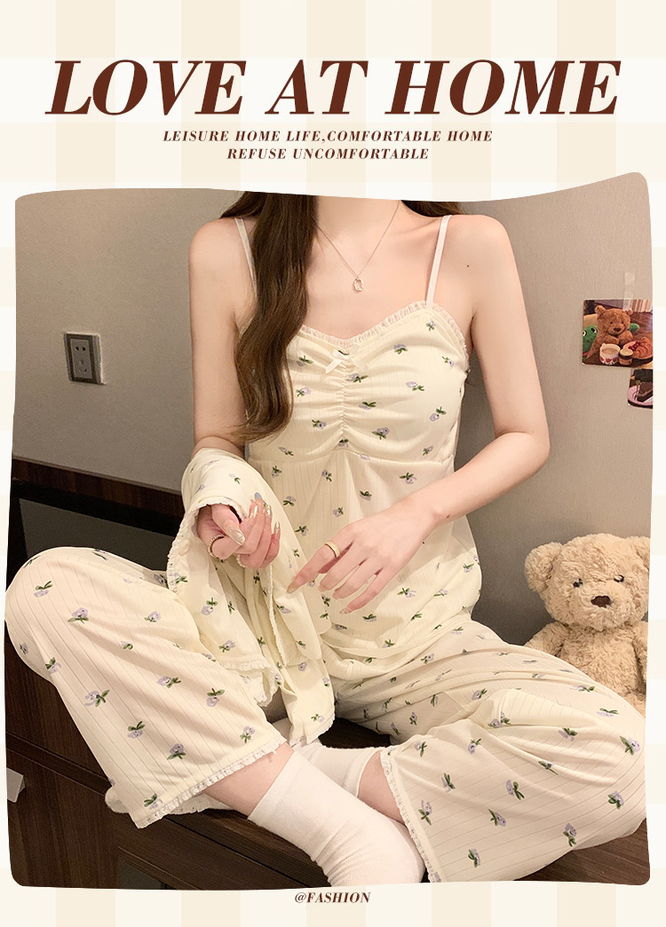 잠옷 여성용 긴팔 멜빵 바지 가슴 패드가있는 쓰리피스 세트 순수한 욕망 한국 스타일 달콤한 꽃 가정복 봄과 가을 스타일스토어 가기