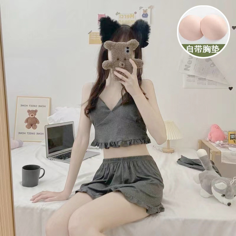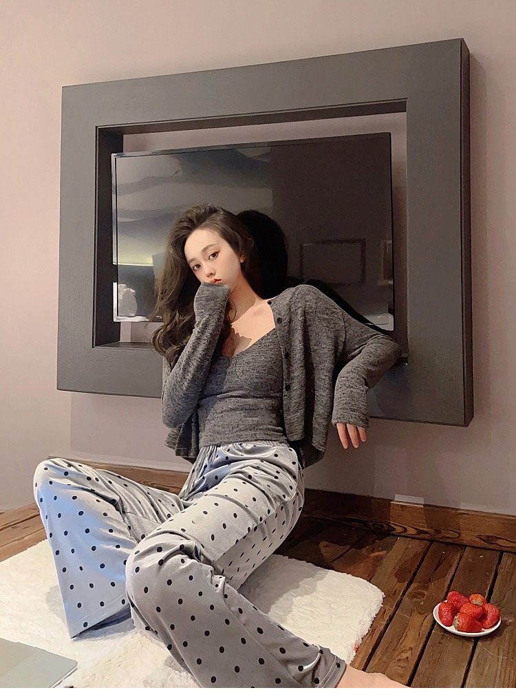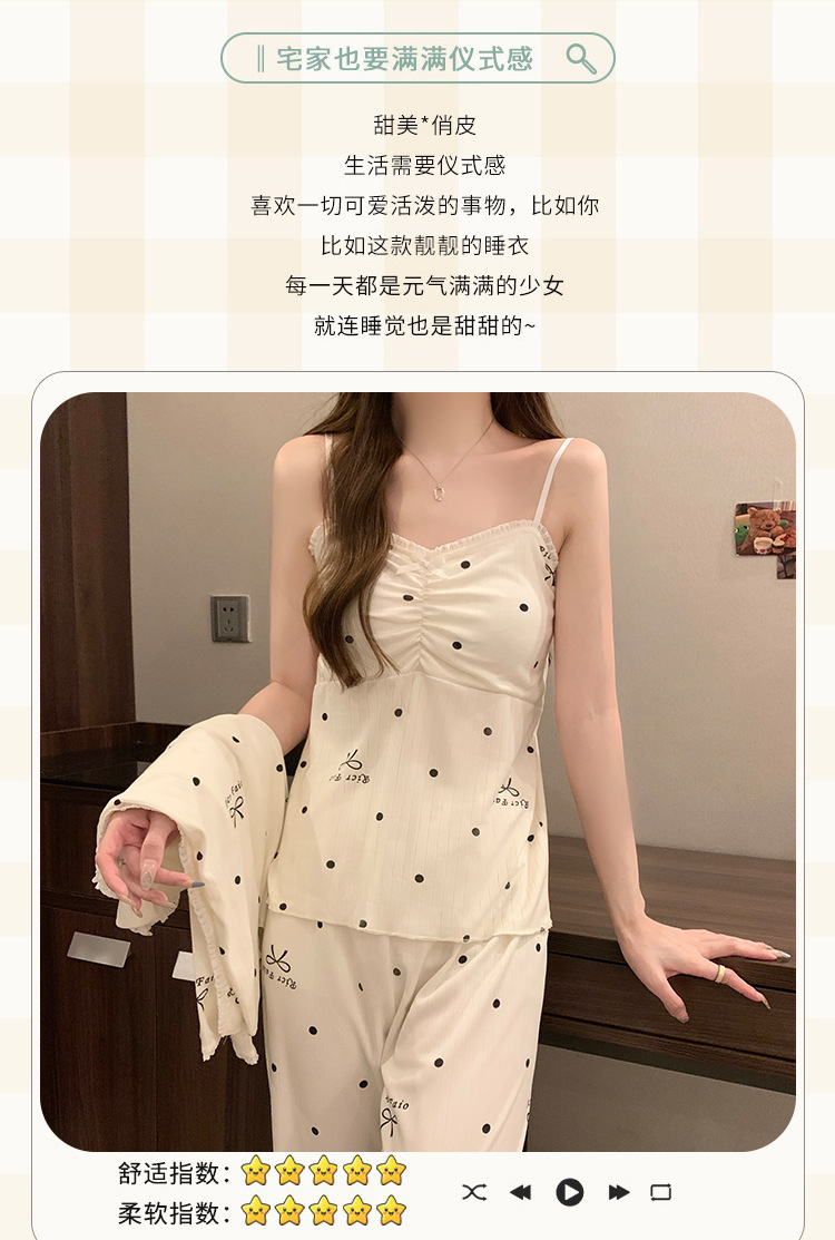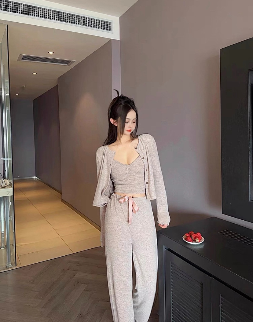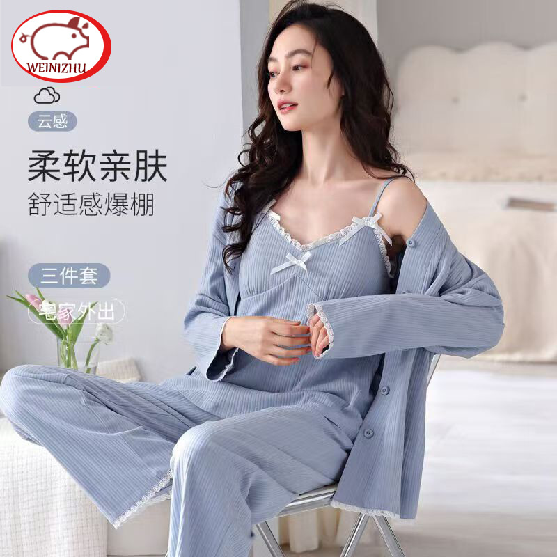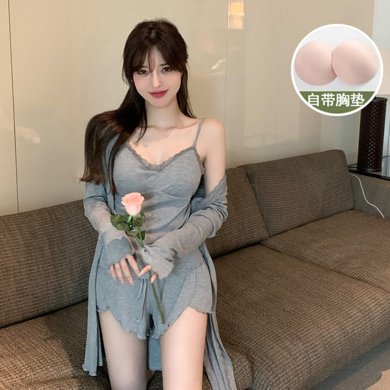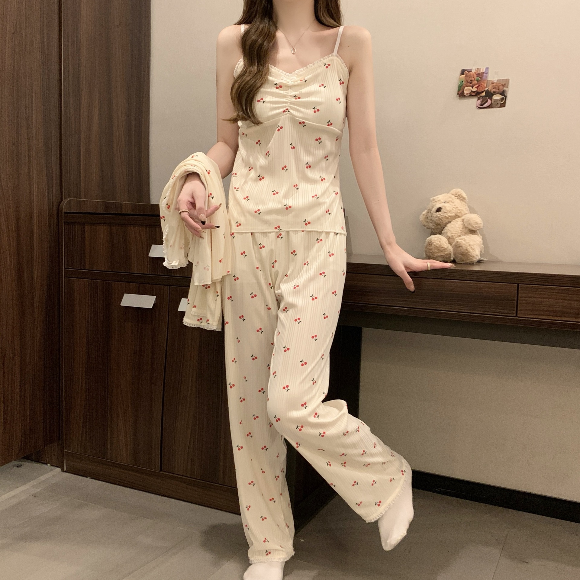 잠옷 여성용 긴팔 멜빵 바지 가슴 패드가있는 쓰리피스 세트 순수한 욕망 한국 스타일 달콤한 꽃 가정복 봄과 가을 스타일스토어 가기