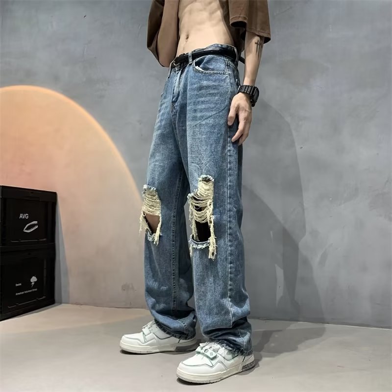 무릎 찢어진 청바지 남성용 스트레이트 튜브 느슨한 분위기 트렌디 여름 얇은 거지 바지 전국 트렌디 하이 스트리트 팬츠
