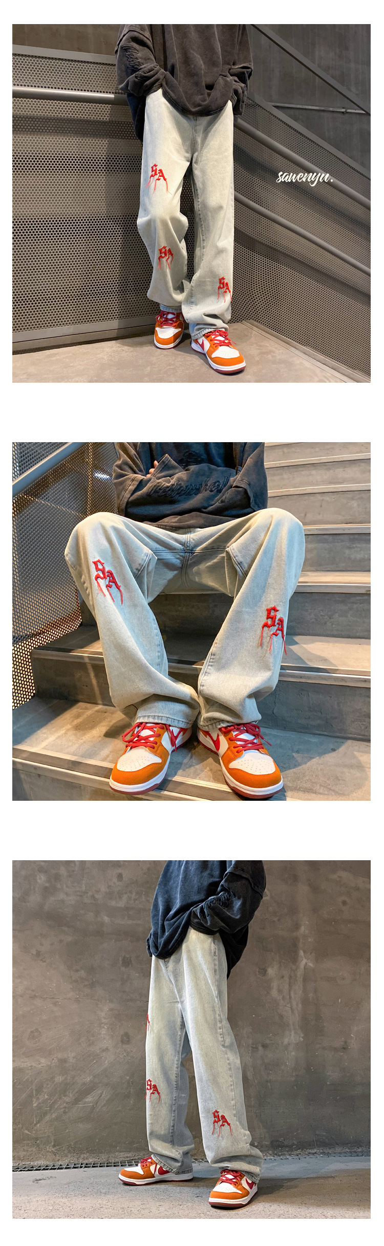 浅色刺绣牛仔裤男直筒高级设计感小众vibe风国潮高街裤子ins潮牌