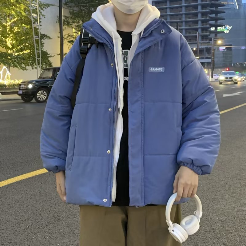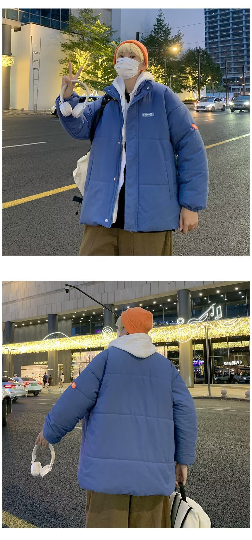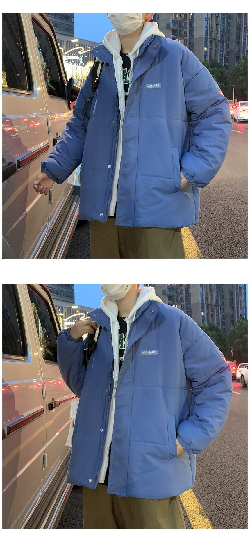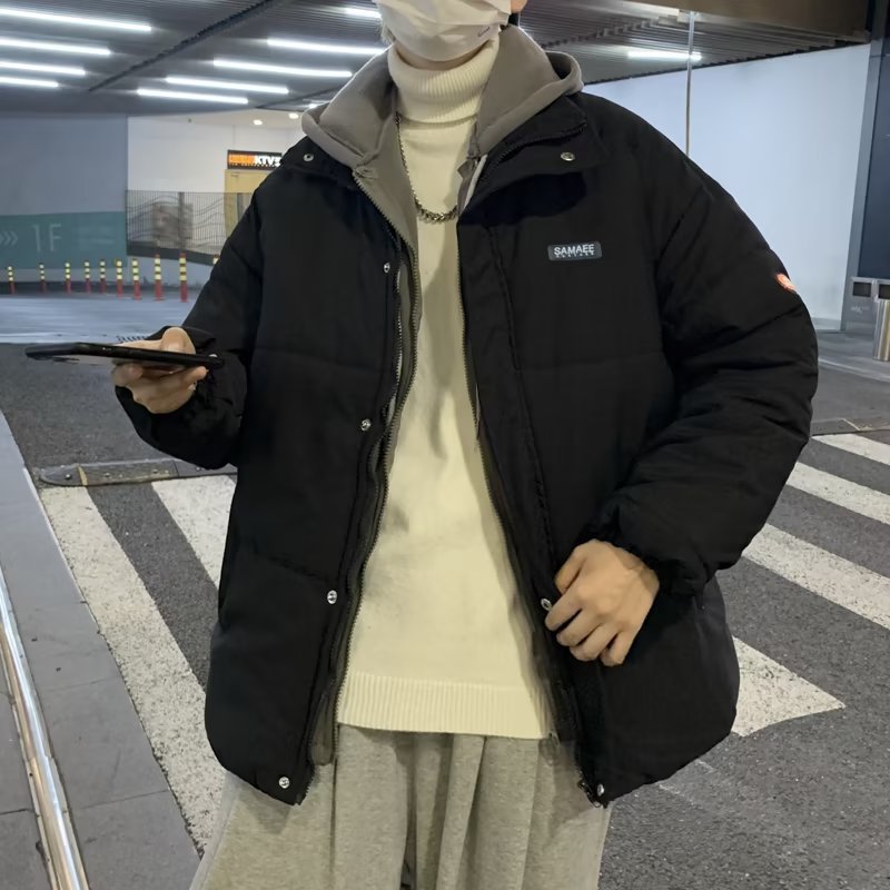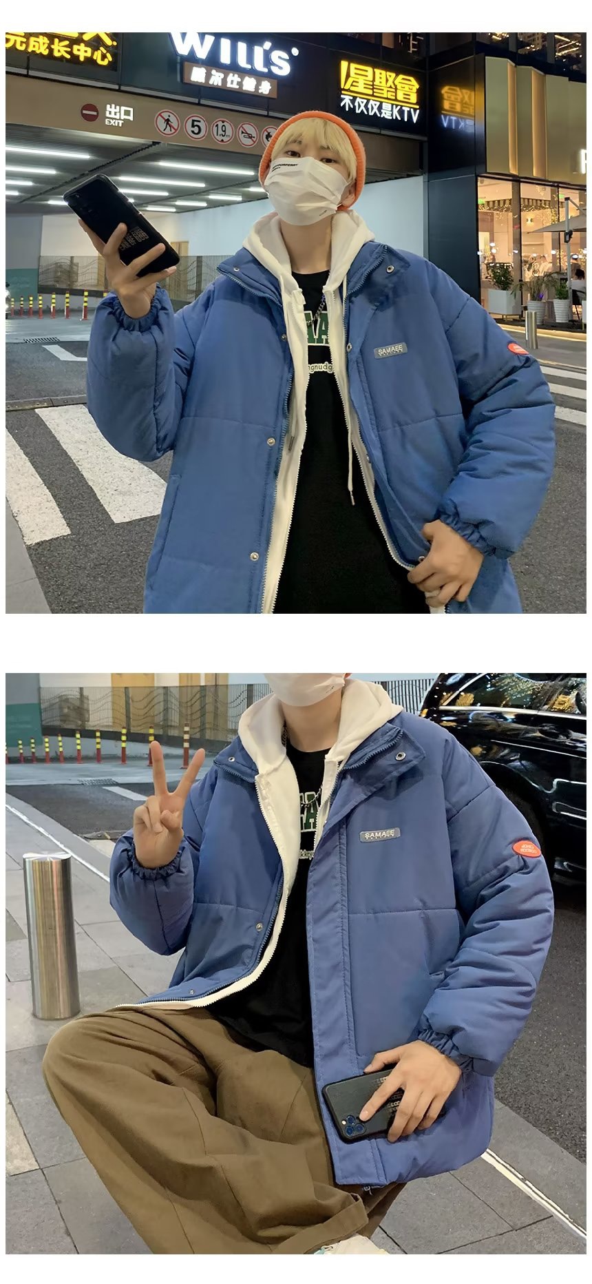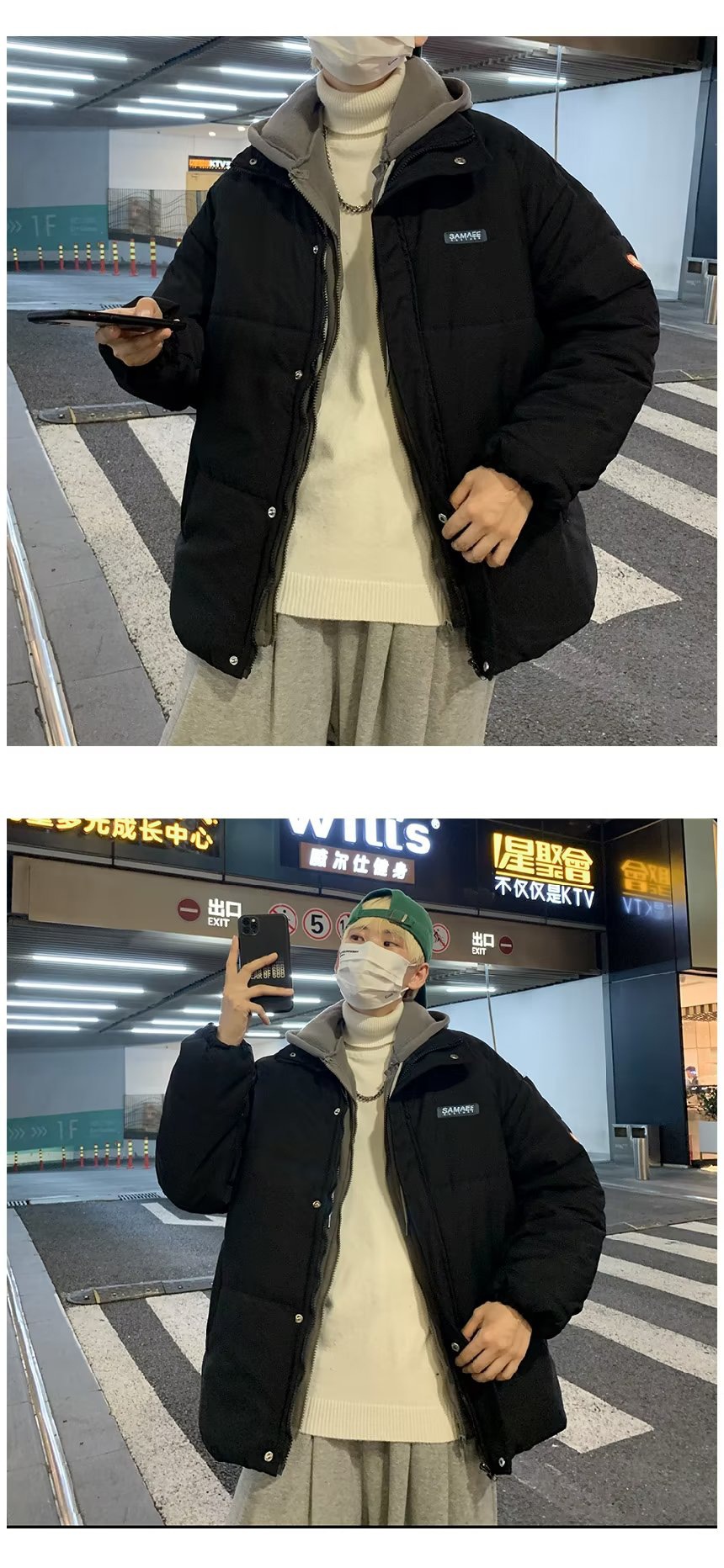 커플을위한 겨울 핫 셀러 가짜 투피스 다운 재킷 한국식 유행 학생 재킷 남성용 느슨한 두꺼운 빵 옷스토어 가기