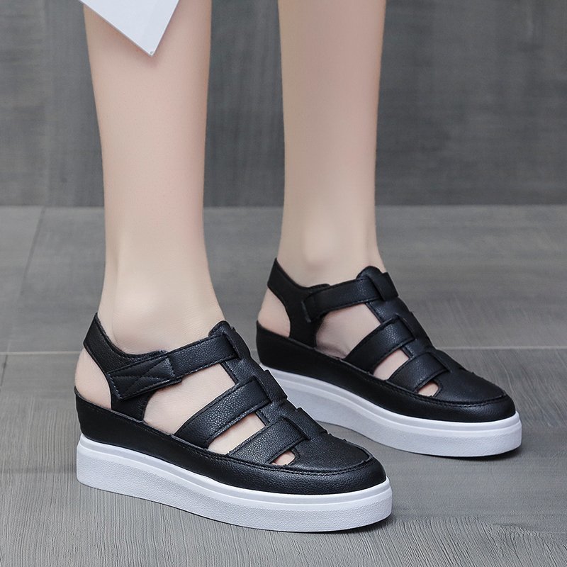 2023 여름 새 웨지 힐 두꺼운 바닥 발가락 샌들 여성용 한국식 벨크로 중공 높이 증가 소프트 솔 샌들 트렌디스토어 가기