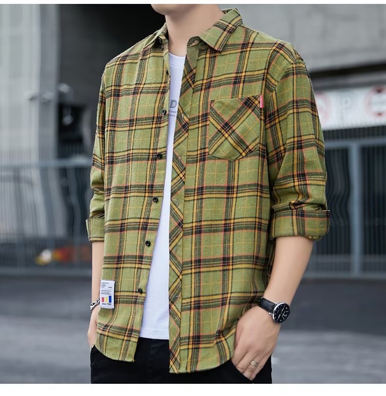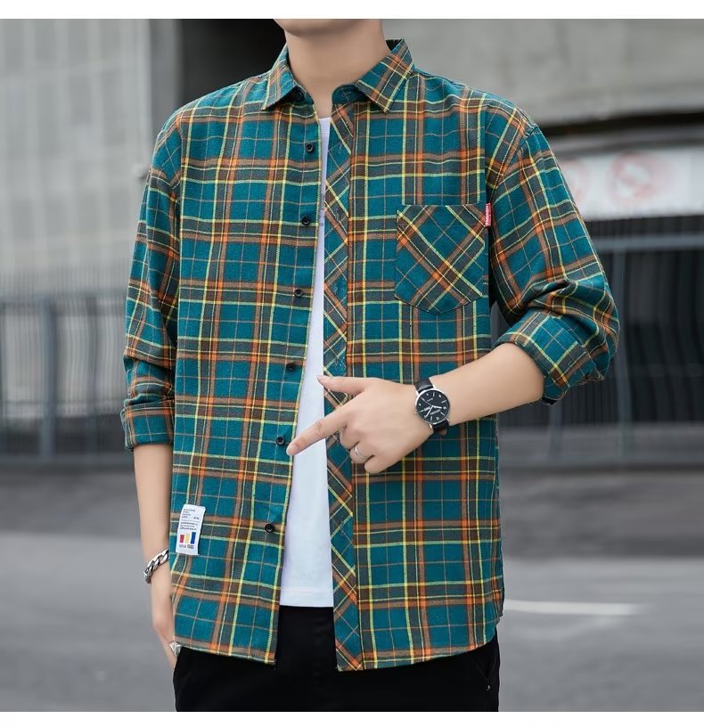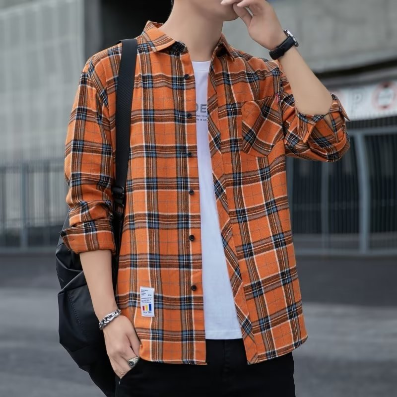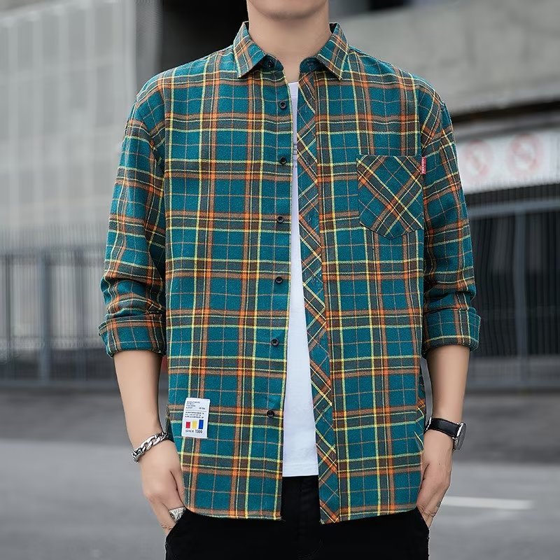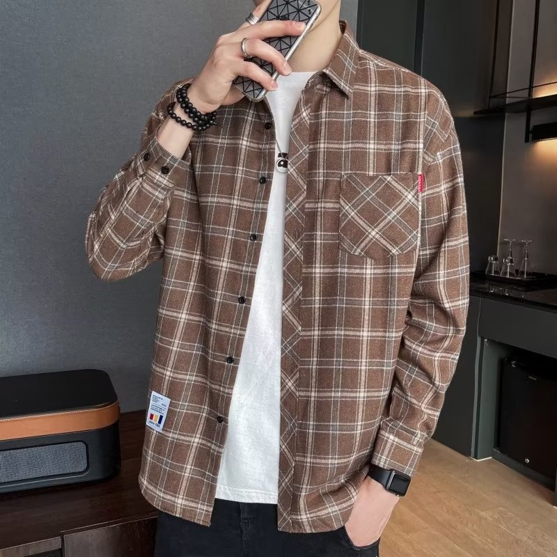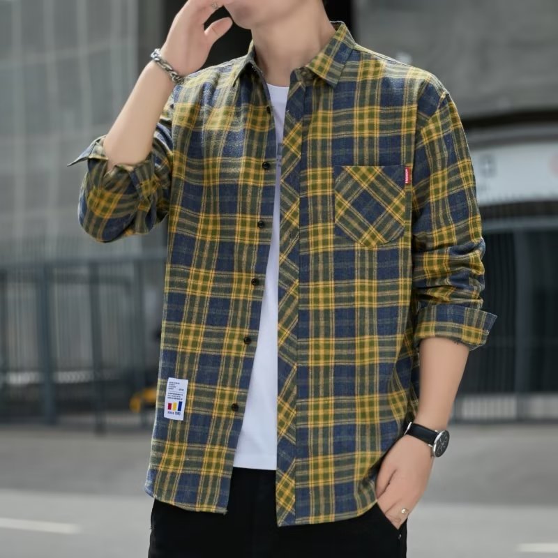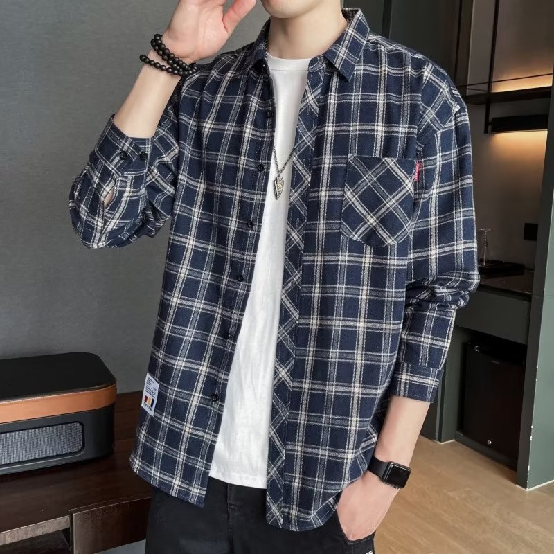 일본 격자 무늬 긴 소매 셔츠 남자의 봄과 가을 새로운 느슨한 캐주얼 유행 브랜드 홍콩 스타일 셔츠 남성 재킷