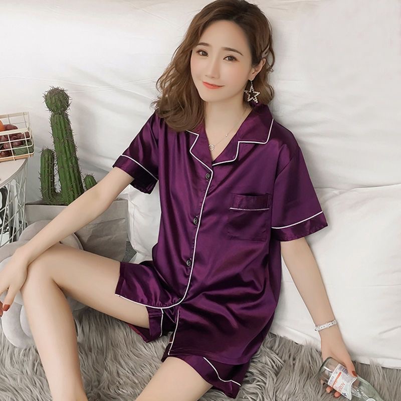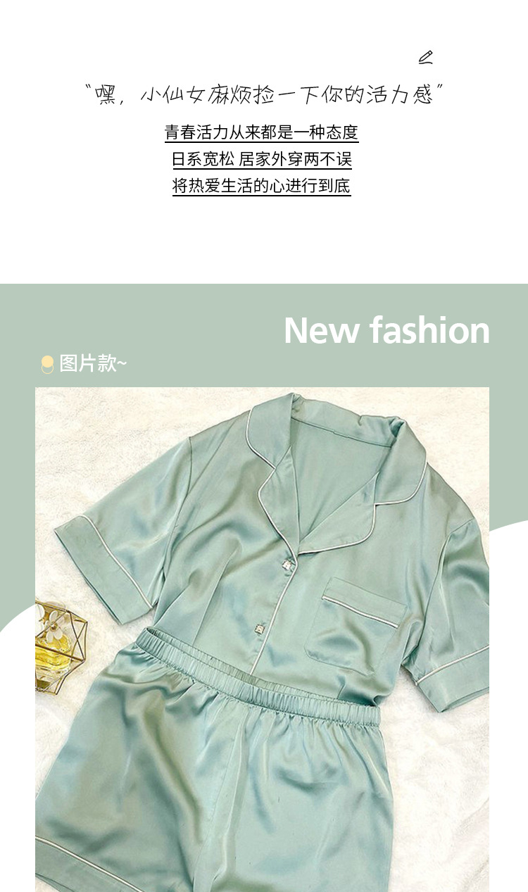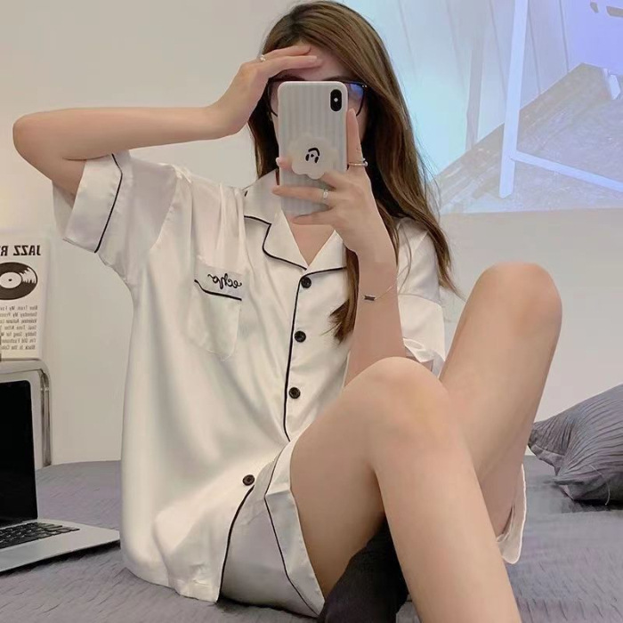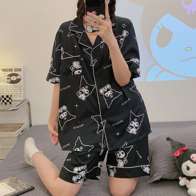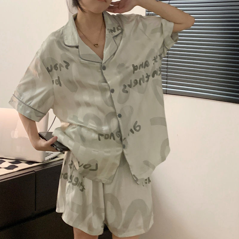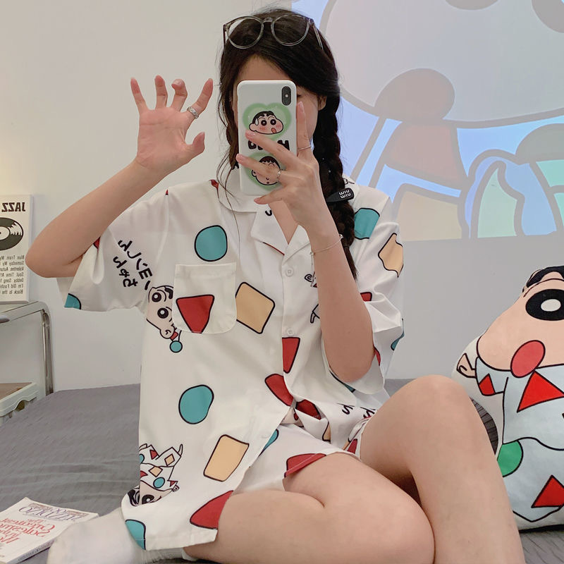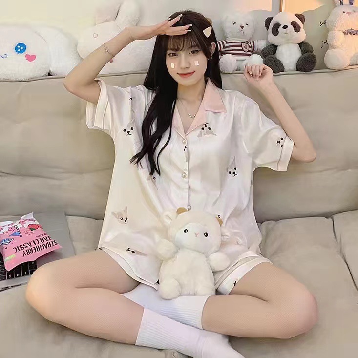 여름 새로운 얼음 실크 잠옷 여자의 반팔 얇은 느슨한 여자의 실크 만화 가정 옷 라이브 세트스토어 가기