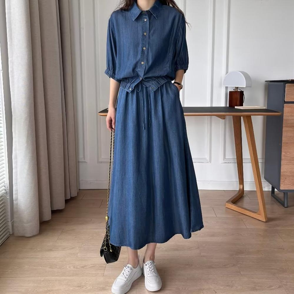 2321 웨스턴 스타일 캐주얼 여름 새로운 라펠 싱글 브레스트 Tencel 데님 셔츠 A 자형 하프 스커트 여성용 투피스 세트