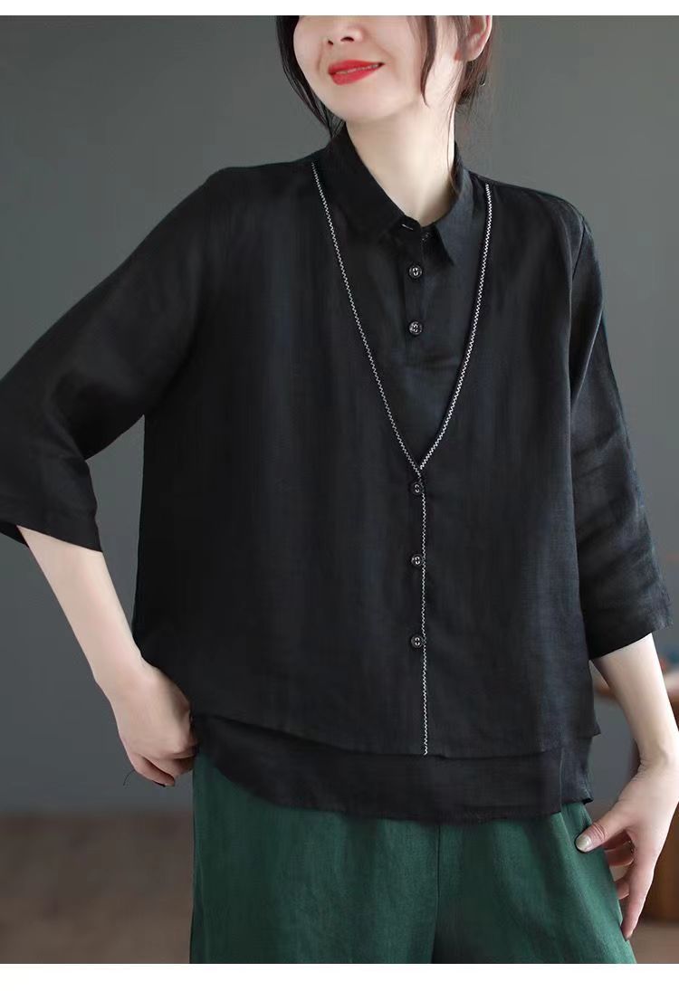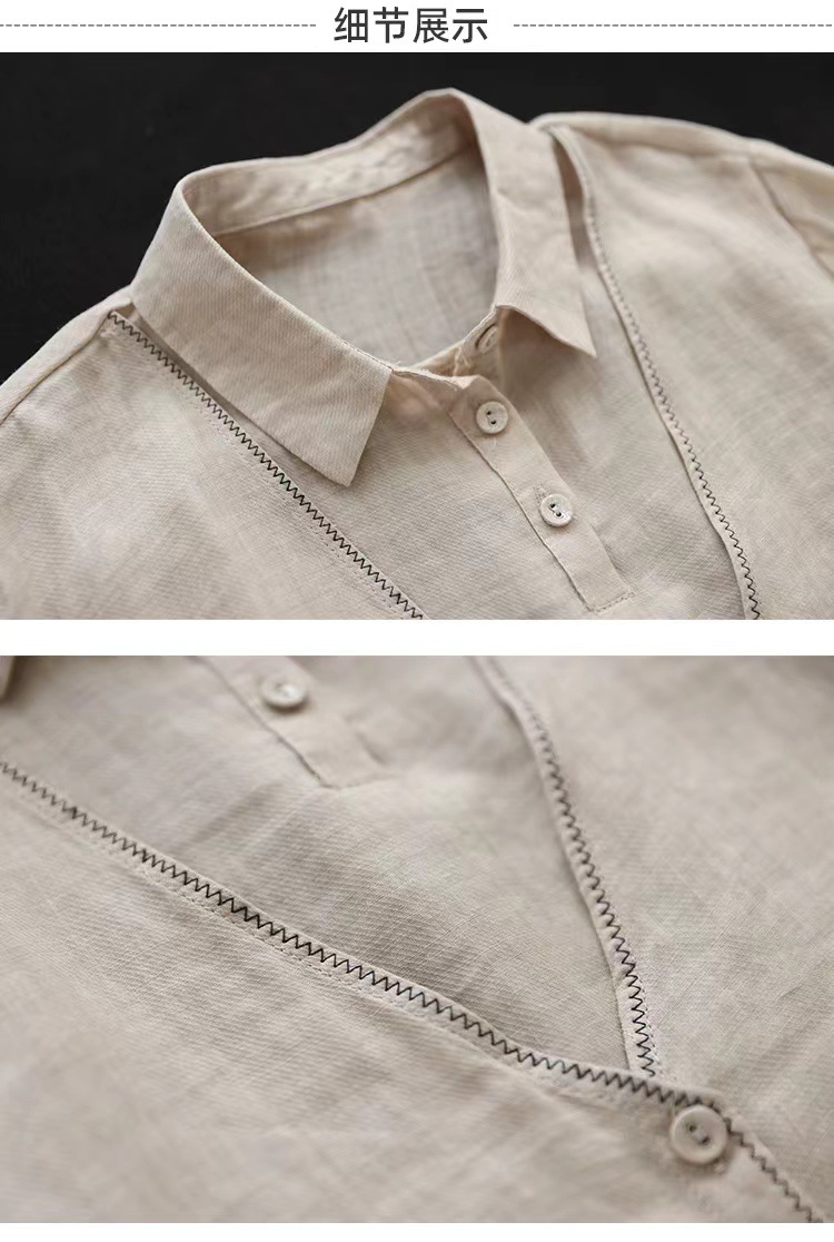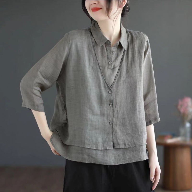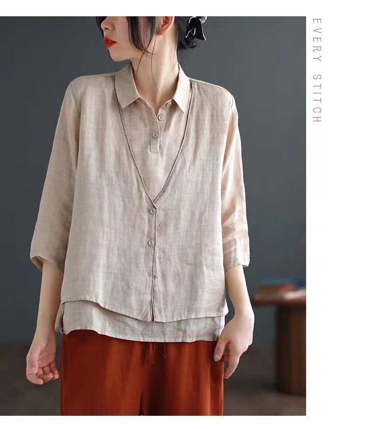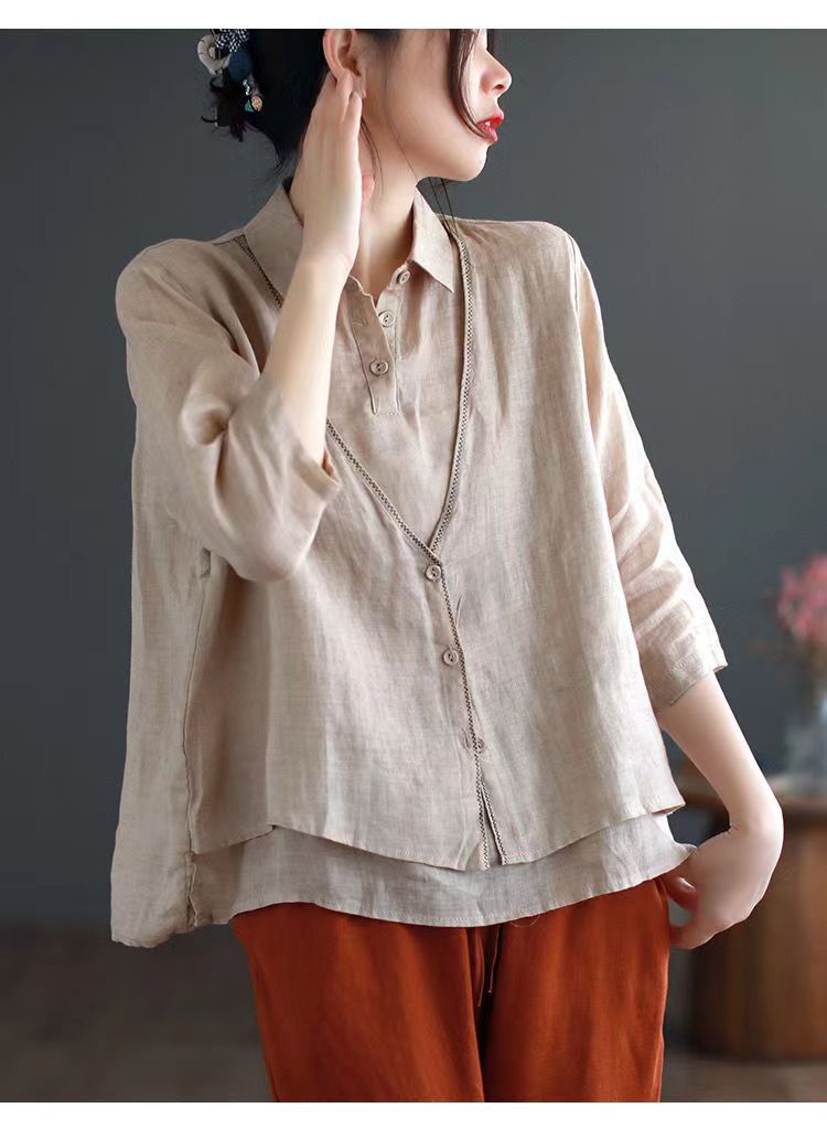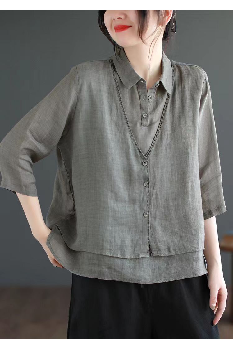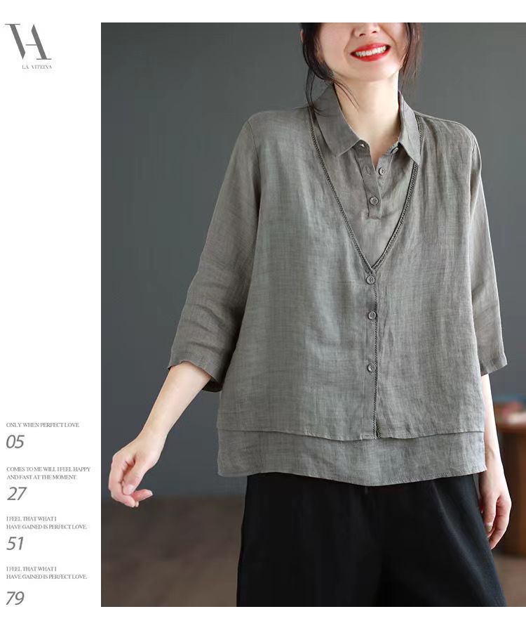 2023 여름 새로운 예술적 느슨한 가짜 2 단색 면 린넨 반 소매 셔츠 여성용 셔츠 탑 #6086