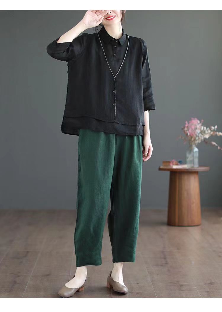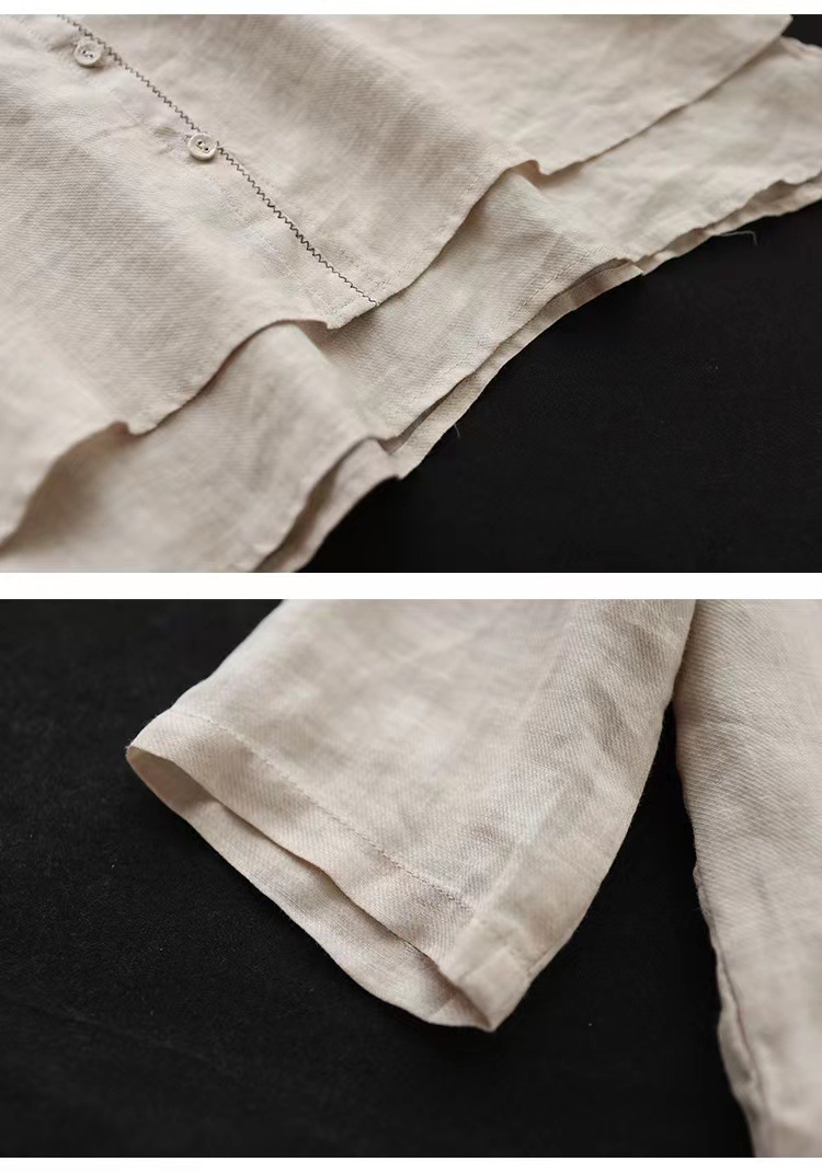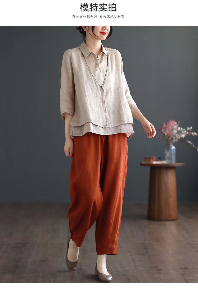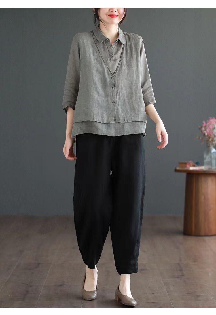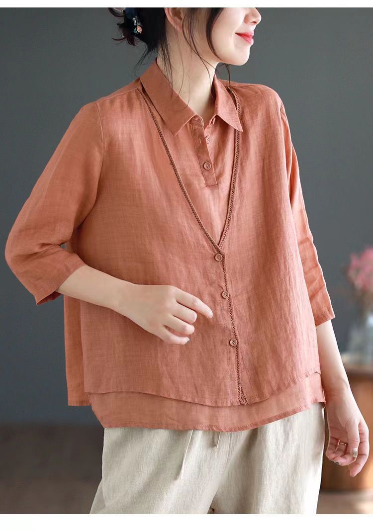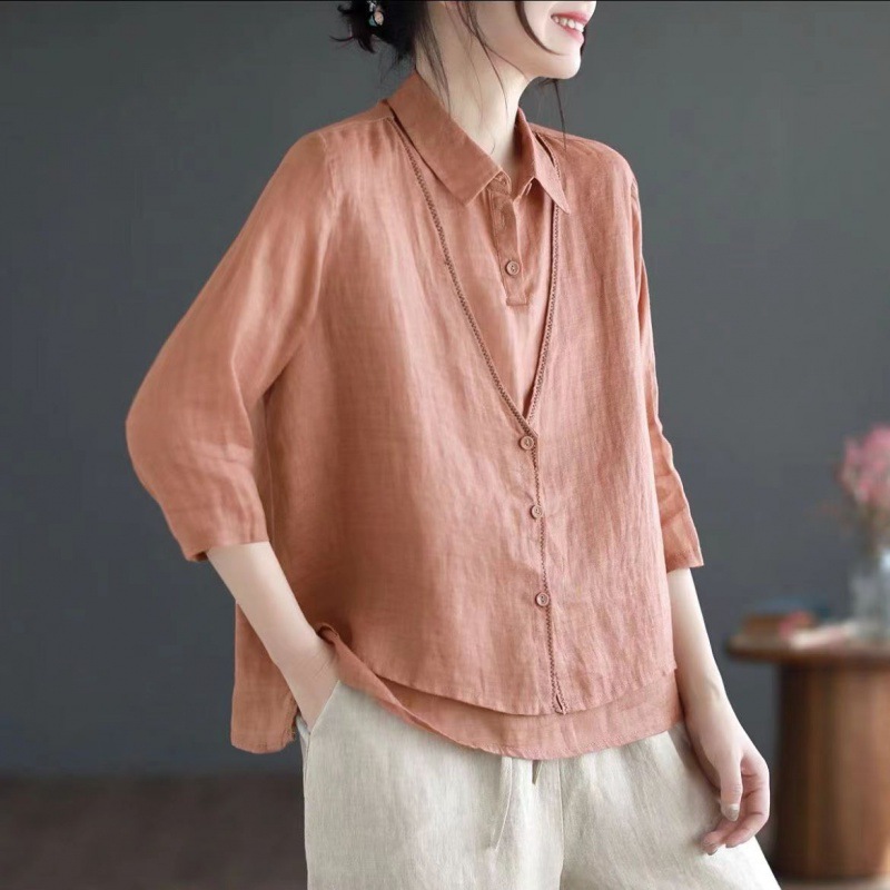 2023 여름 새로운 예술적 느슨한 가짜 2 단색 면 린넨 반 소매 셔츠 여성용 셔츠 탑 #6086