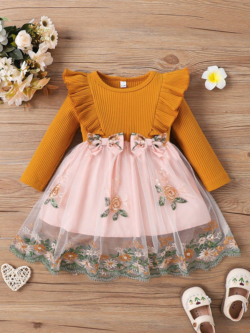 크로스 보더 INS 아기 소녀 봄과 가을 주름 긴 소매 모자이크 꽃 메쉬 유행 원피스 유행