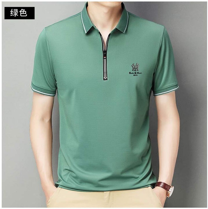 여름 새로운 라펠 지퍼 아이스 실크 반팔 남성용 중년 및 영 유행 캐주얼 단색 남성용 반팔 티셔츠