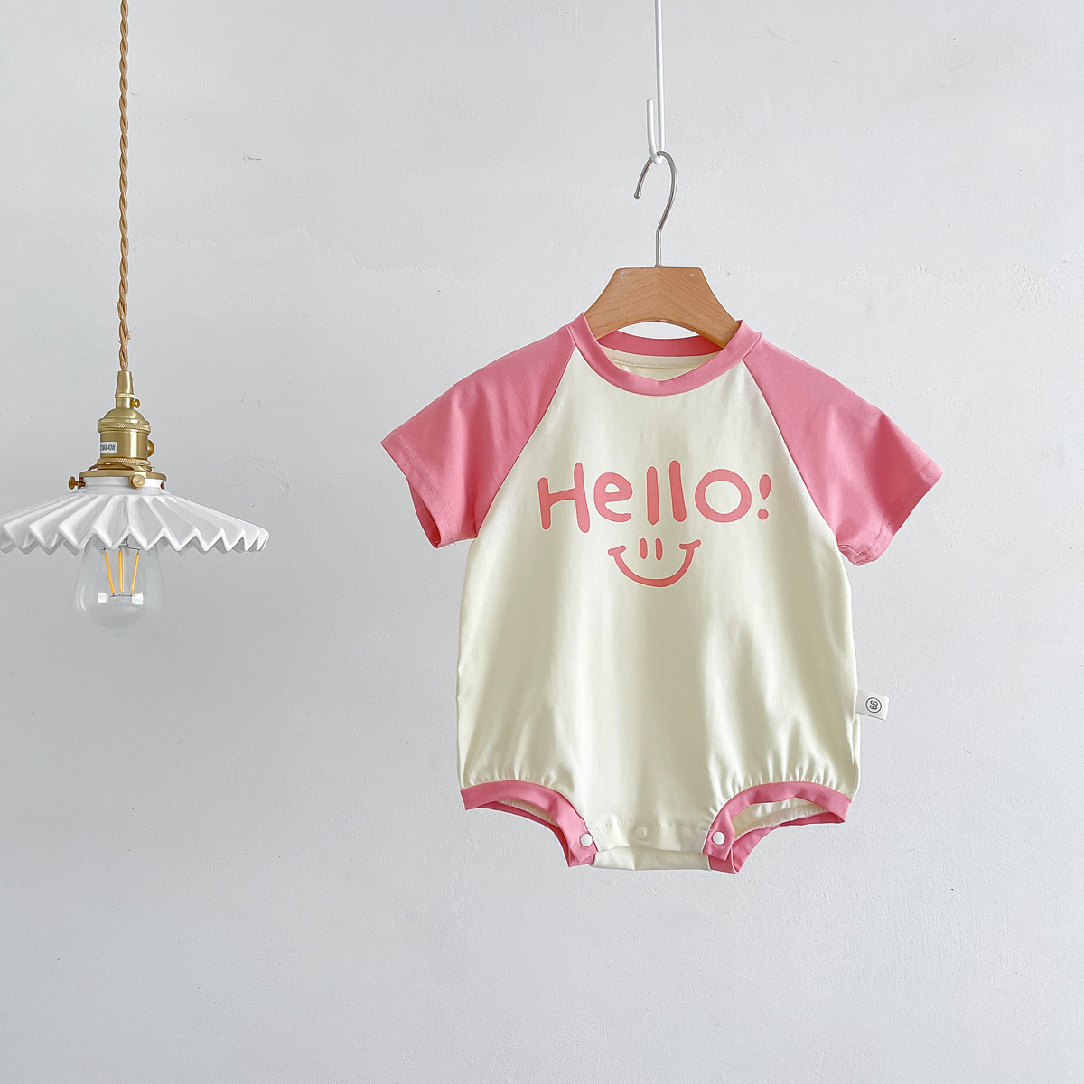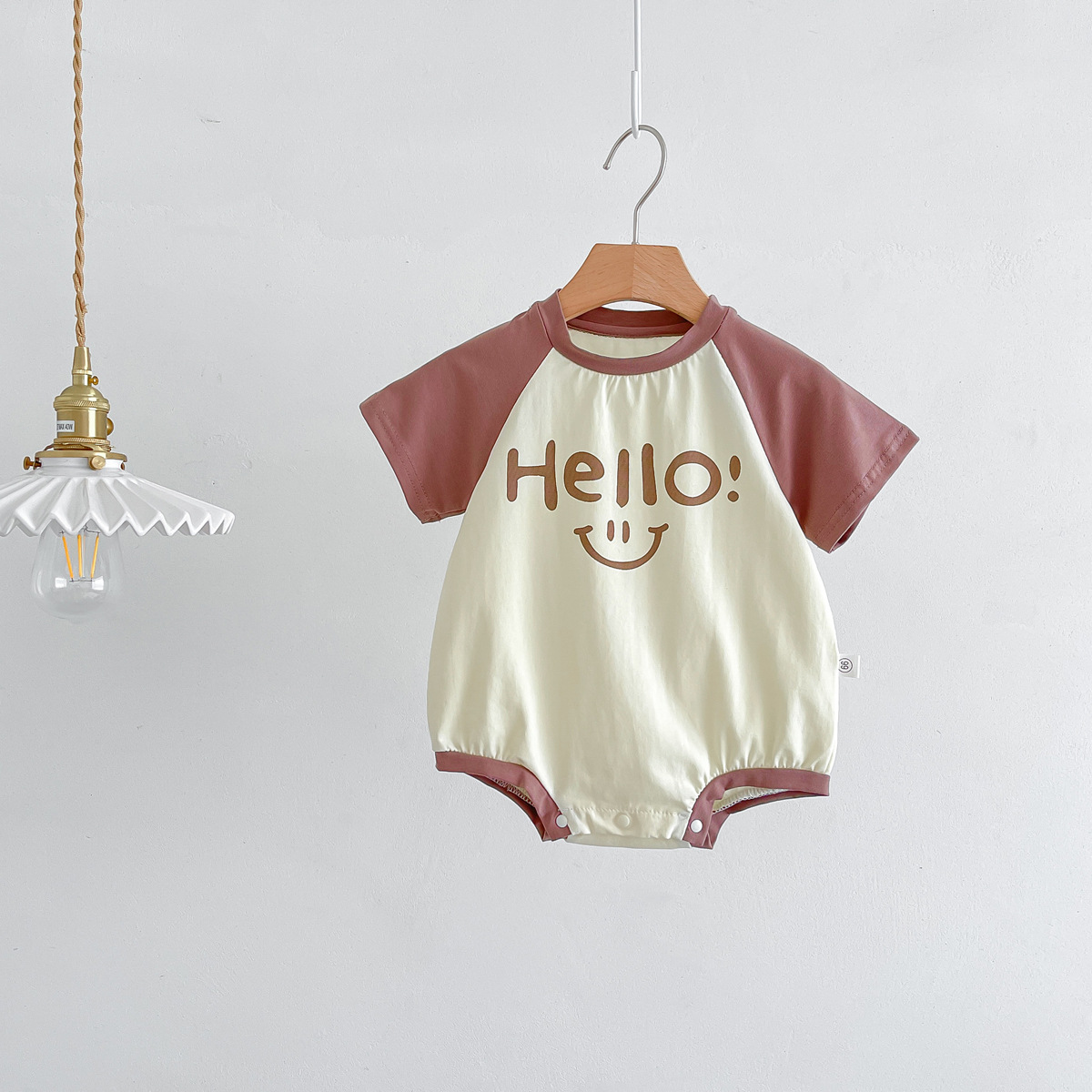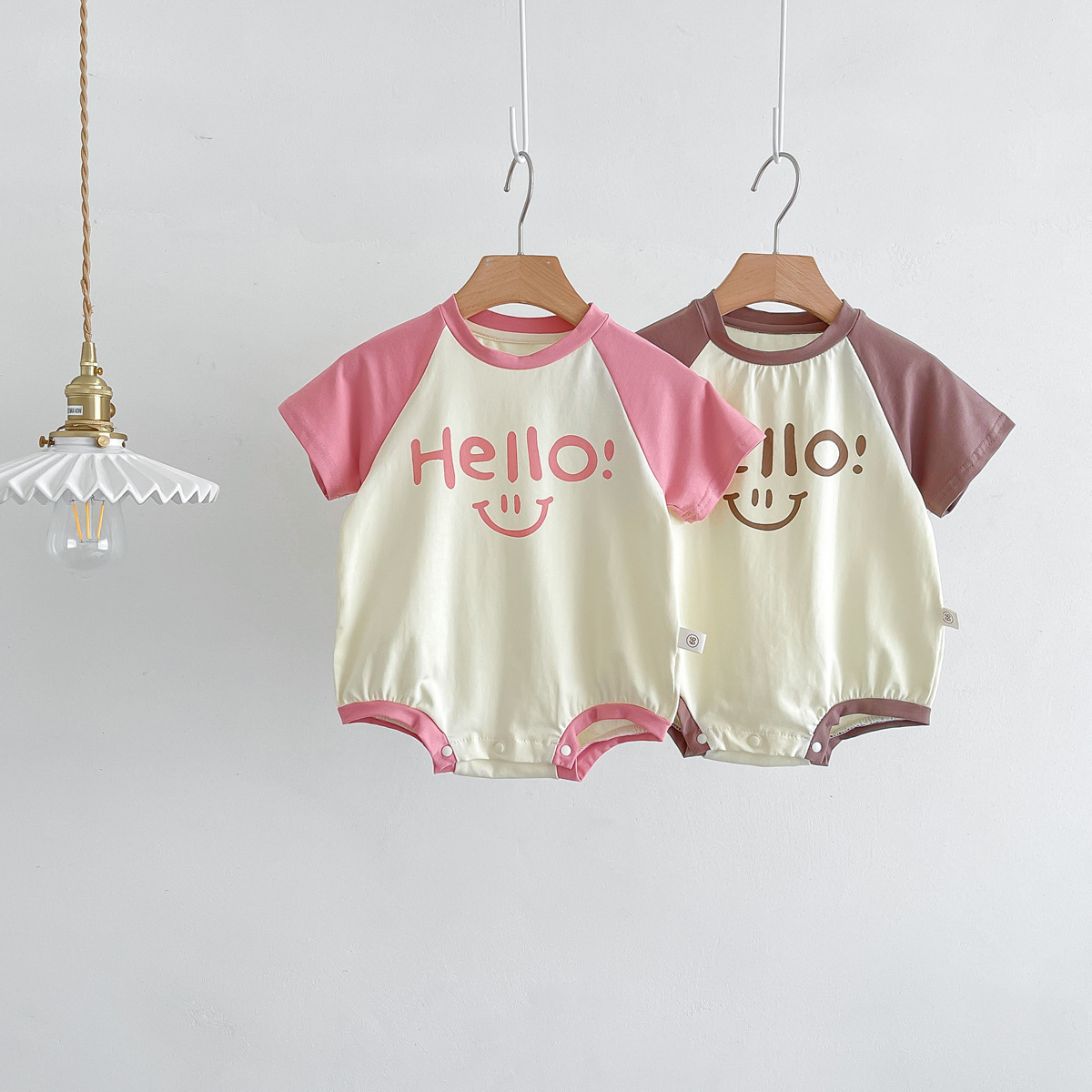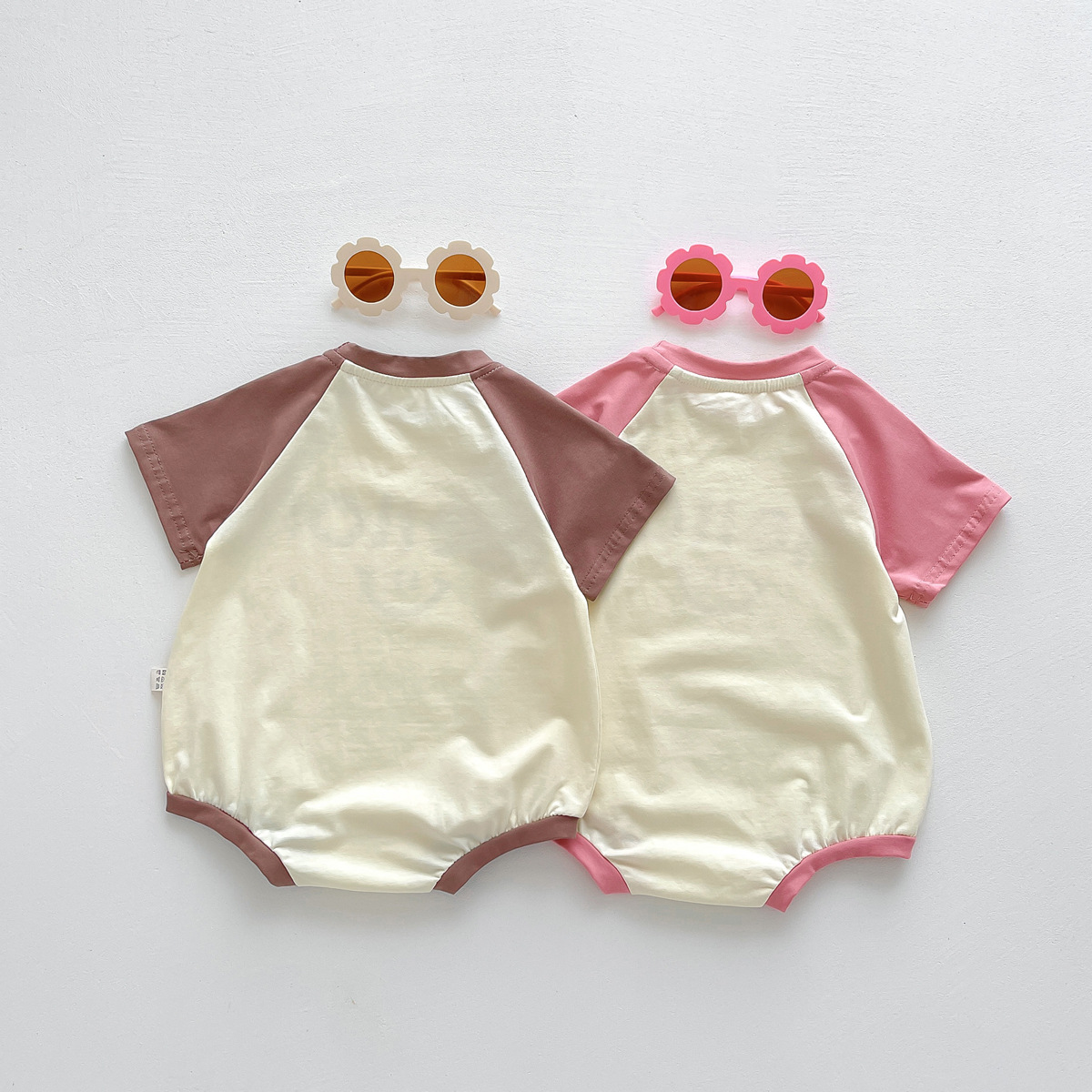 아기 옷 여름 착용 얇은 소년 소녀 아기 점프 수트 신생아 대비 색 반소매 보름달 백일 삼각형 모자스토어 가기