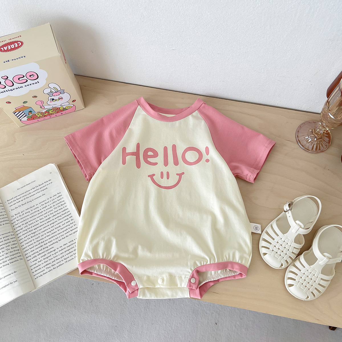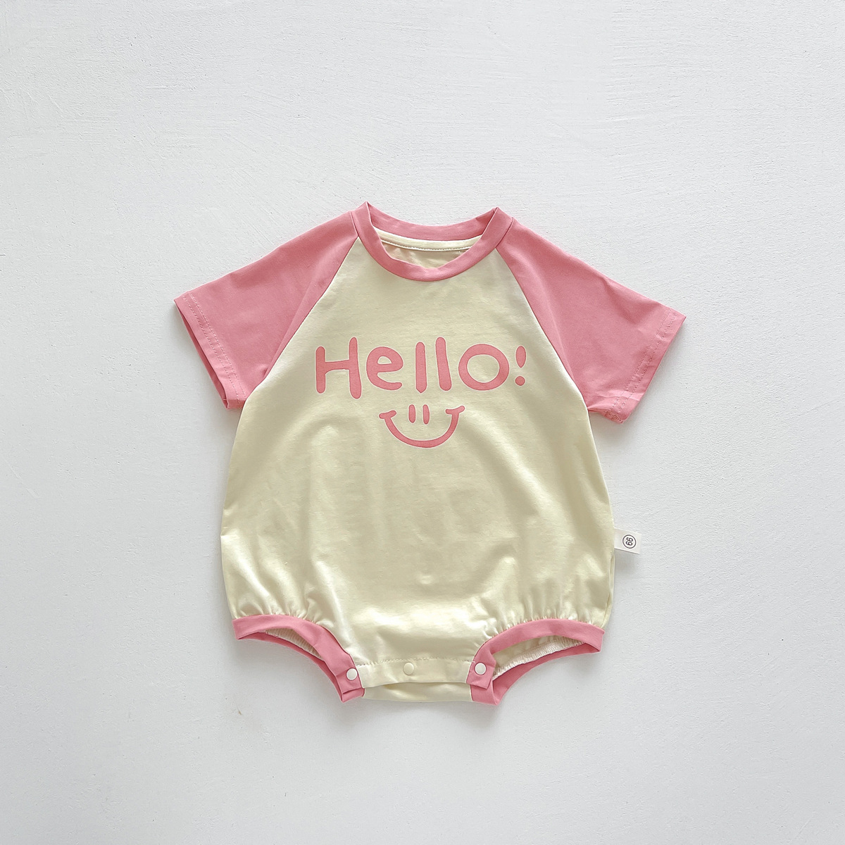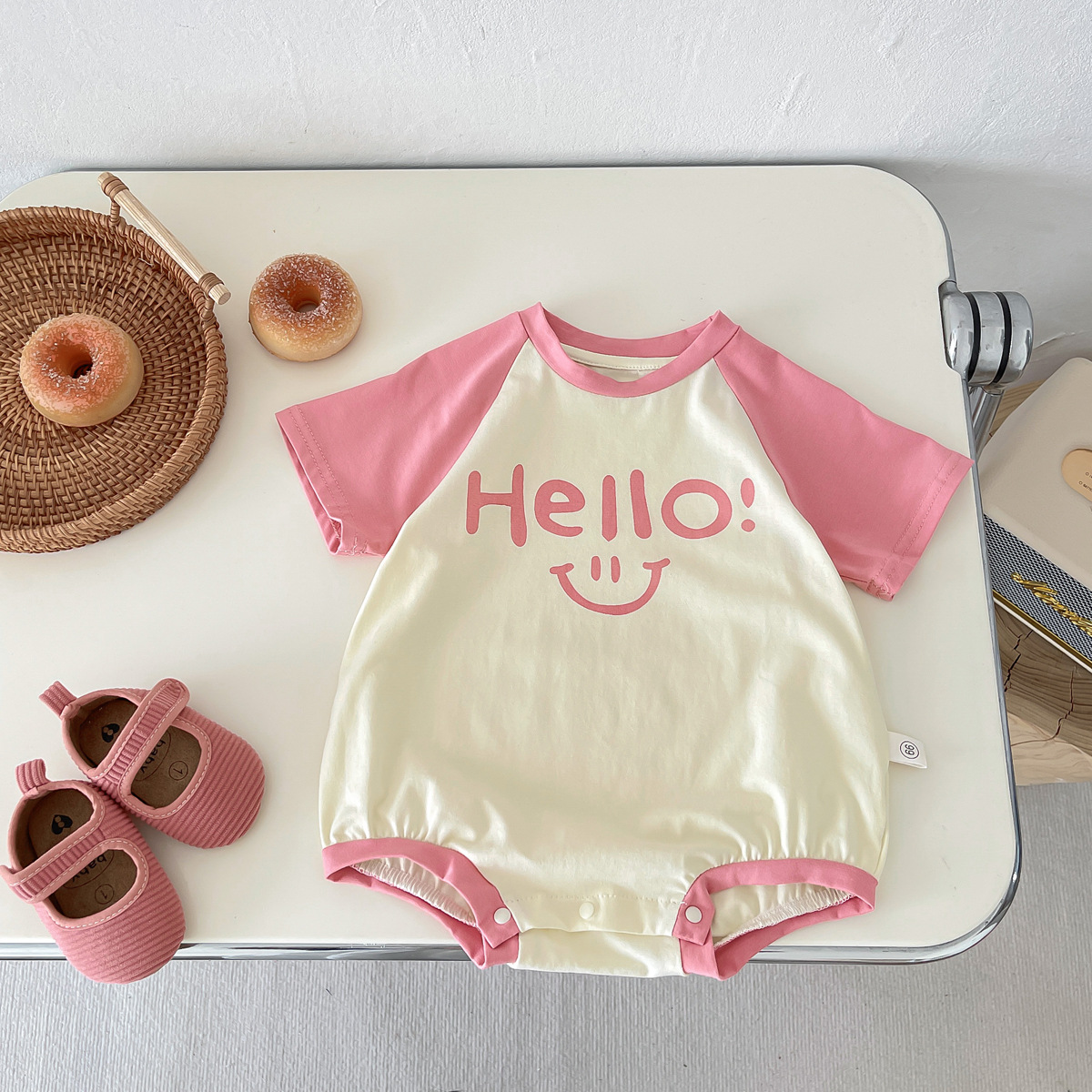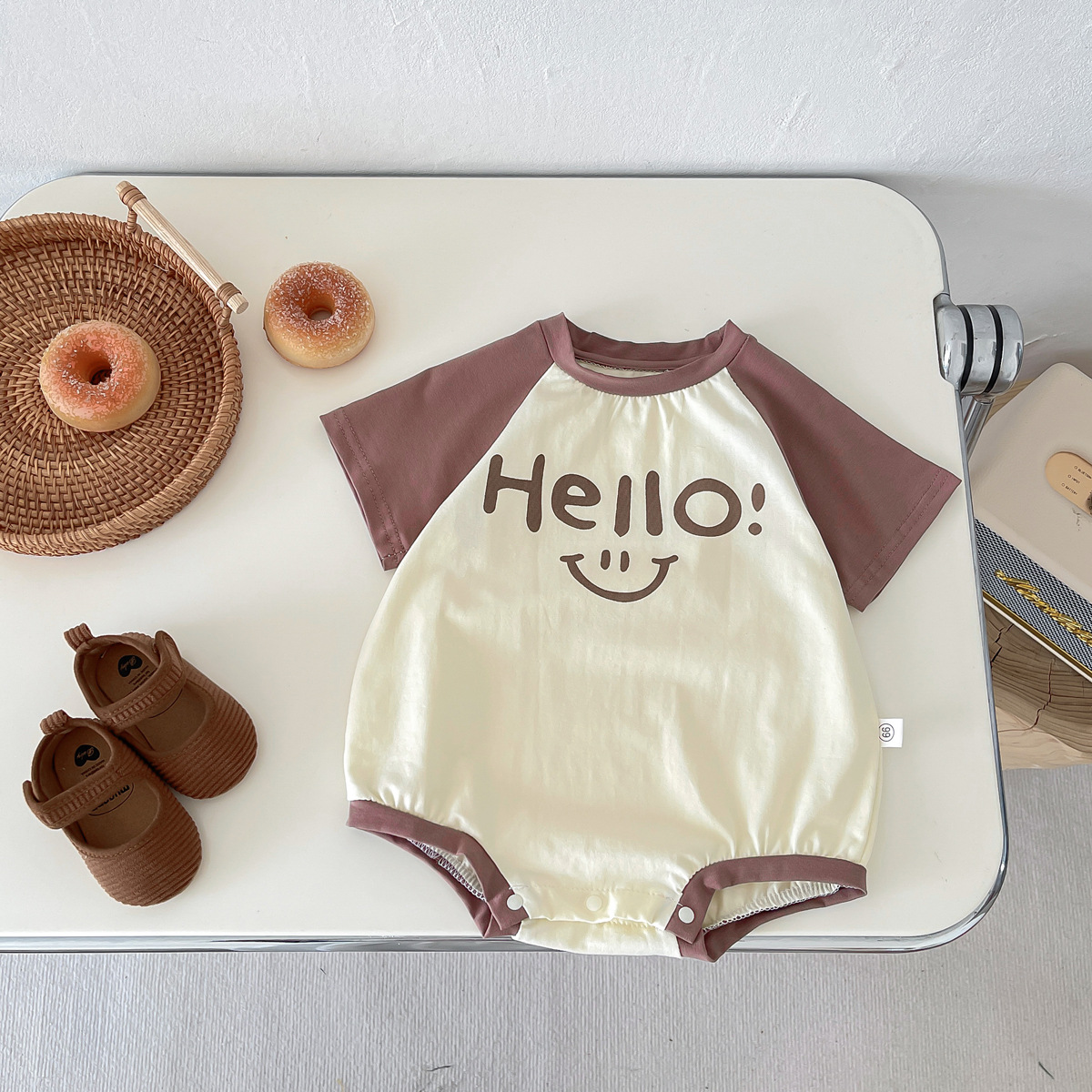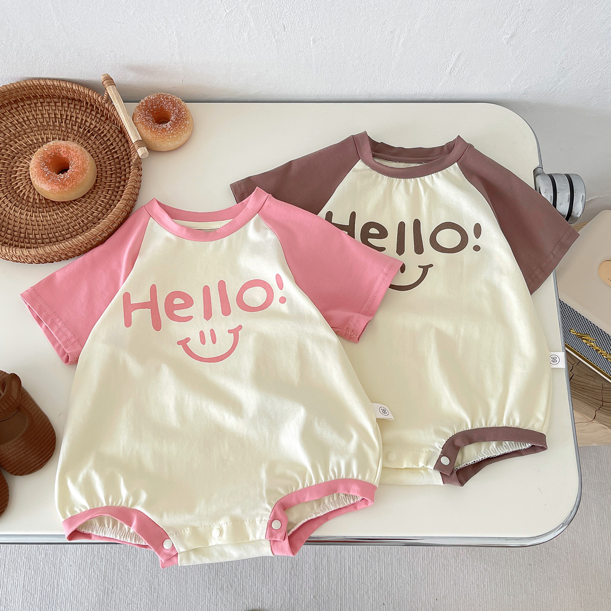아기 옷 여름 착용 얇은 소년 소녀 아기 점프 수트 신생아 대비 색 반소매 보름달 백일 삼각형 모자스토어 가기