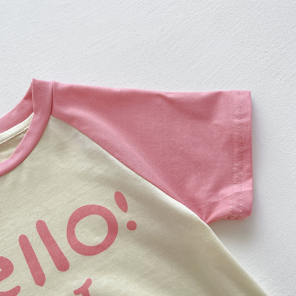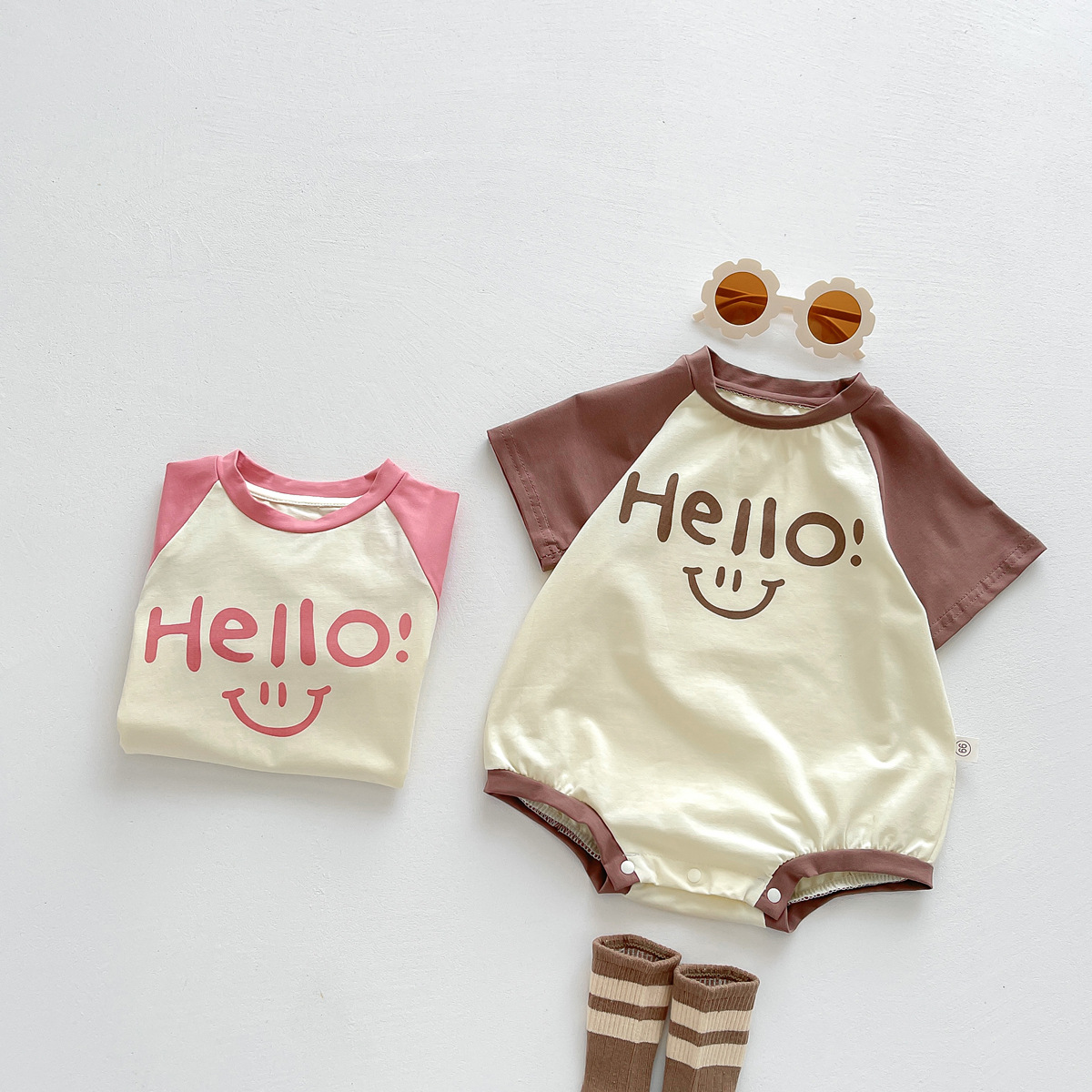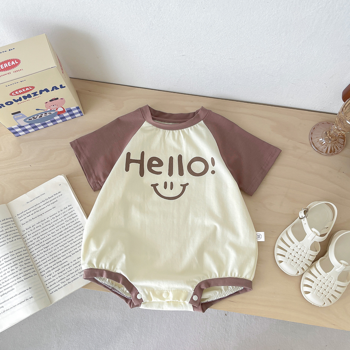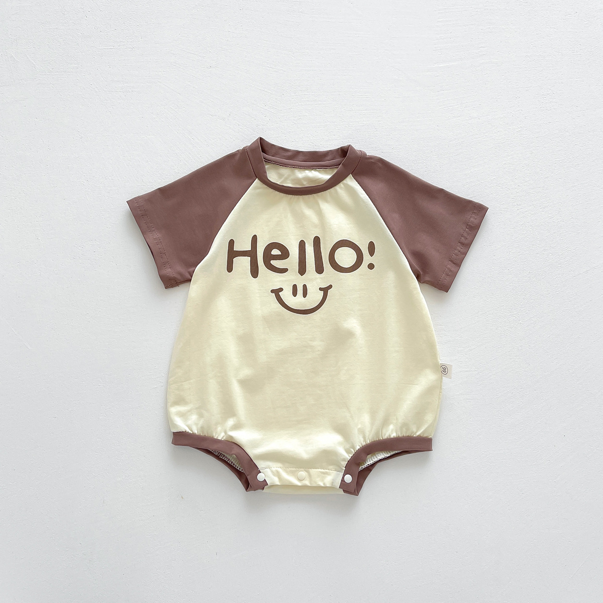아기 옷 여름 착용 얇은 소년 소녀 아기 점프 수트 신생아 대비 색 반소매 보름달 백일 삼각형 모자스토어 가기