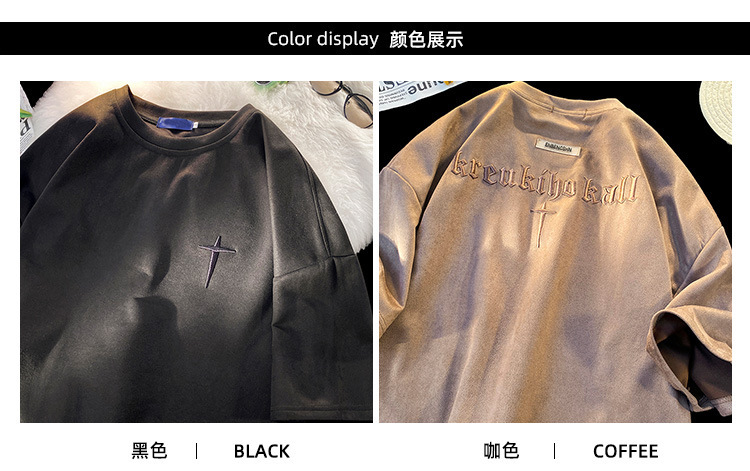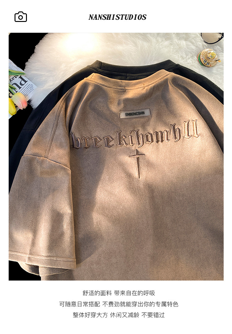 스웨이드 반팔 티셔츠 남성용 여름 새로운 패션 브랜드 아메리칸 스타일 십대를위한 복고풍 무거운 느슨한 반팔 티셔츠스토어 가기
