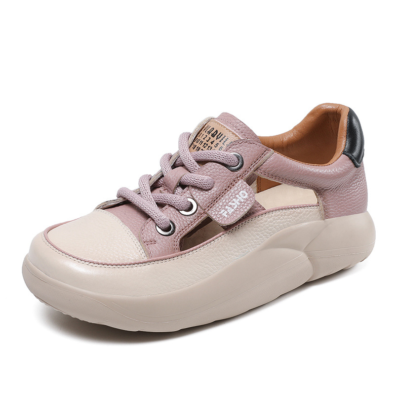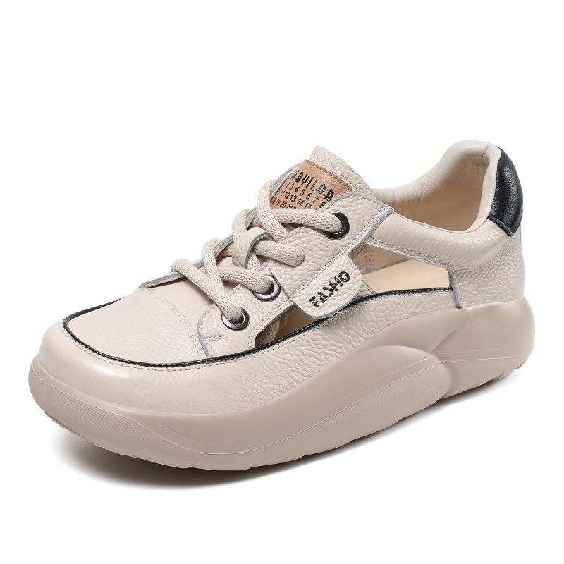 첫 번째 레이어 소가죽 플랫 중공 통기성 캐주얼 신발 라운드 토 레이스업 레트로 샌들 여성용 2023 새로운 여름 모든 매치