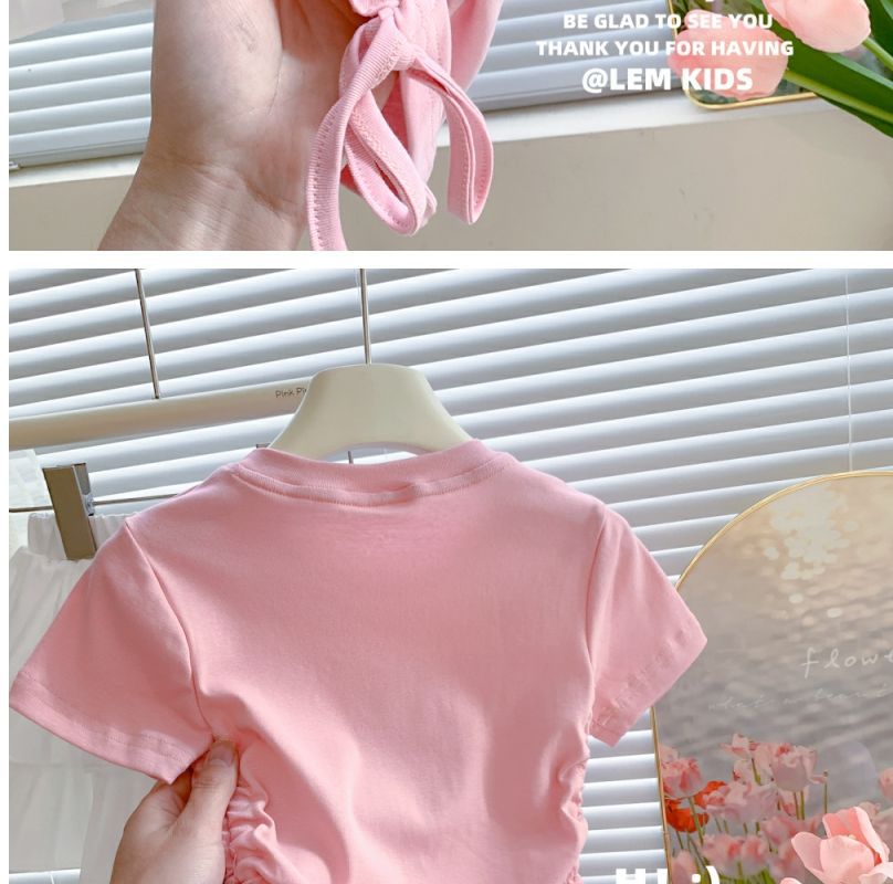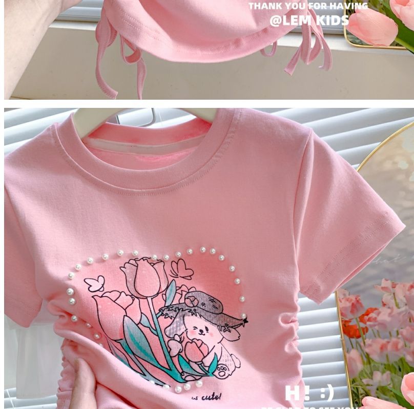 아기 소녀 drawstring 반팔 얼음 실크 탑 25 여름 새 여자 진주 사랑 달콤한 만화 반팔 티셔츠