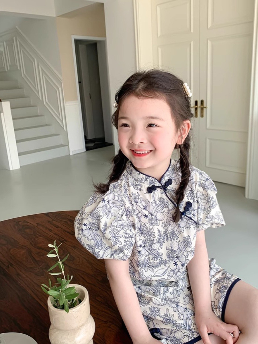 여자 원피스 여름 새로운 국가 스타일 잉크 페인팅 복고풍 플레이트 버클 치파오 스커트 어린이 머리카락의 세대