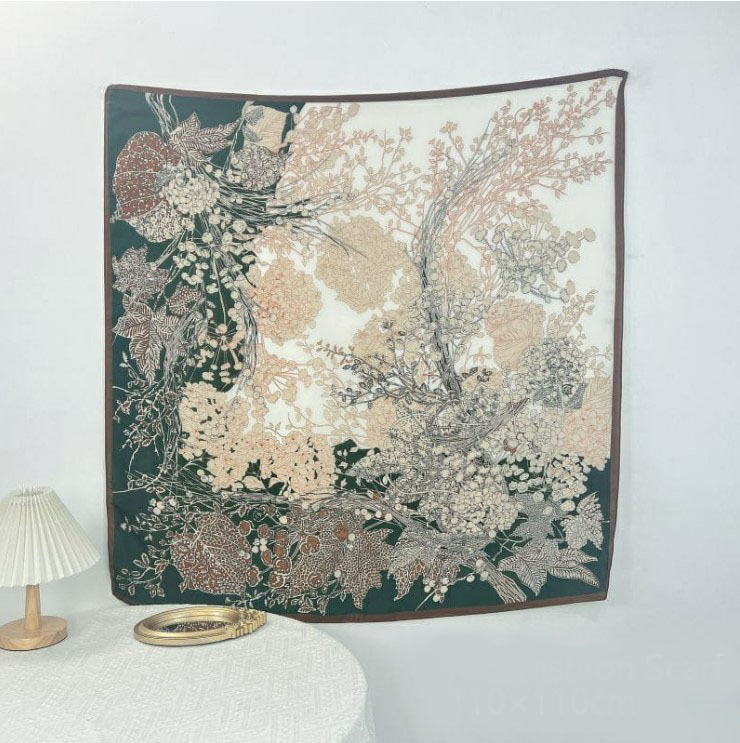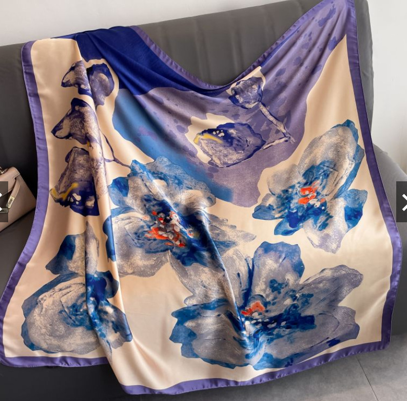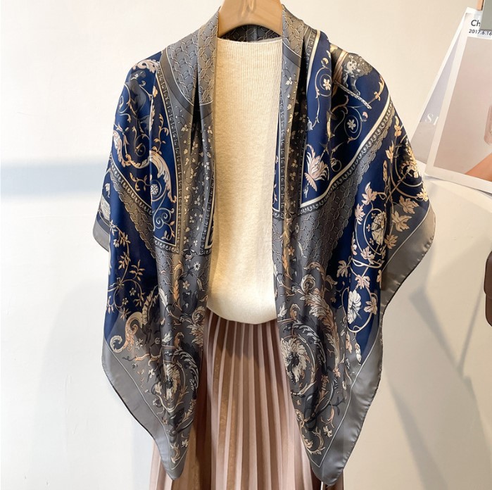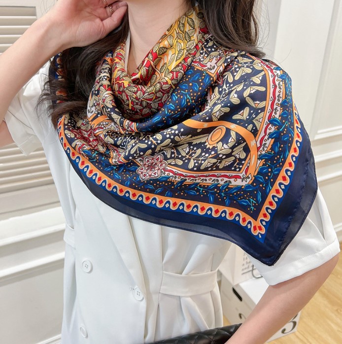 봄과 여름 새로운 110cm 리 브로케이드 새틴 대형 스퀘어 스카프 여성용 얇은 자외선 차단제 숄 내셔널 스타일 인쇄 실크 스카프 말레이 머리 스카프