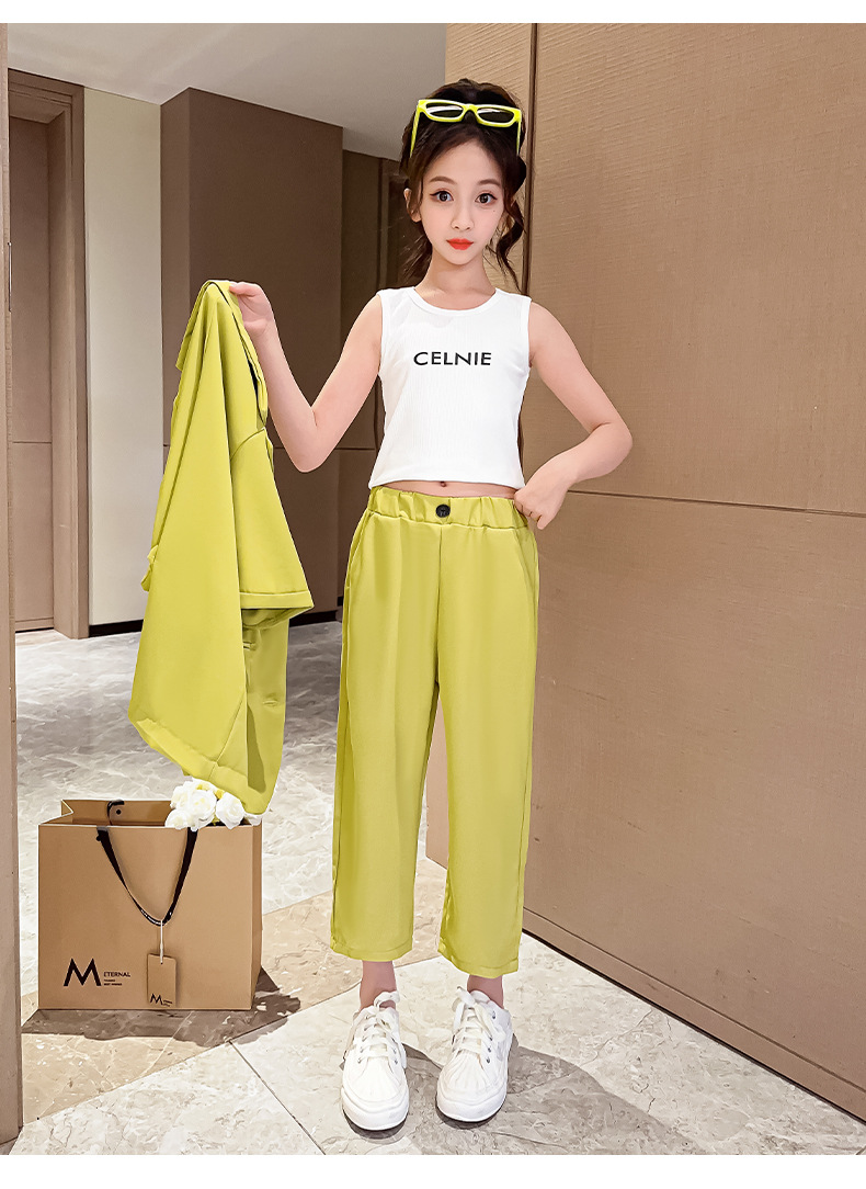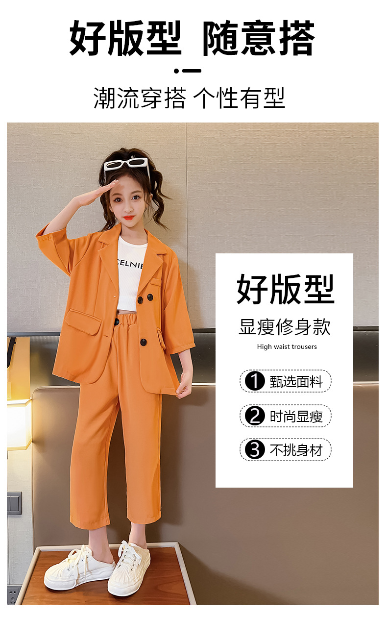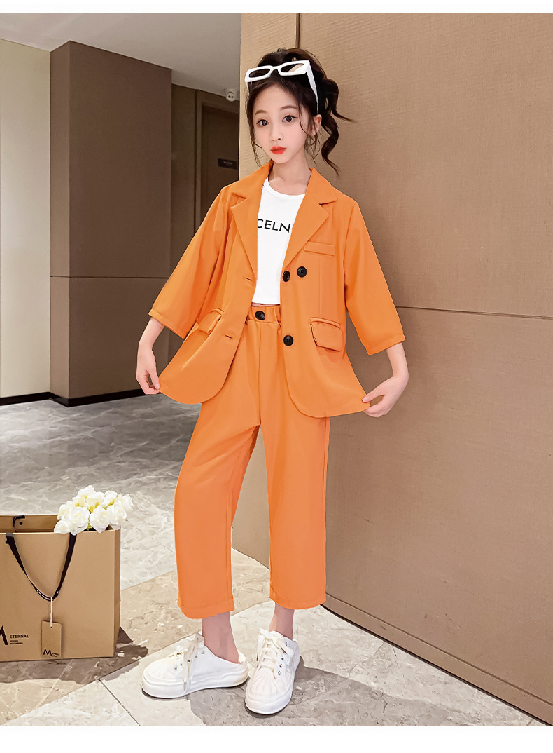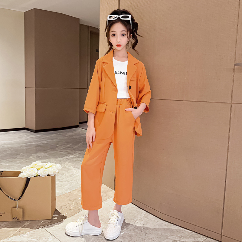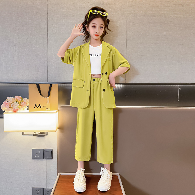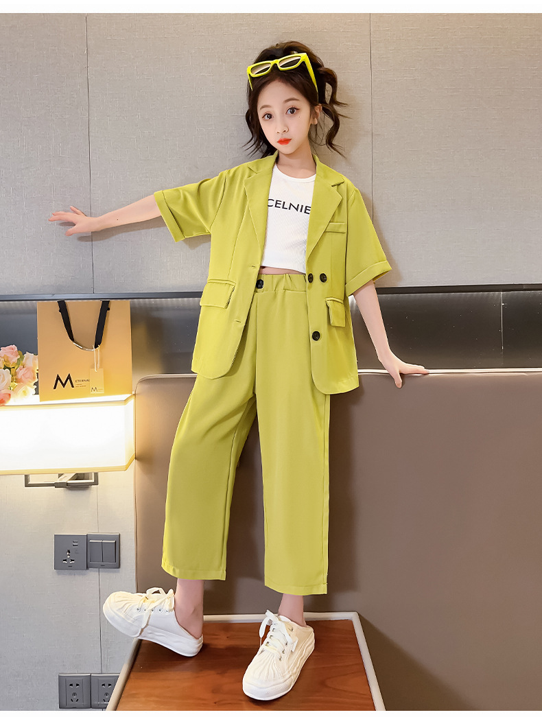 여자 여름 정장 2025 새로운 어린이 반팔 정장 여자 유행 얇은 7부 바지 3 피스 세트