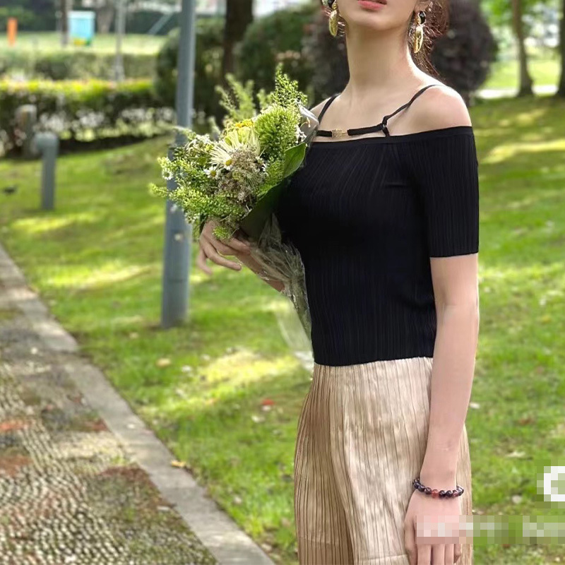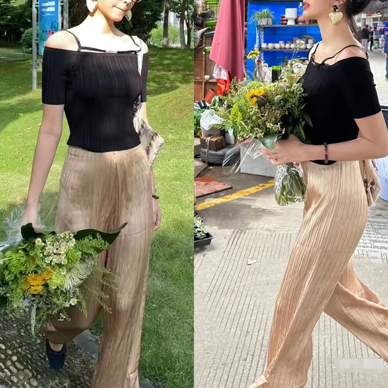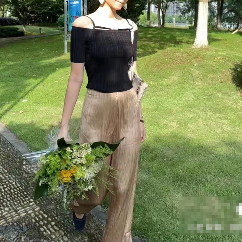Yang Caiyu 같은 스타일] 여름 오프 숄더 니트 셔츠 린넨 느슨한 캐주얼 작은 접힌 바닥 바지