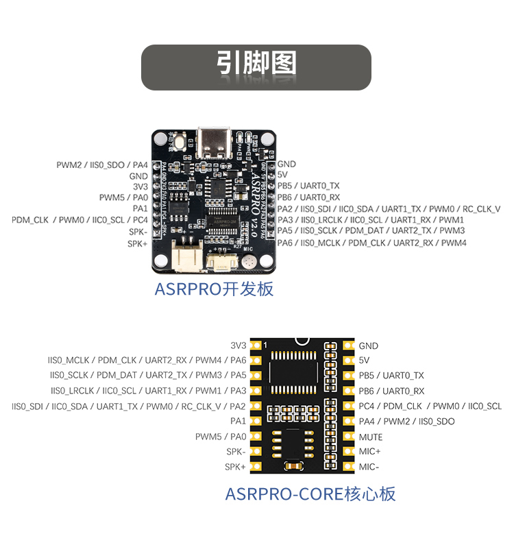 核心板和开发板的区别:两者的芯片是一样的,但是开发板有板载麦克风和喇叭接口,可以直接使用数据线下载程序;而核心板没有外设接口,并且只能使用下载器下载。