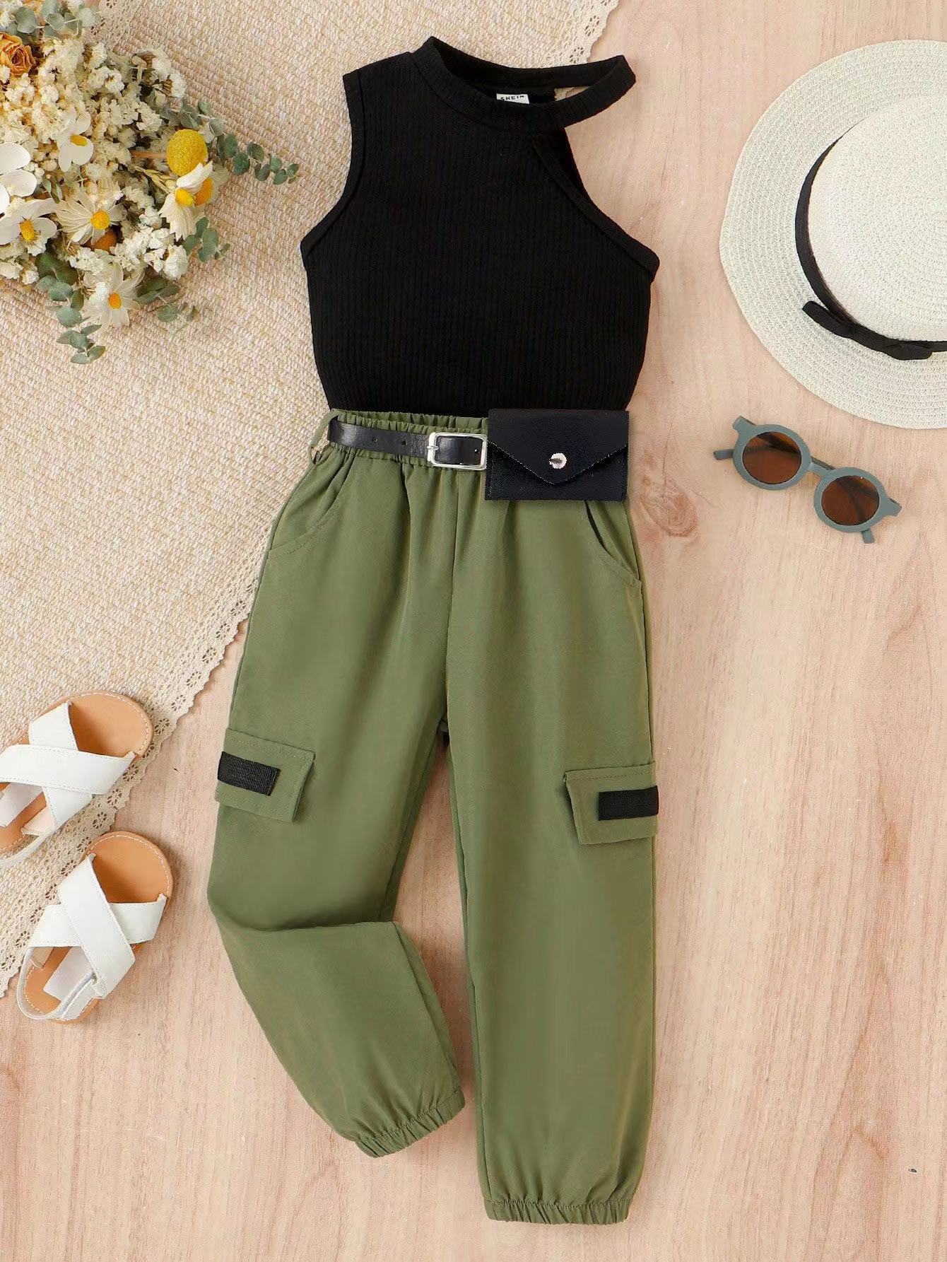 Baopai 아동복 유럽과 미국 봄과 여름 여아 민소매 어깨 조끼 바지 허리 팩 3 종 세트 여아 유행 세트