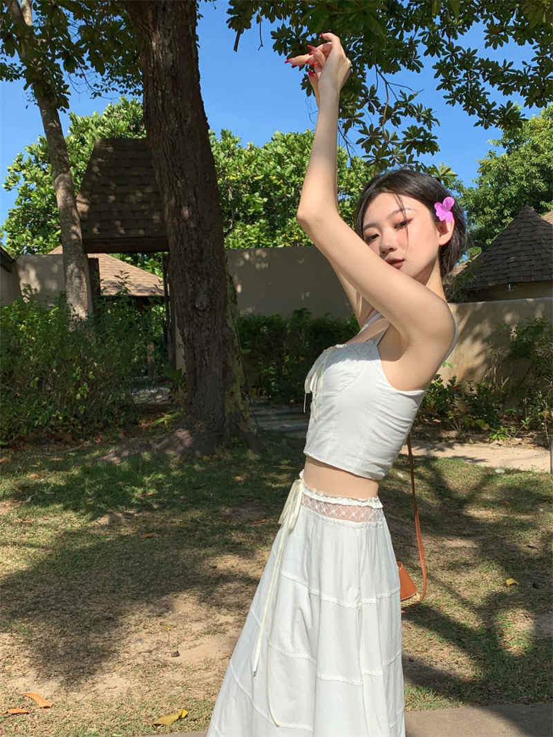 여름 스퀘어 칼라 스트랩 탑 여자의 하이 웨이스트 슬림 봐 긴 원피스 바느질 레이스 세트 여자스토어 가기