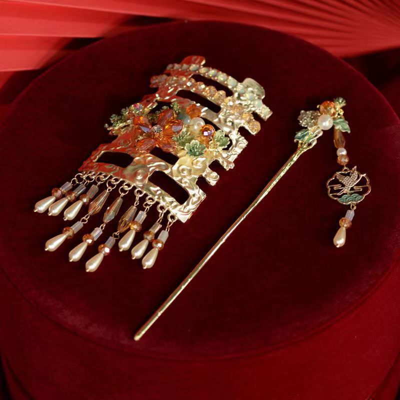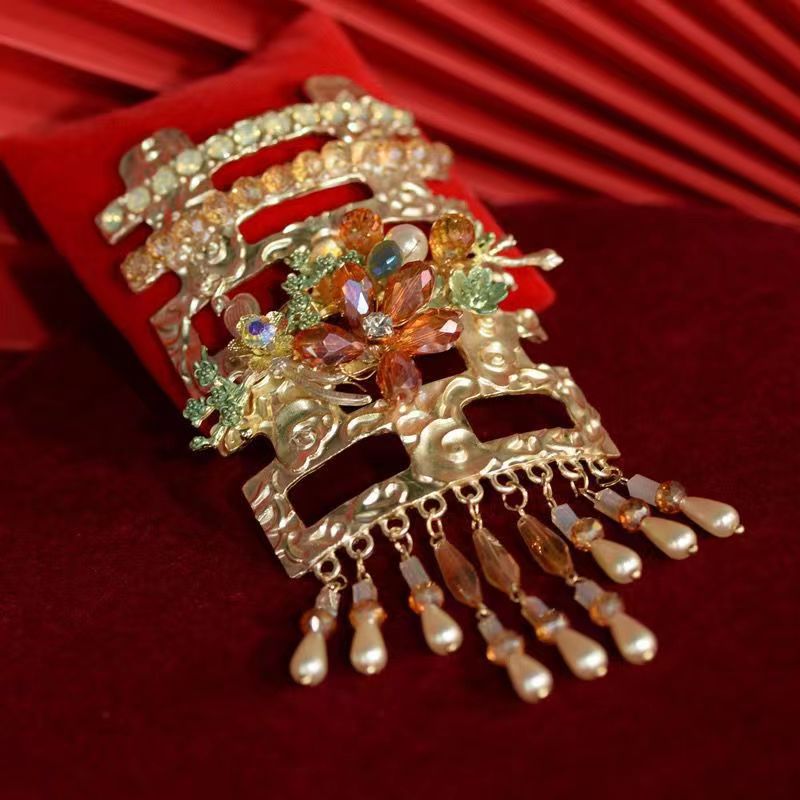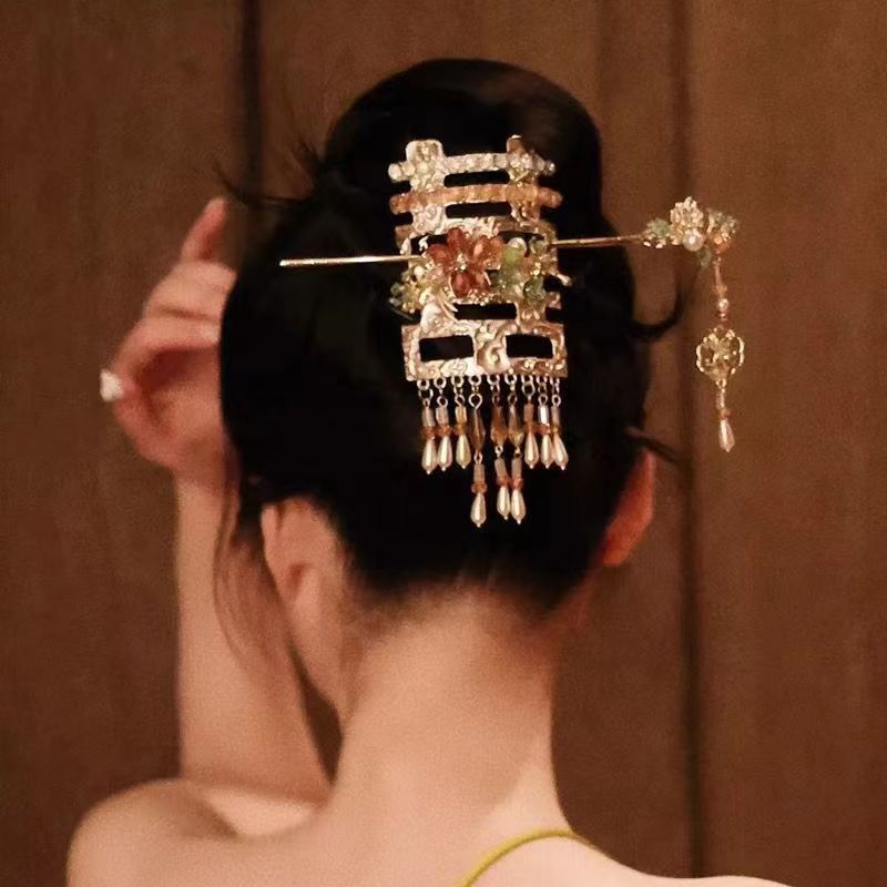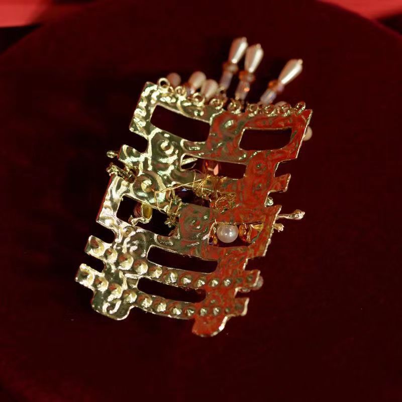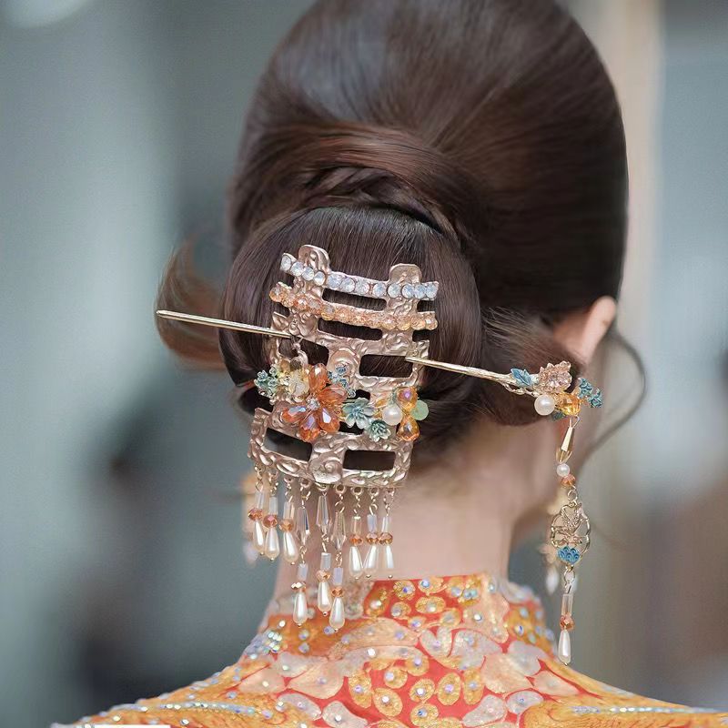 새로운 중국 신부 머리핀 접시 머리 골동품 두 배 행복 황금 술 모자 Xiuhe 원피스 치파오 아침 원피스 웨딩 머리핀스토어 가기