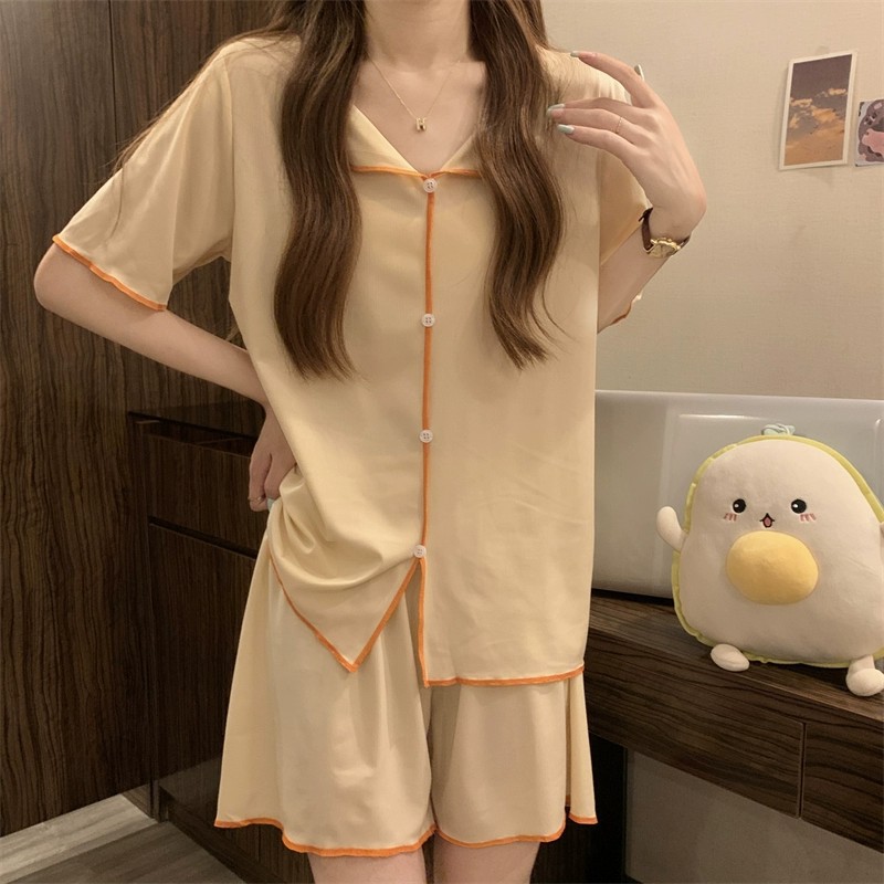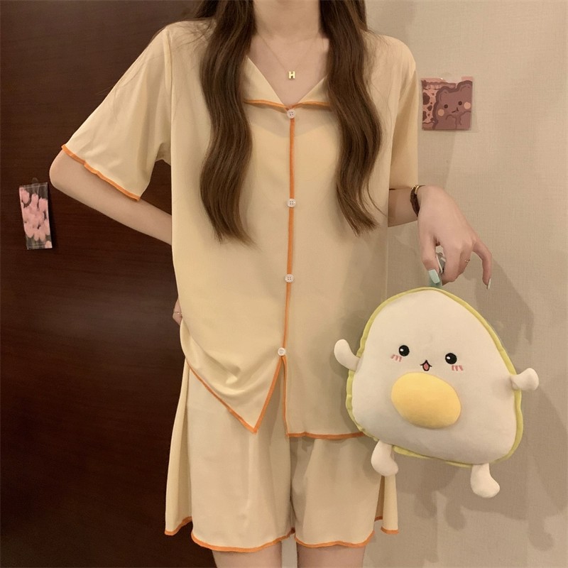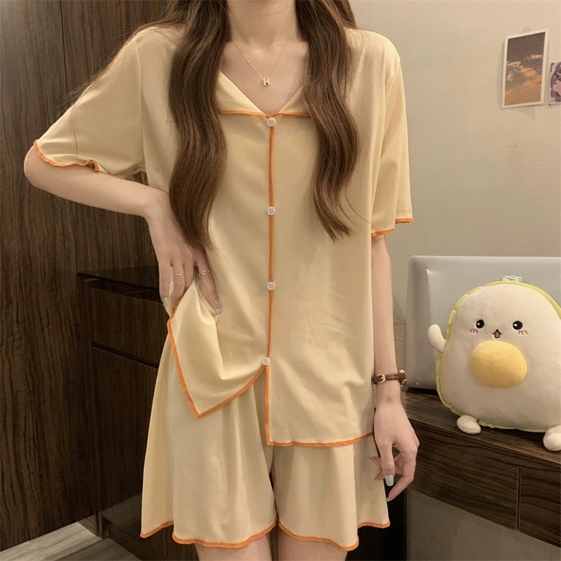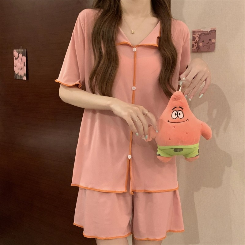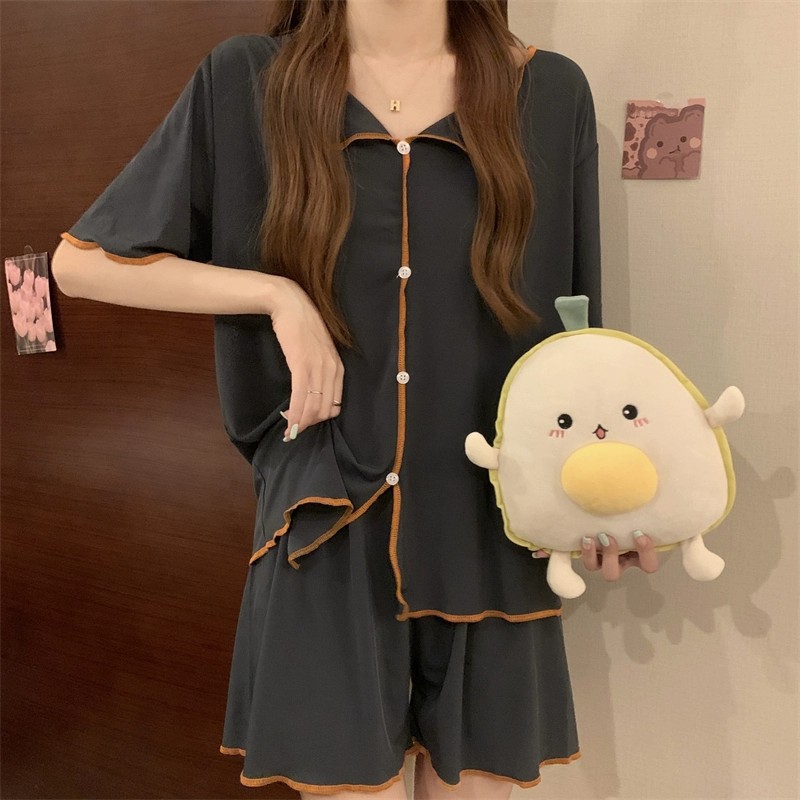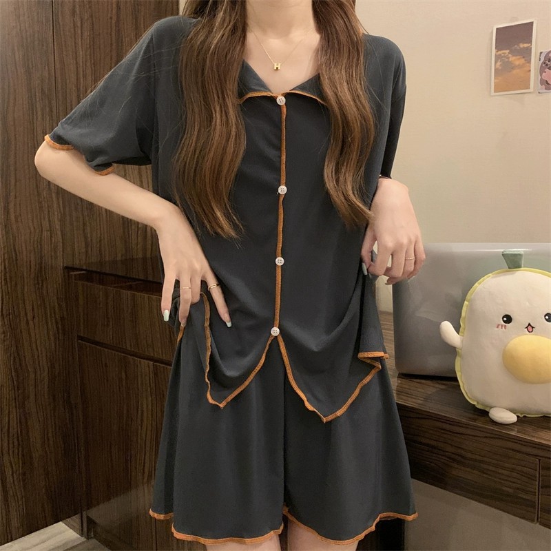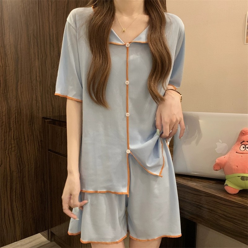 반팔 잠옷 여성 QQ 세트 한국식 얇은 가짜 카디건 옷깃 단추 심플 아이스 실크 시원한 요정 가정 옷