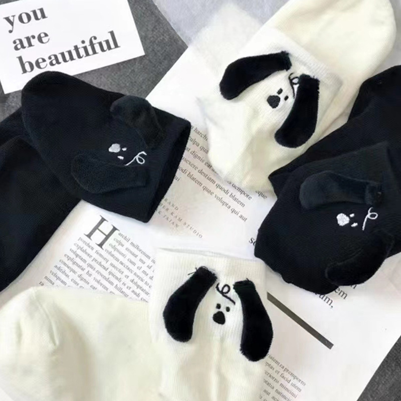 봄과 여름 양말 여성용 얇은 강아지 양말 귀여운 만화 입체 흑백 자수 짧은 튜브 여자 양말
