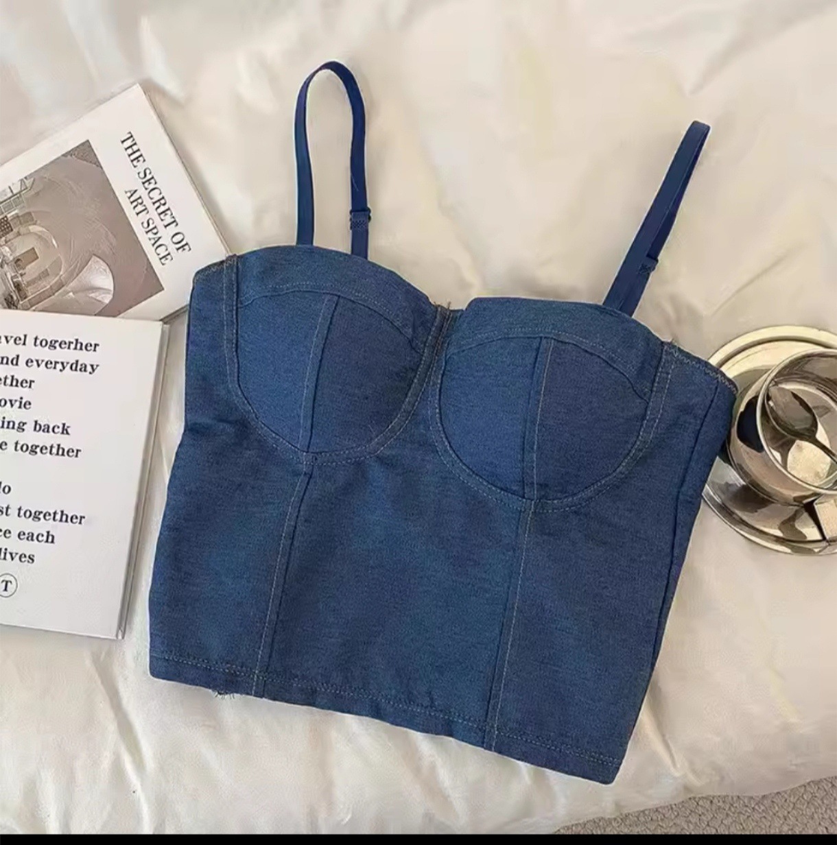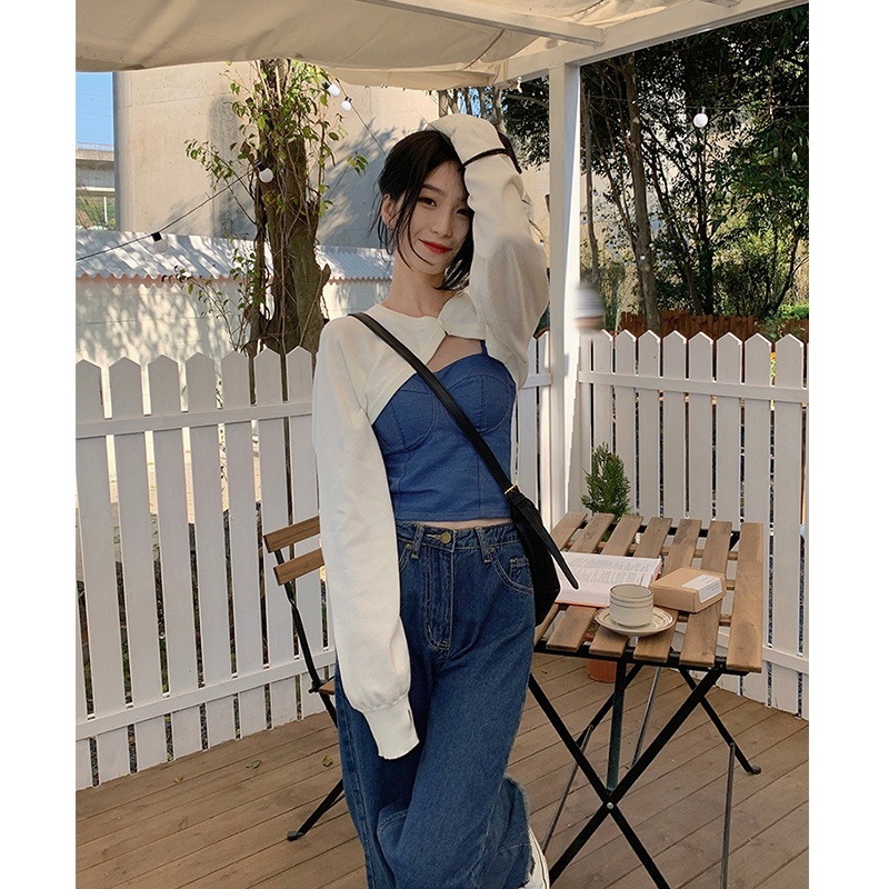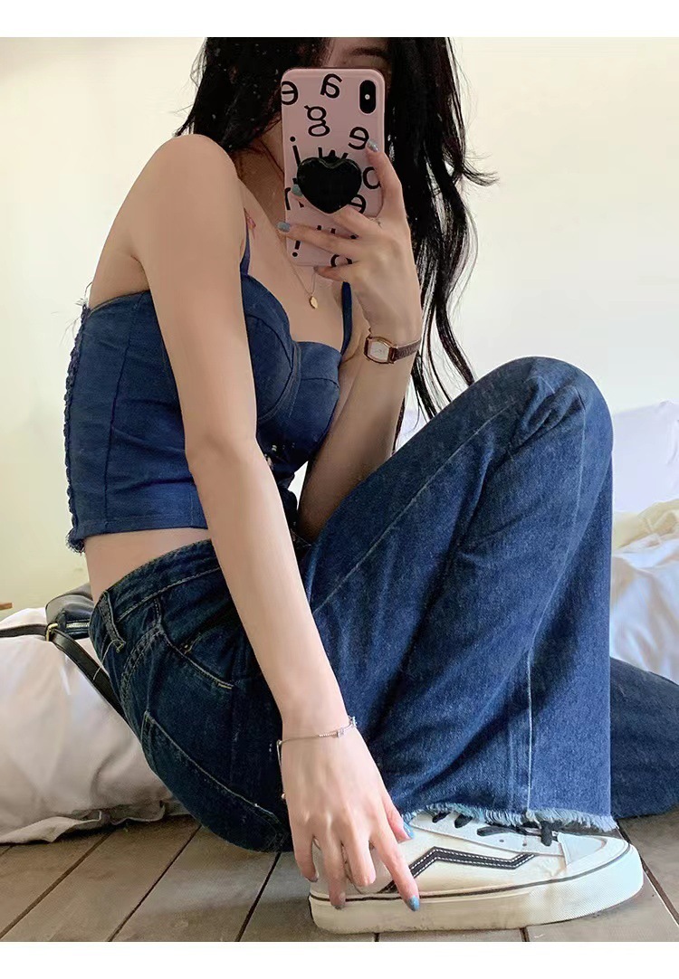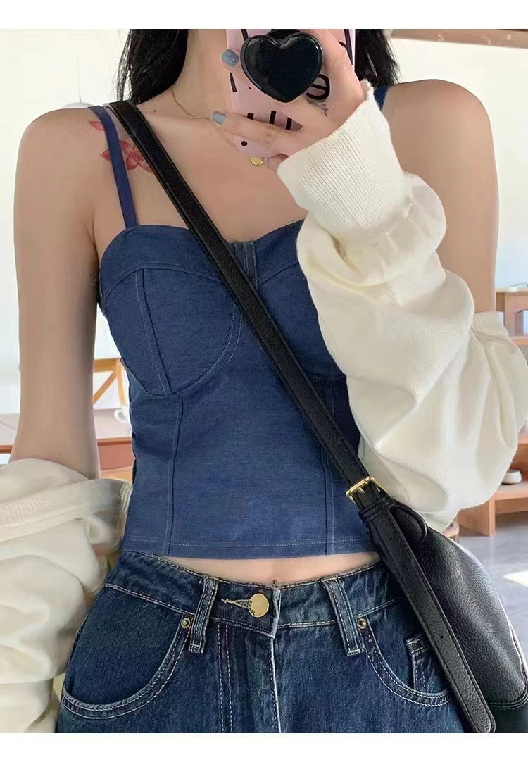 새로운 홍콩 스타일 데님 멜빵 가슴 패드 배꼽 조끼 모든 경기 아우터 웨어 민소매 탑 여성용 베이스 셔츠 끈이 없는 아름다운 등스토어 가기