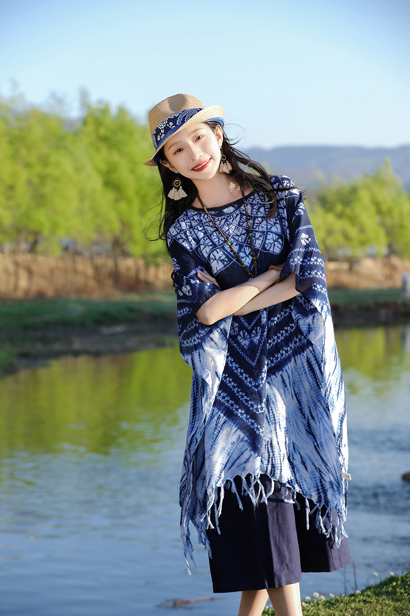 Yunnan Lijiang 여행 스카프 여성용 빈티지 예술적 블루 염료 풀오버 숄 차양 자외선 차단제 망토 따뜻한 코트