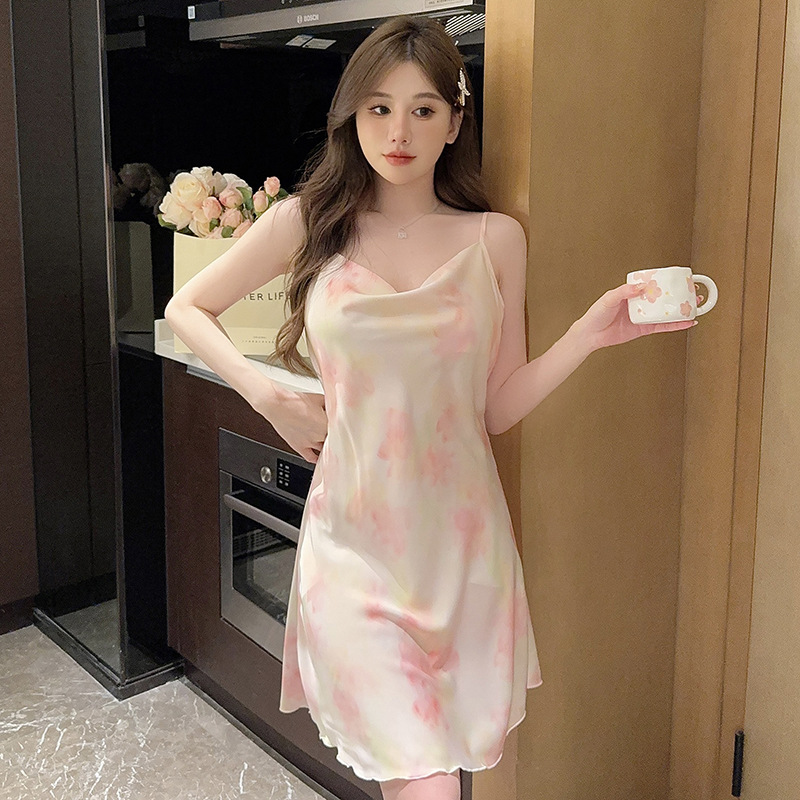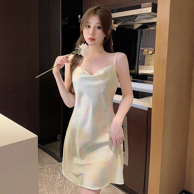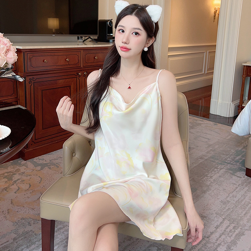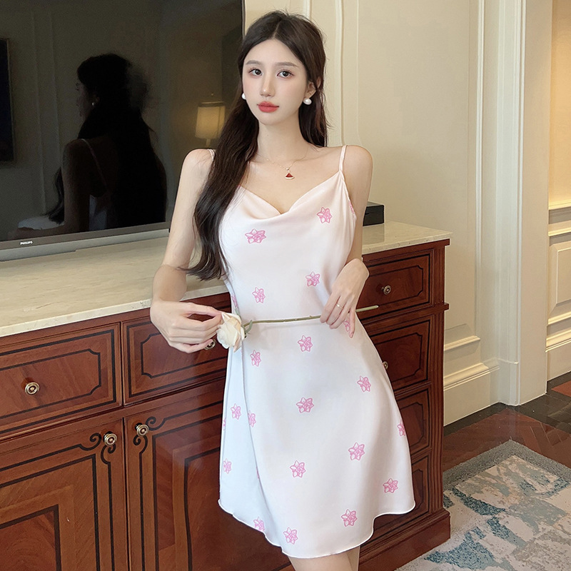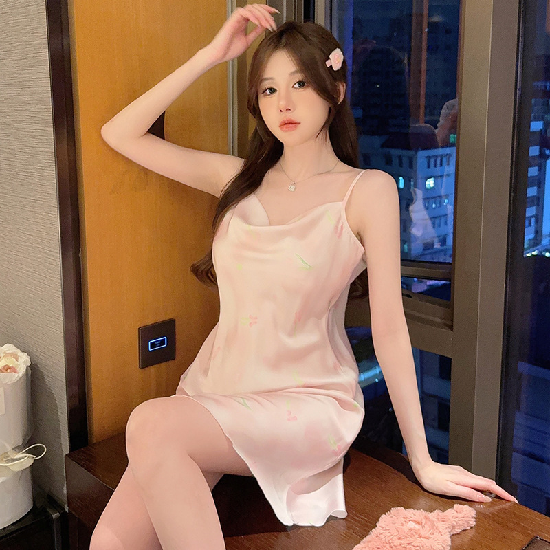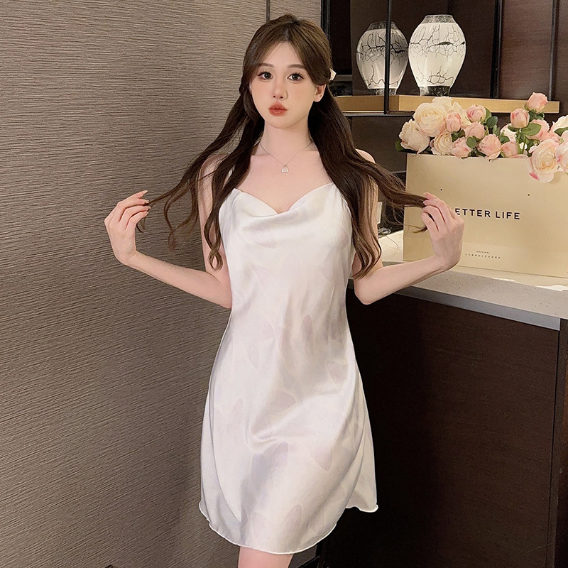 여성을위한 섹시한 잠옷 여름 2023 새로운 스윙 칼라 얼음 실크 서스펜더 잠옷 중간 길이 봄, 가을 작은 가슴 얇은 스타일