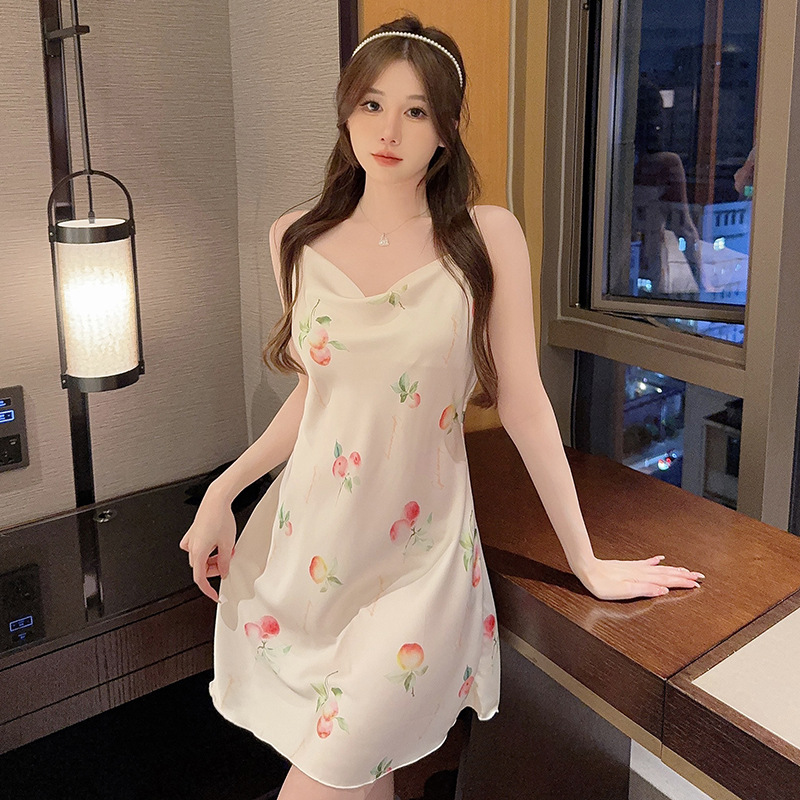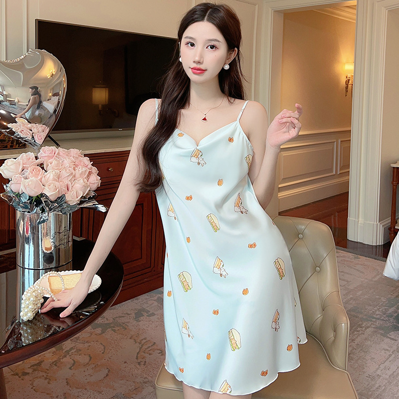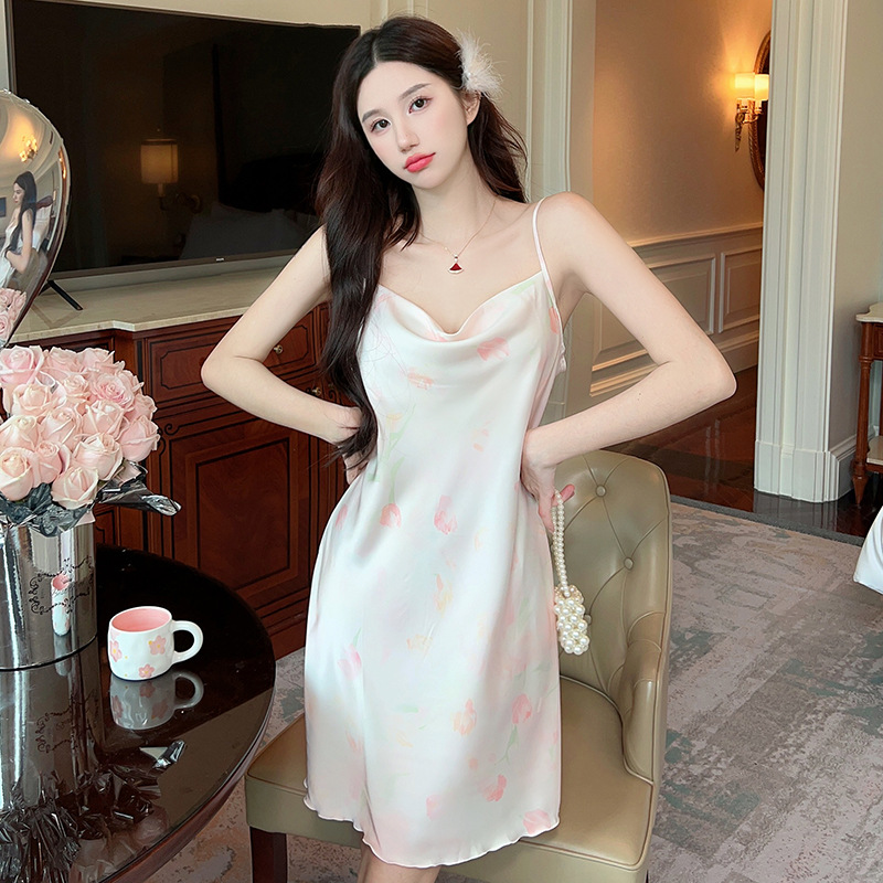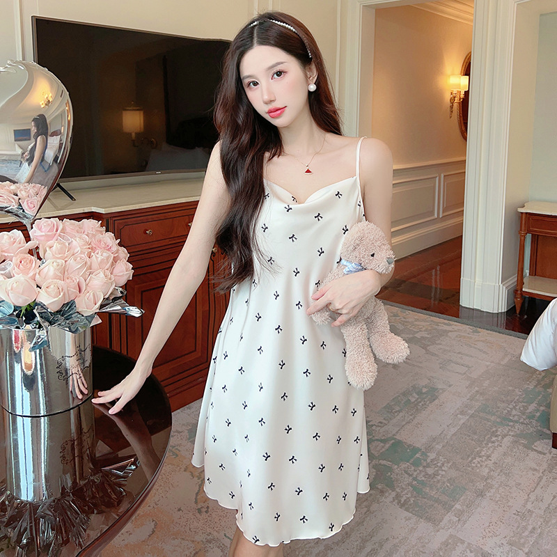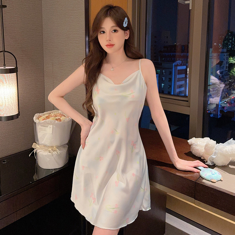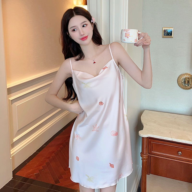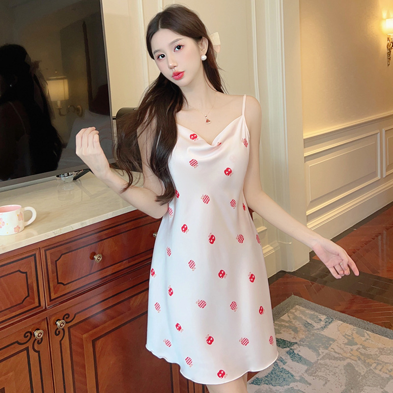 여성을위한 섹시한 잠옷 여름 2023 새로운 스윙 칼라 얼음 실크 서스펜더 잠옷 중간 길이 봄, 가을 작은 가슴 얇은 스타일
