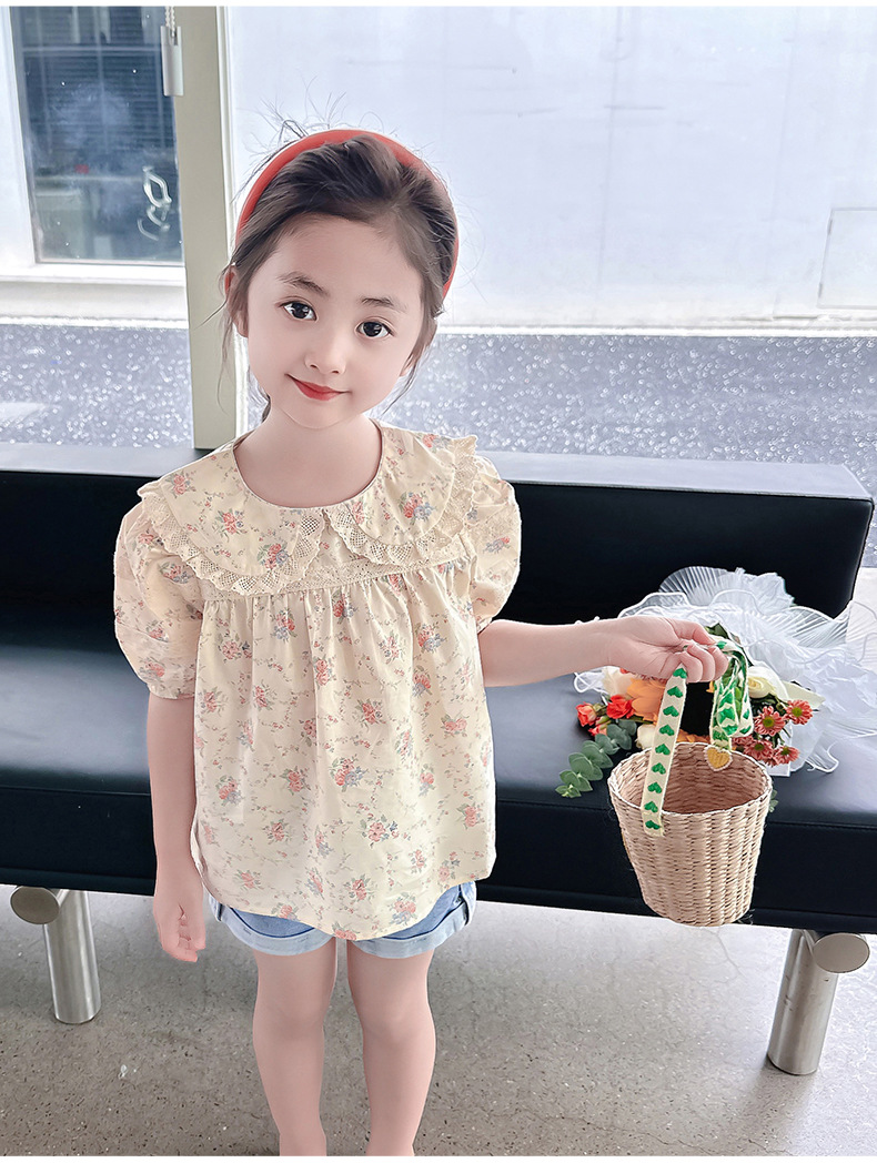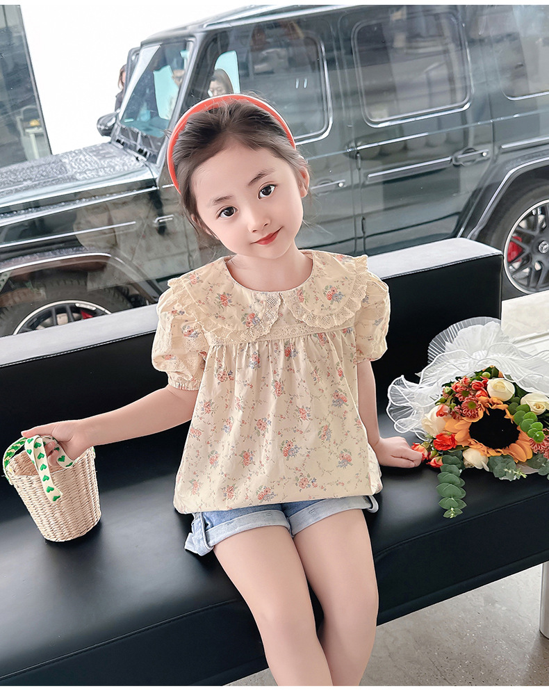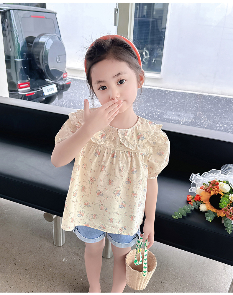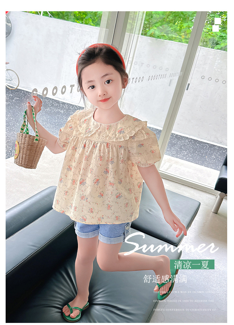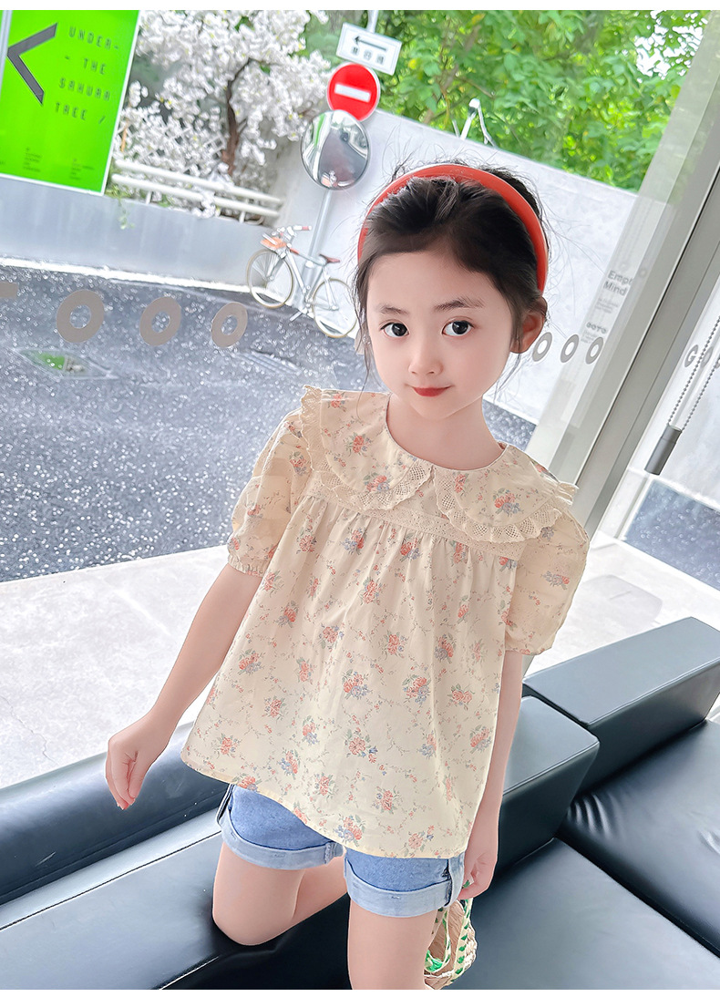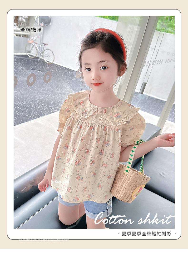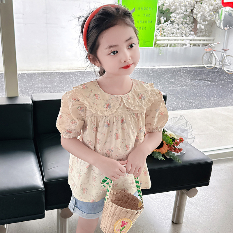 여아 여름 반팔 탑 코튼 셔츠 버튼 코튼 플로럴 스위트 레이스 한국식 유치원 인형 셔츠