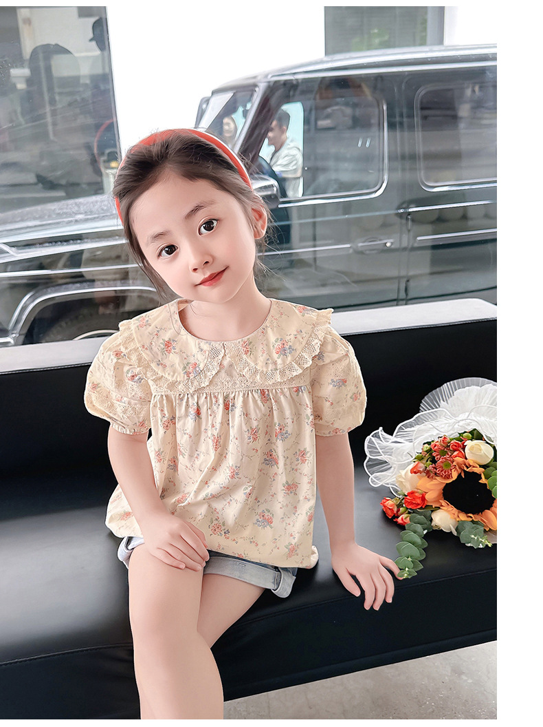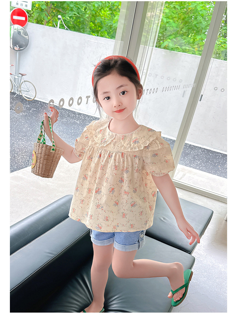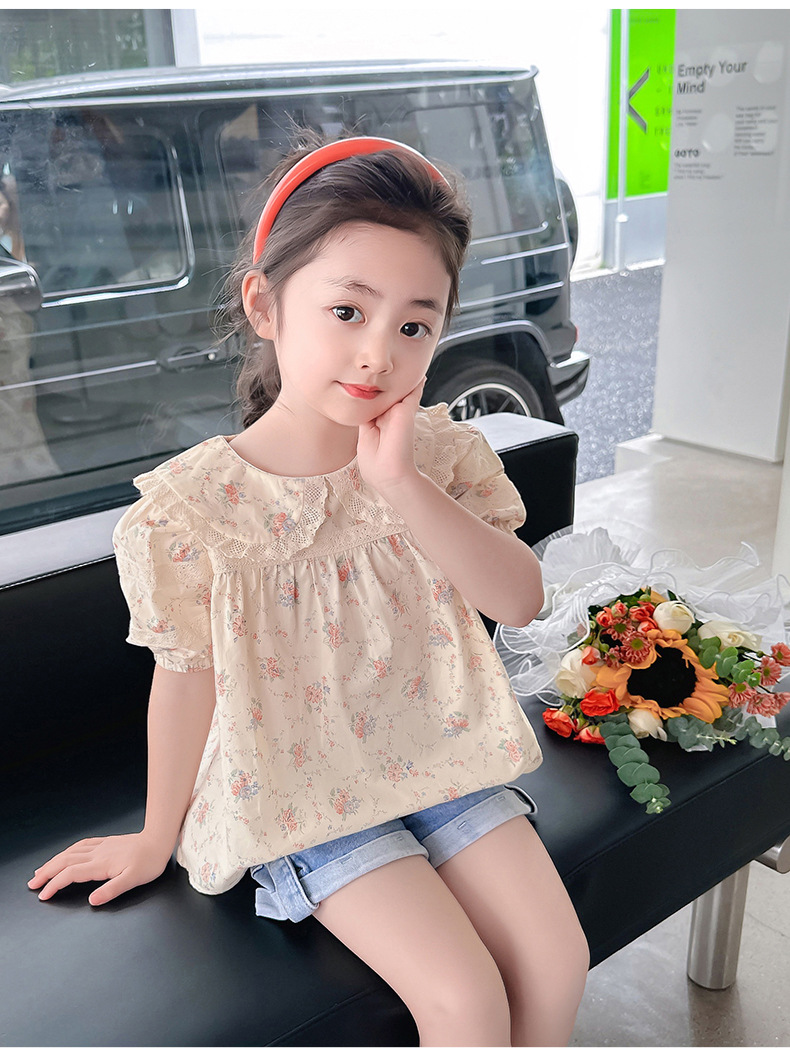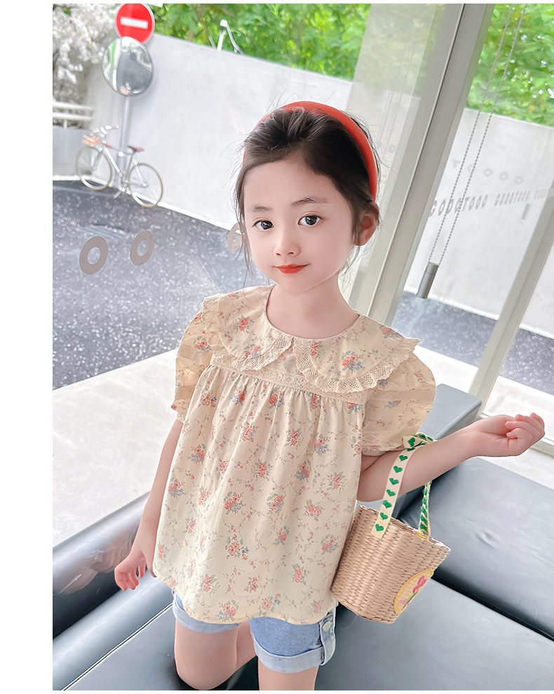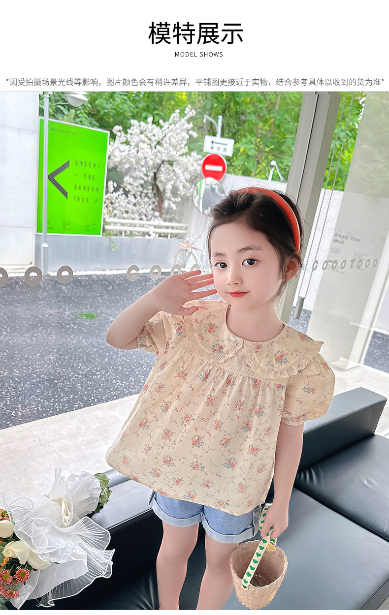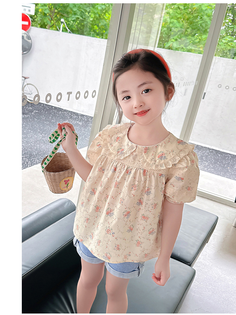 여아 여름 반팔 탑 코튼 셔츠 버튼 코튼 플로럴 스위트 레이스 한국식 유치원 인형 셔츠