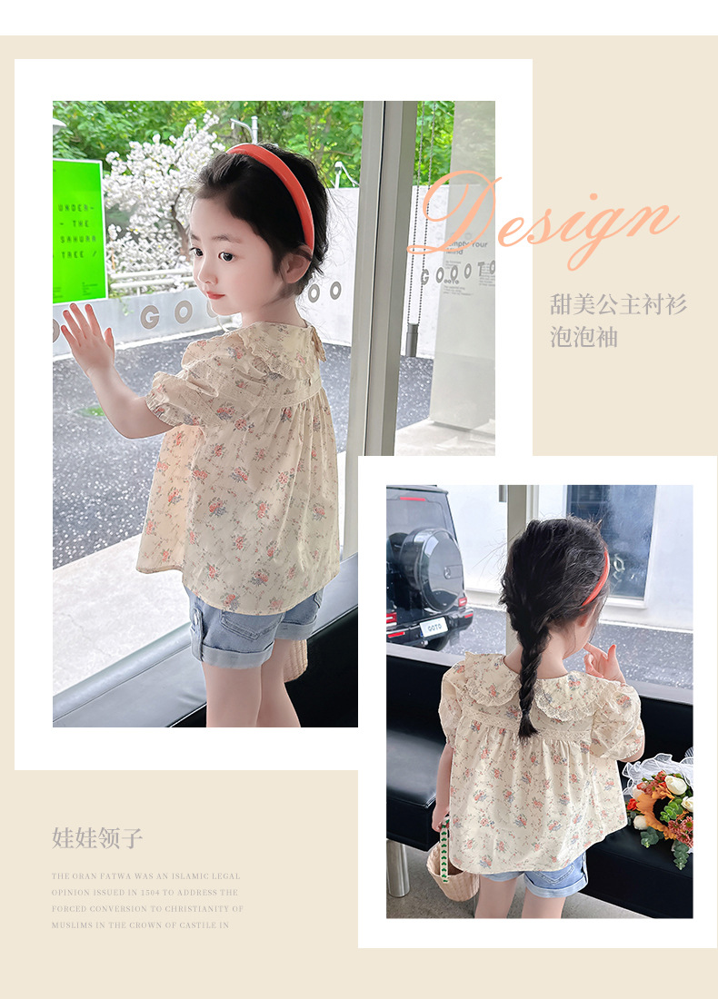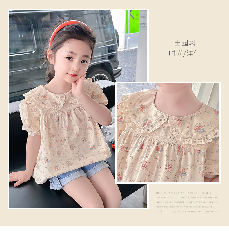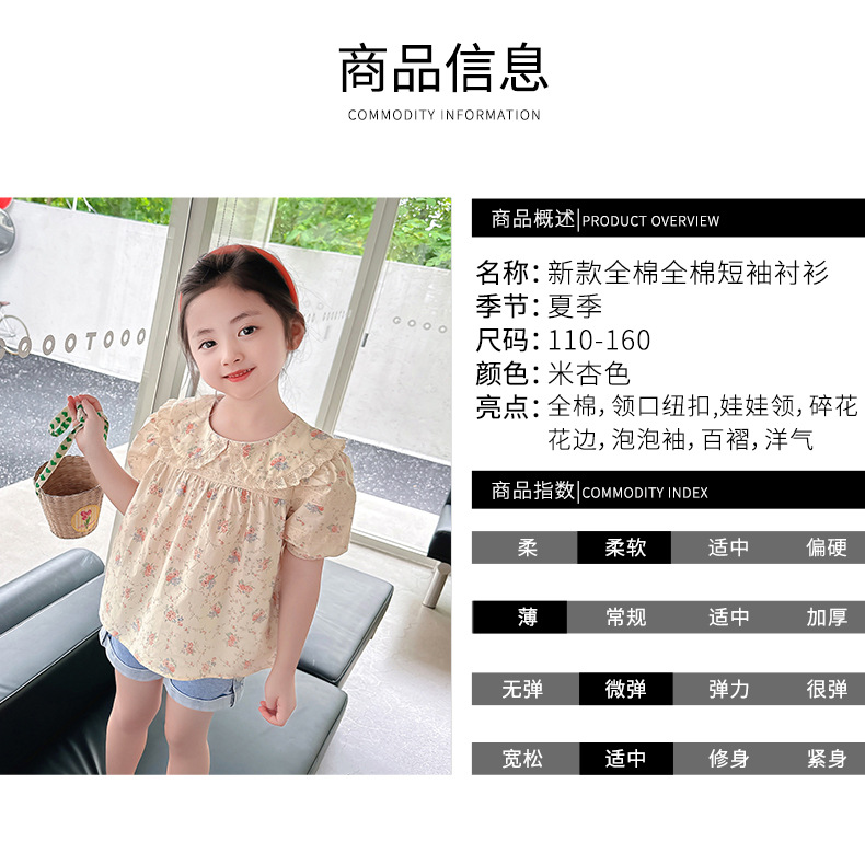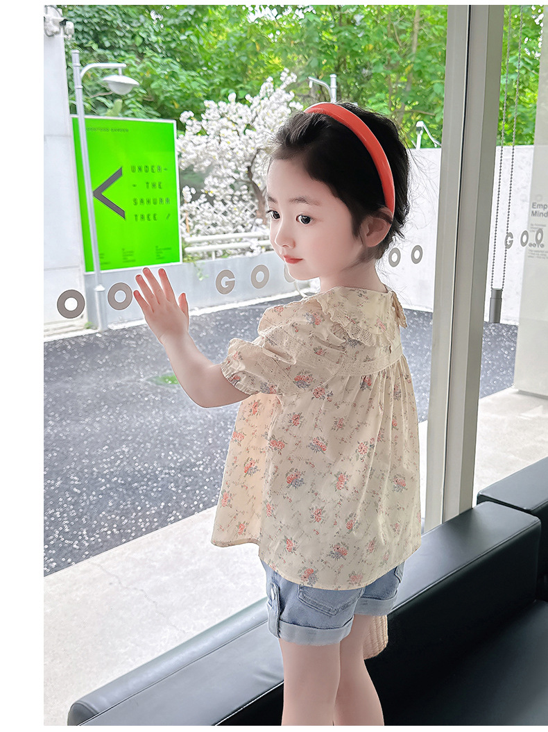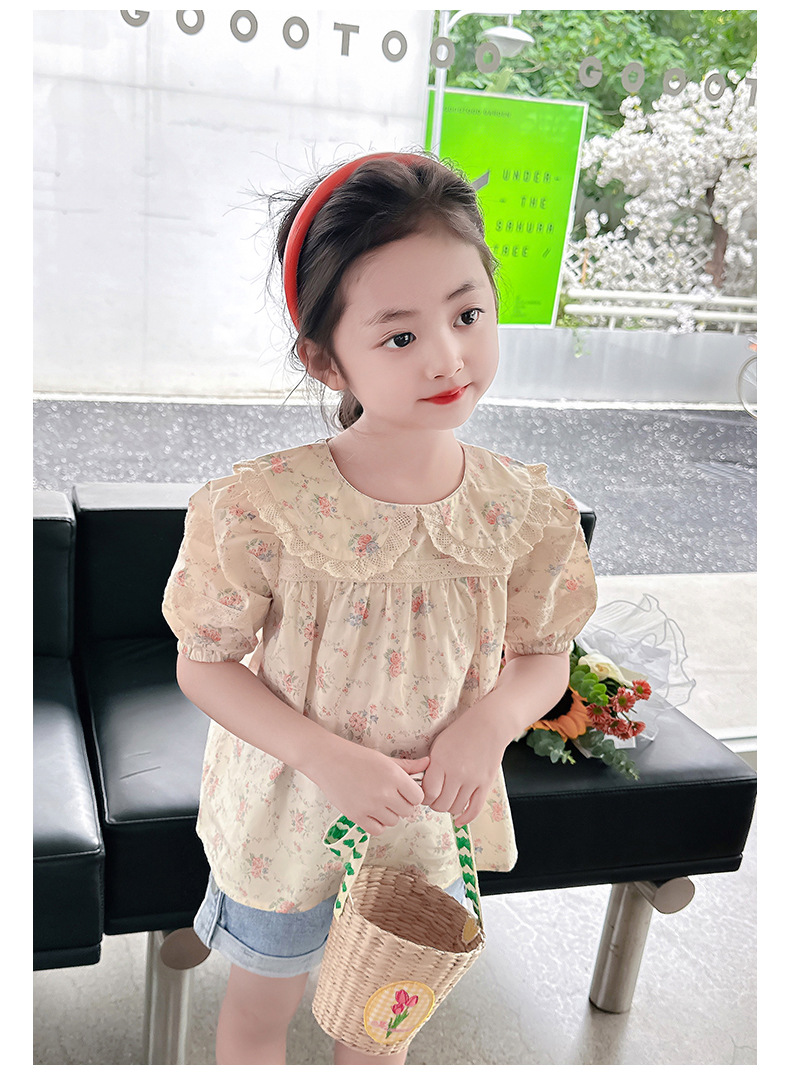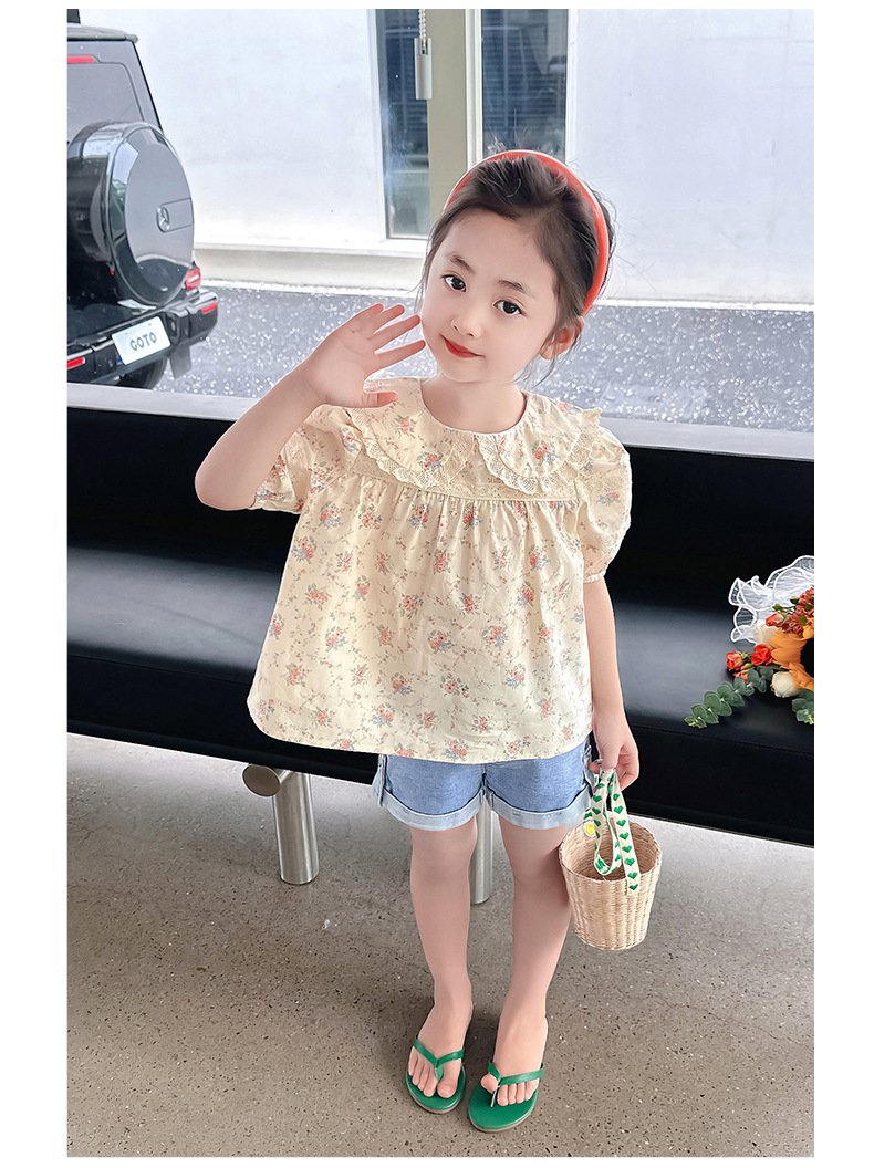 여아 여름 반팔 탑 코튼 셔츠 버튼 코튼 플로럴 스위트 레이스 한국식 유치원 인형 셔츠