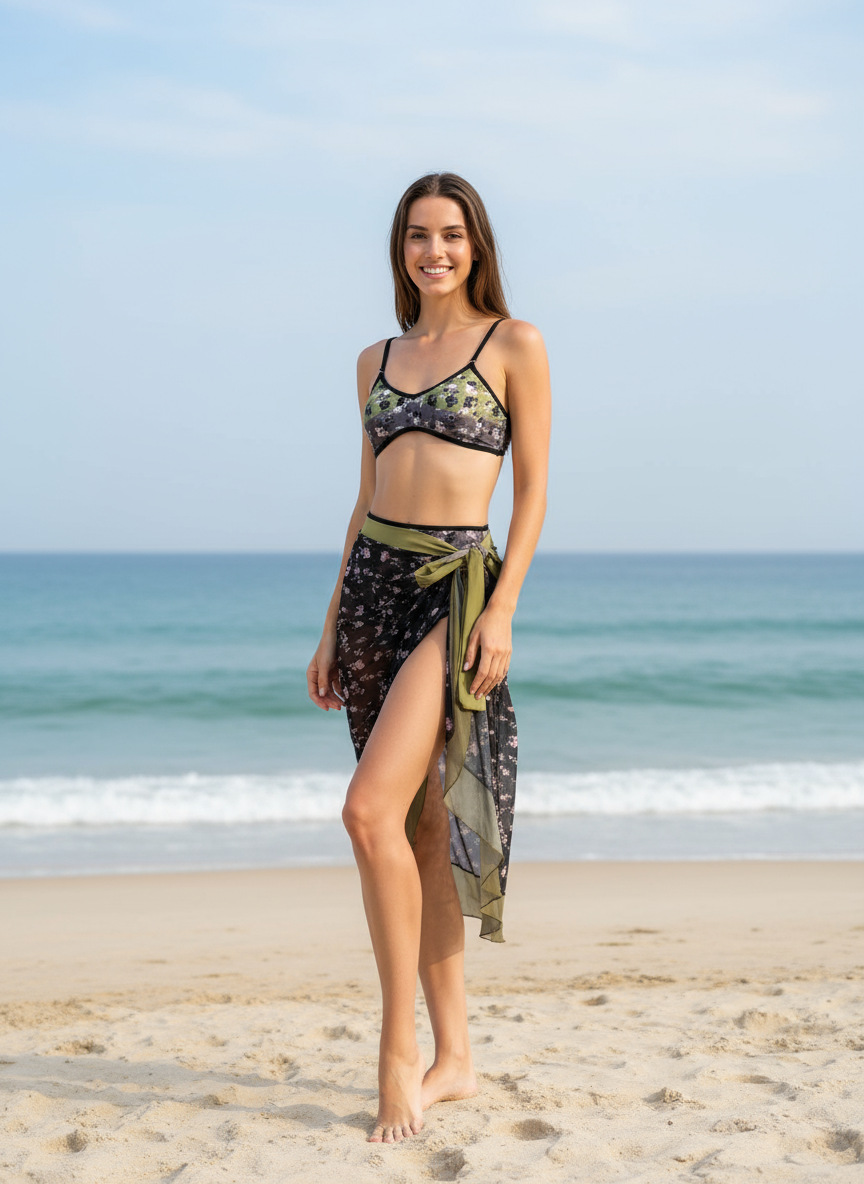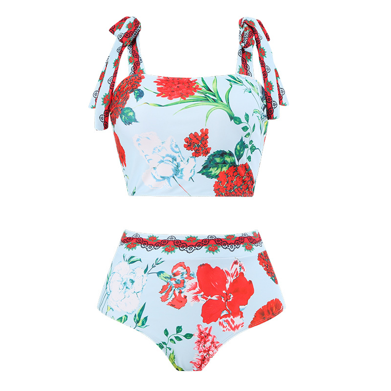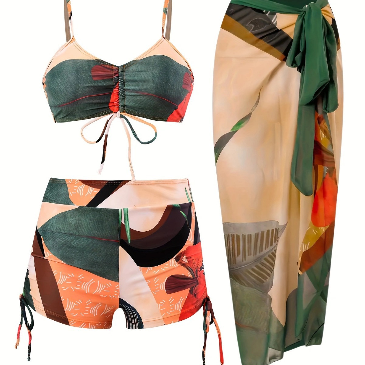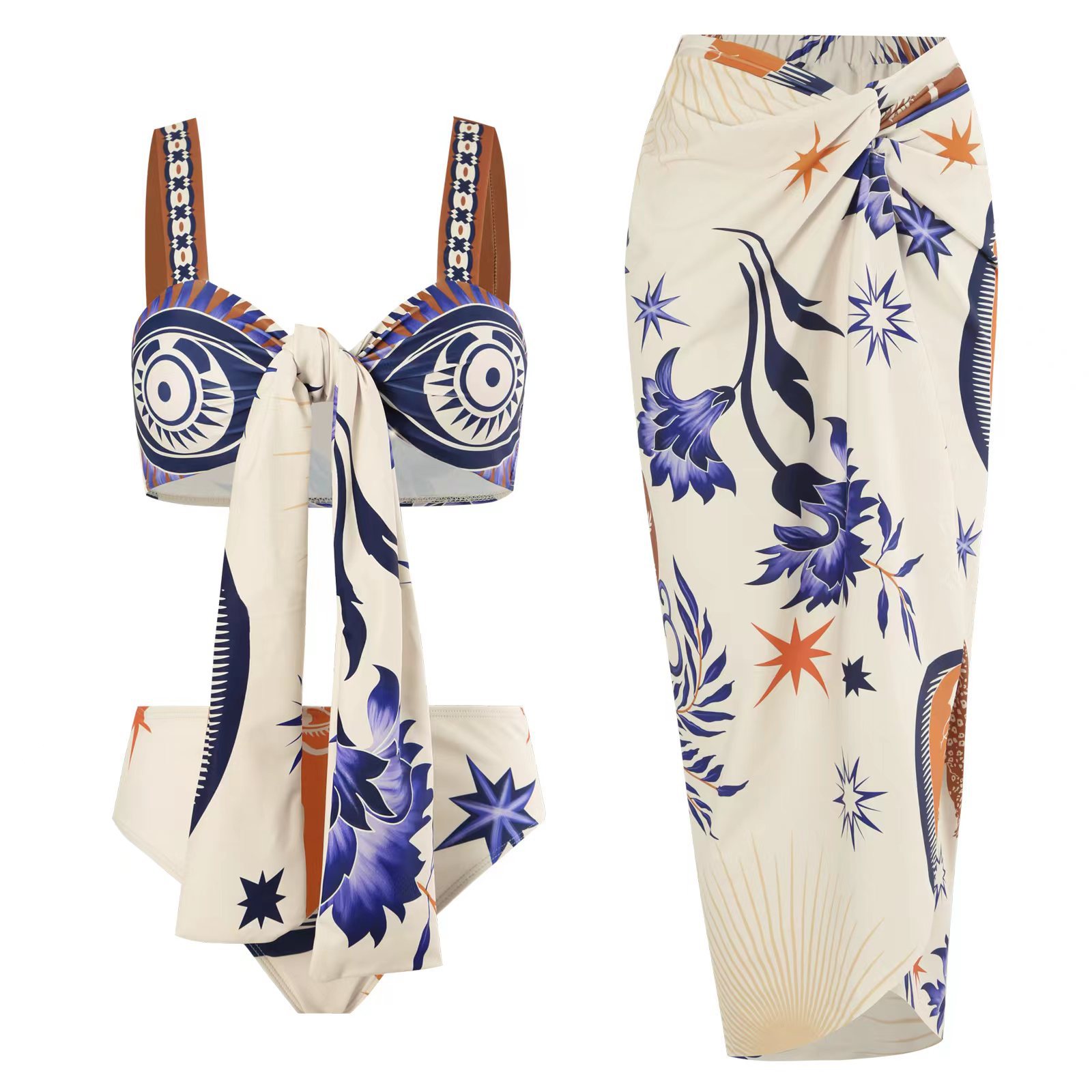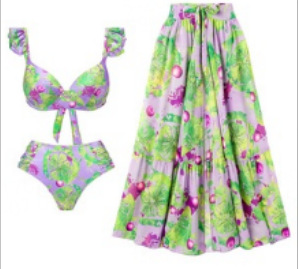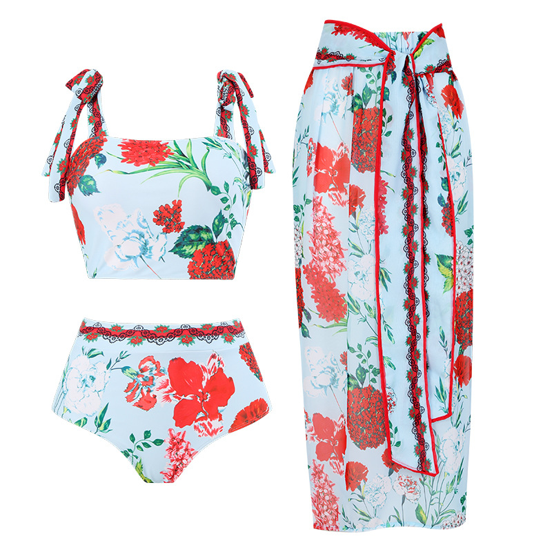 2025 새로운 레트로 하이 웨이스트 스플릿 3 피스 수영복 여성 유럽과 미국의 비키니 수영복 쉬폰 비치 스커트 세트