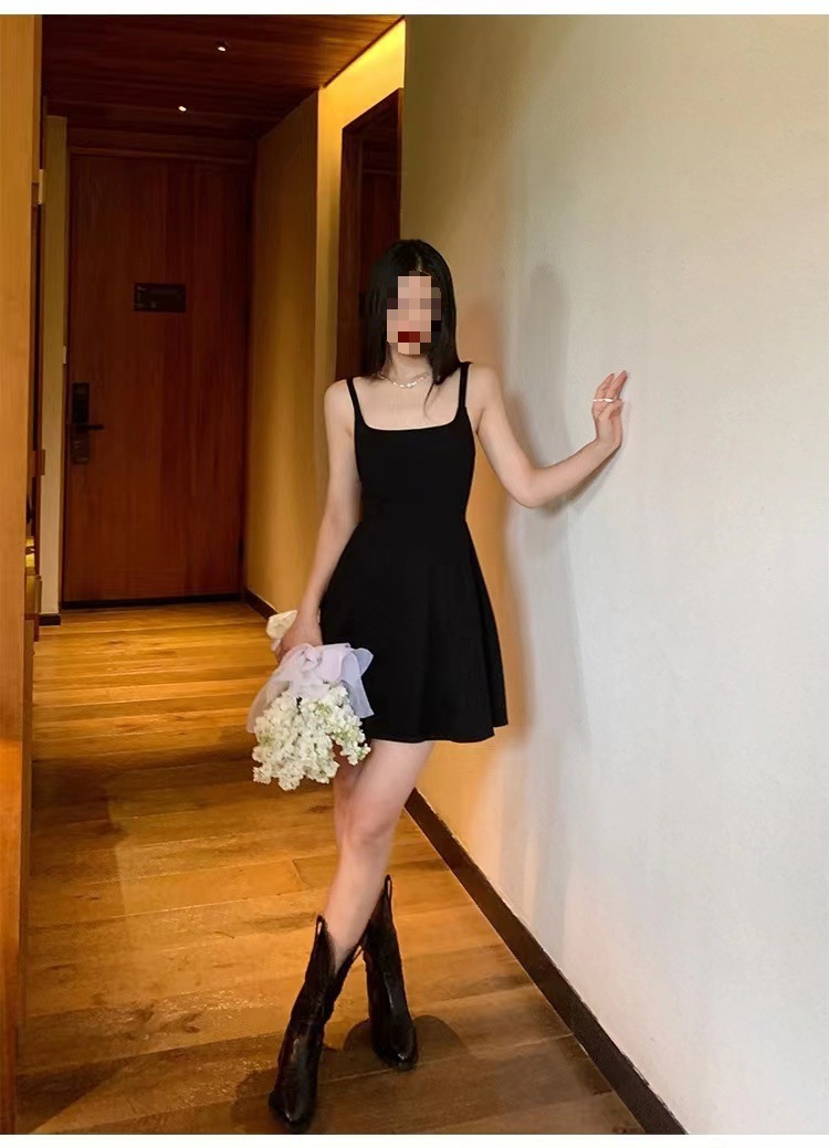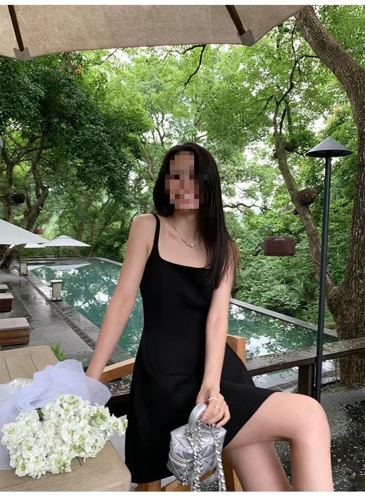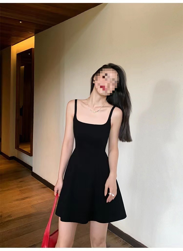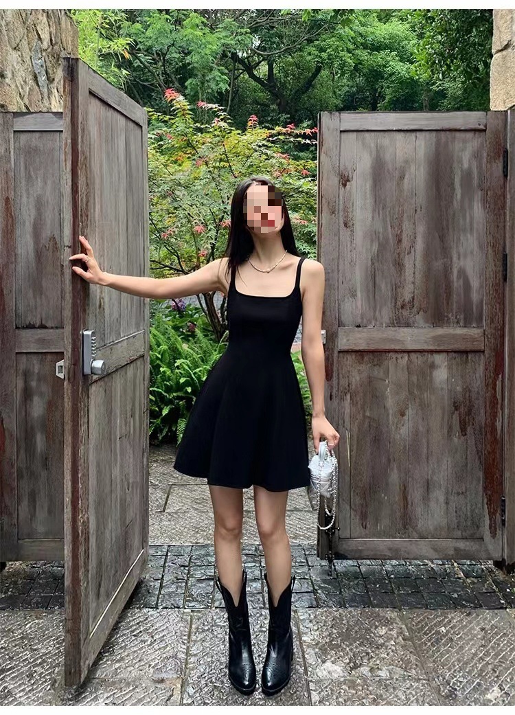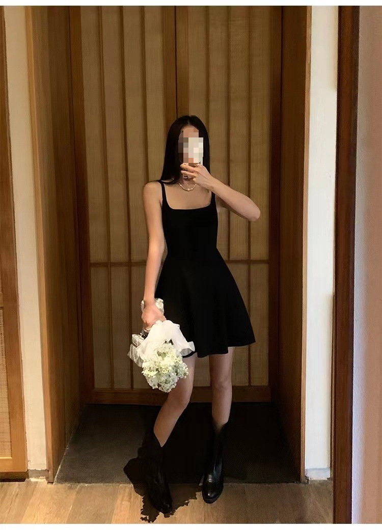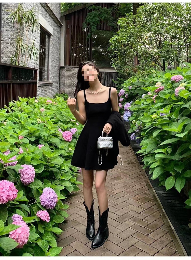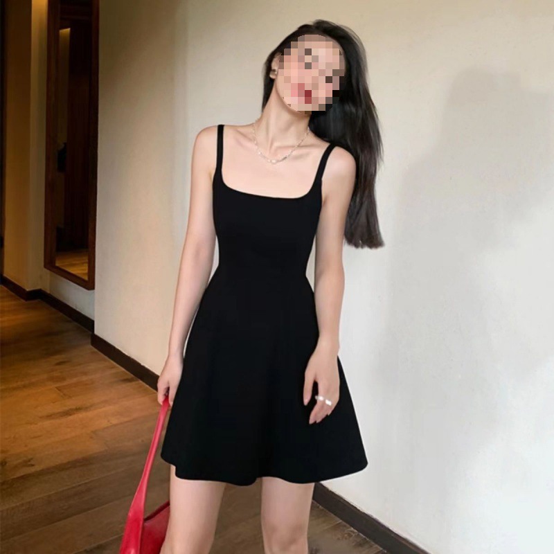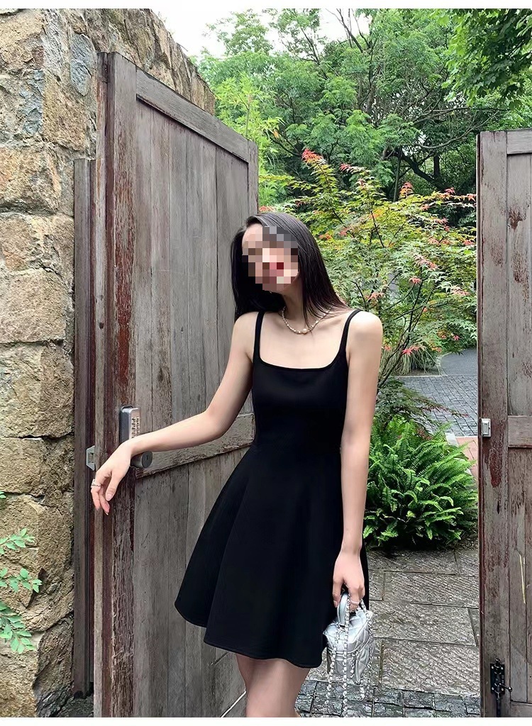블랙 슬링 원피스 여성 여름 2023 새로운 한국식 슬림 A 라인 스커트 고급 우아한 웨이스트 스커트
