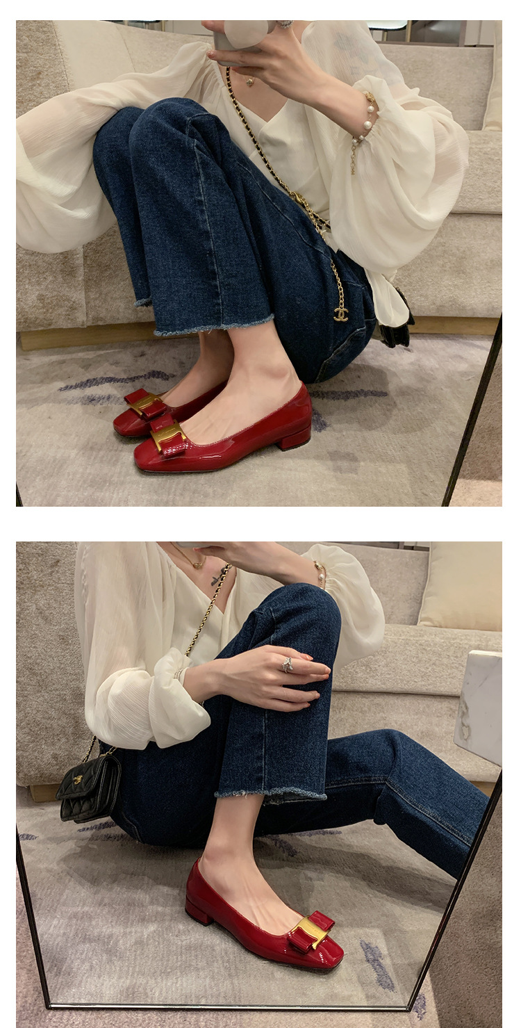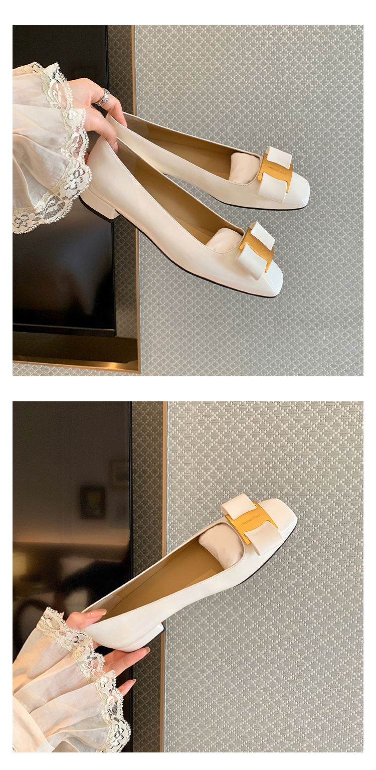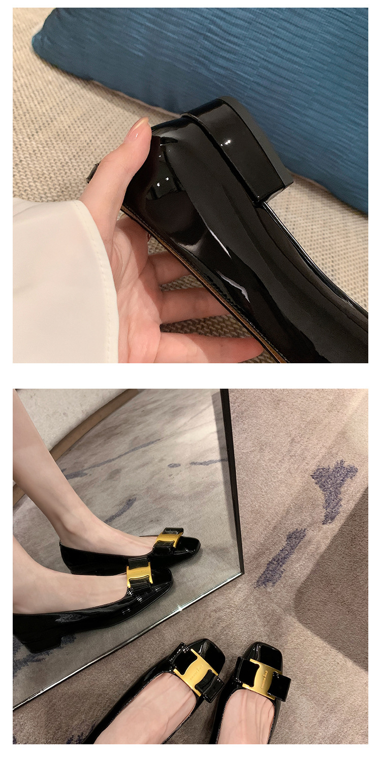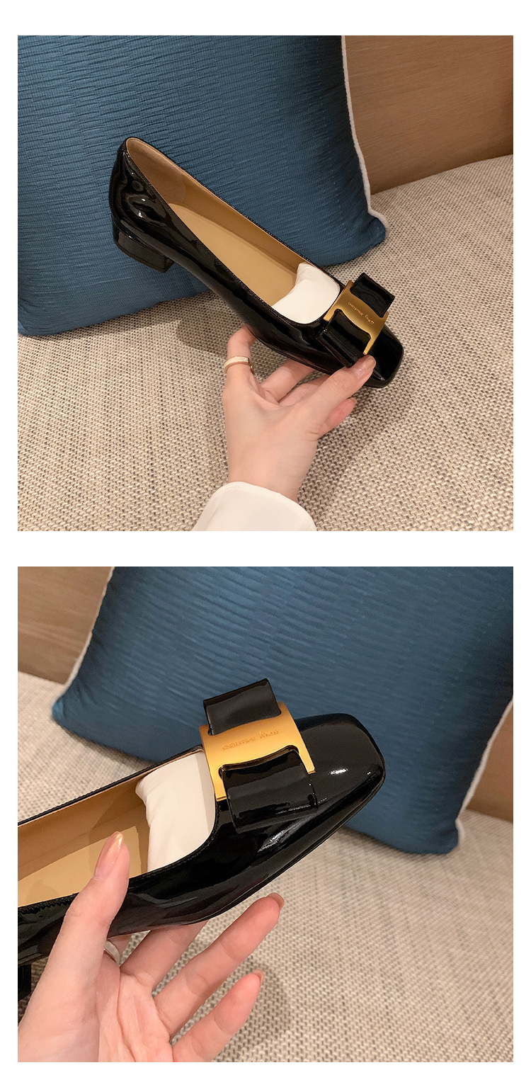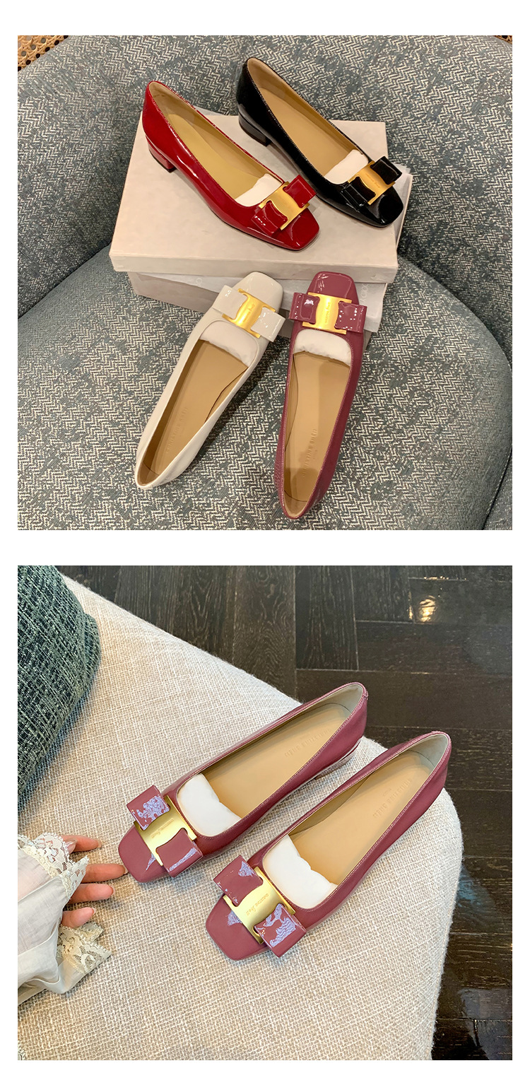 [Sheii Su Yinyin] 신임 감독 ~ 스퀘어 헤드 가죽 보우 골드 버튼 얕은 입 플랫 슈즈 여성 통근 신발
