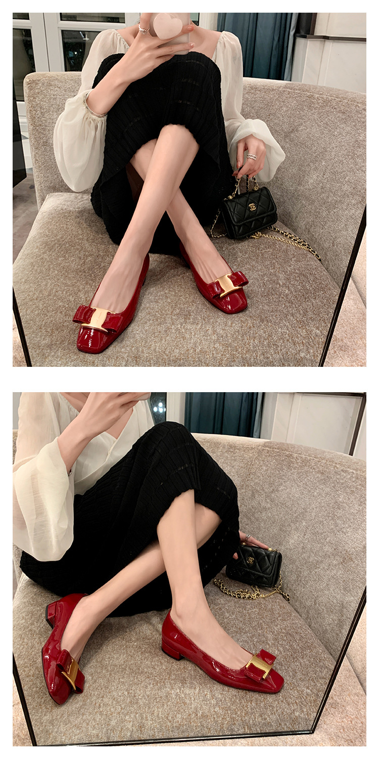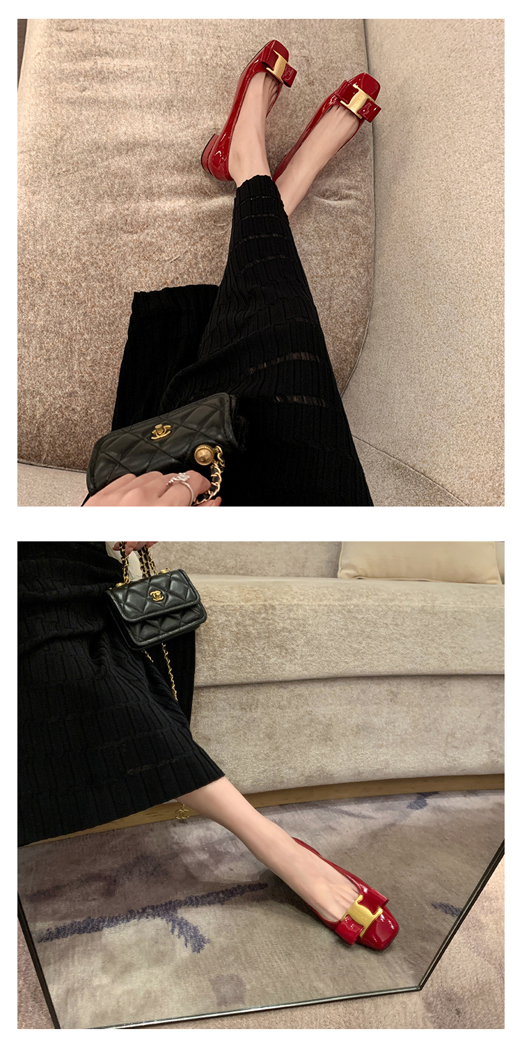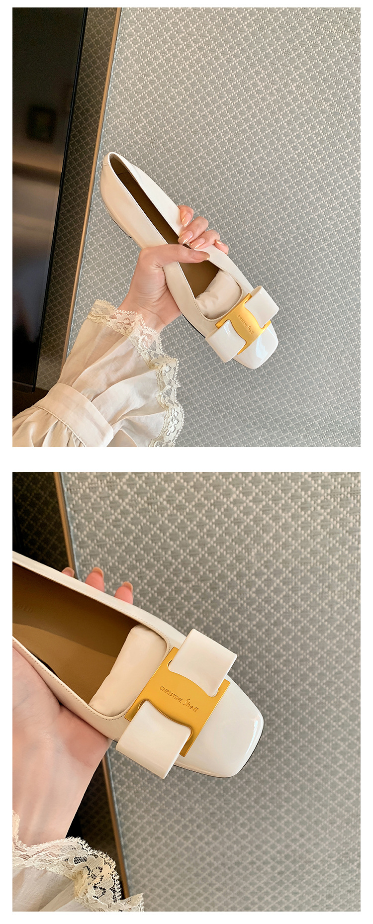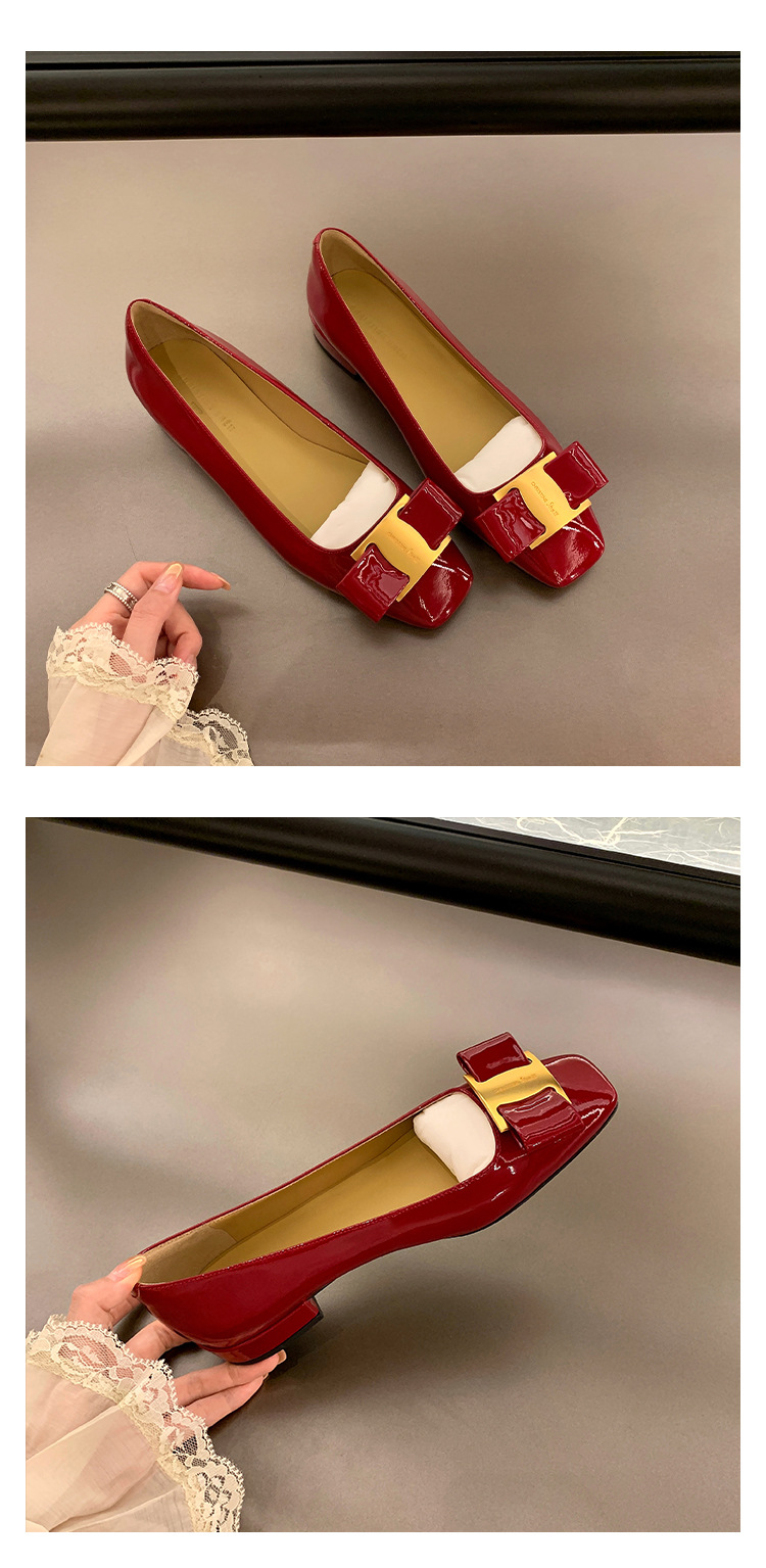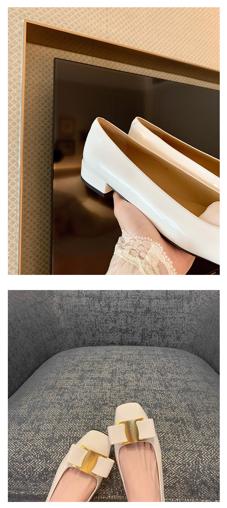 [Sheii Su Yinyin] 신임 감독 ~ 스퀘어 헤드 가죽 보우 골드 버튼 얕은 입 플랫 슈즈 여성 통근 신발